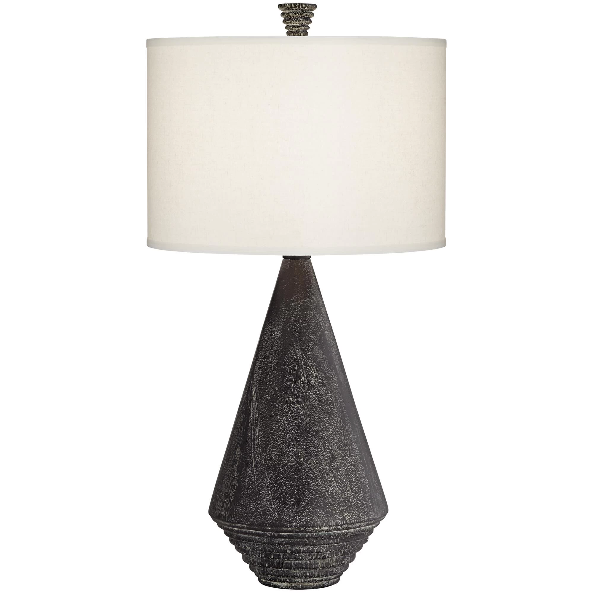 This contemporary table lamp has a geometric pyramid shape body and sleek black finish with a grey wash. The body is constructed of resin and this lamp is topped with a white cotton and linen blend drum shade. This table lamp also has a pyramid finial that matches the design of the body.