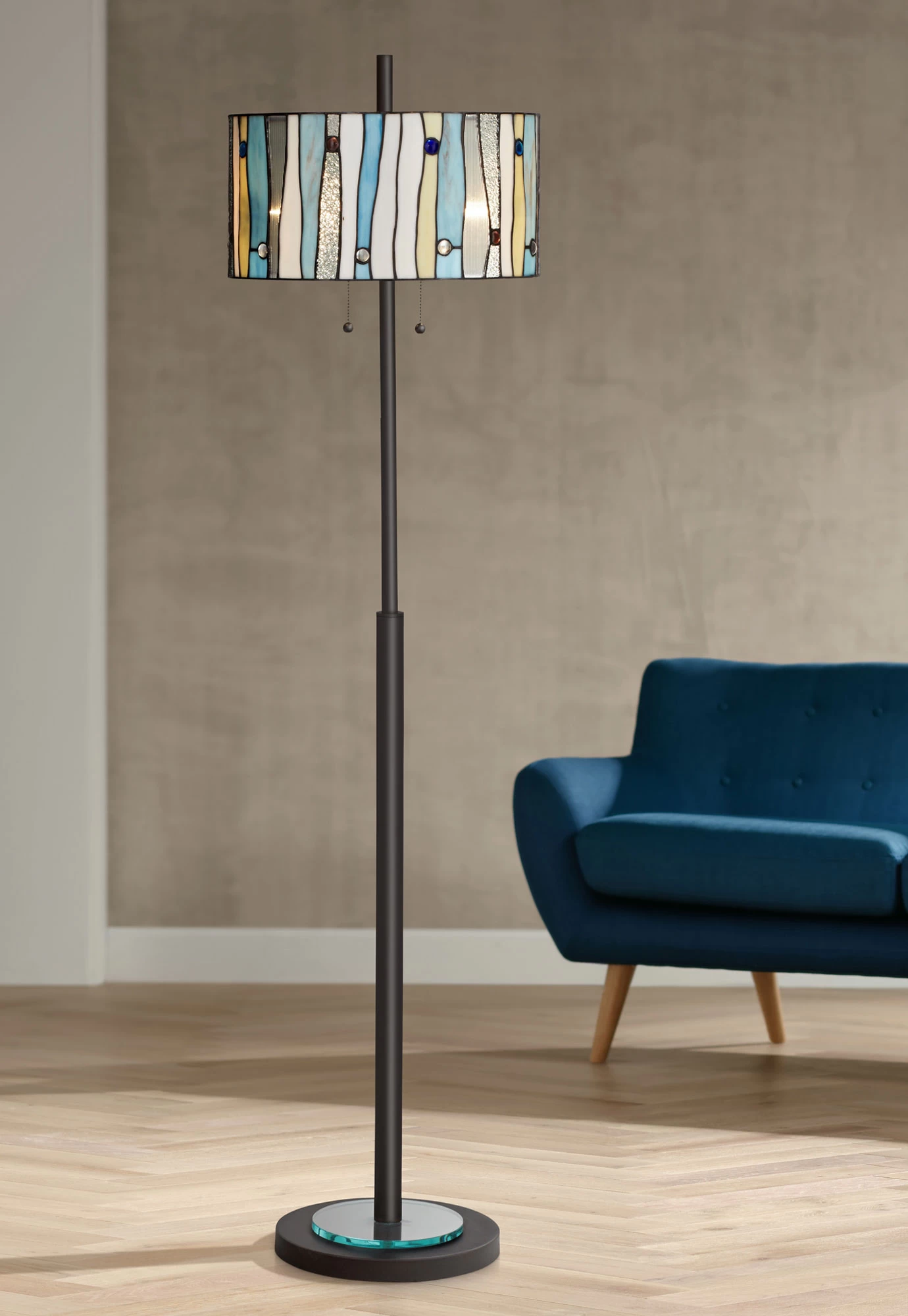 The artful Appalachian Spirit Floor Lamp is a modern update on the classic Tiffany-style lamp. A multicolor stained glass shade with two on/off pull chains tops a minimalist dark bronze finished base.