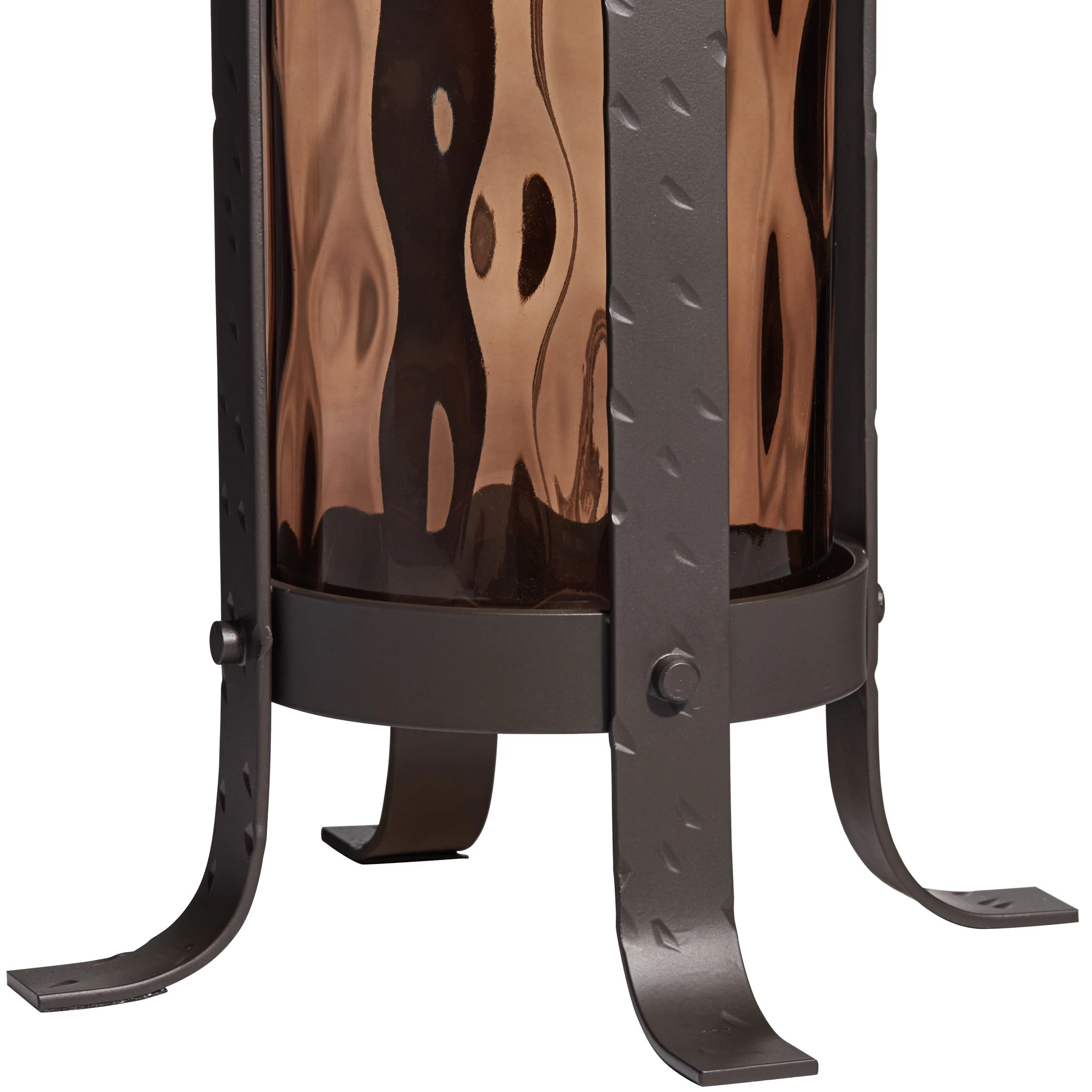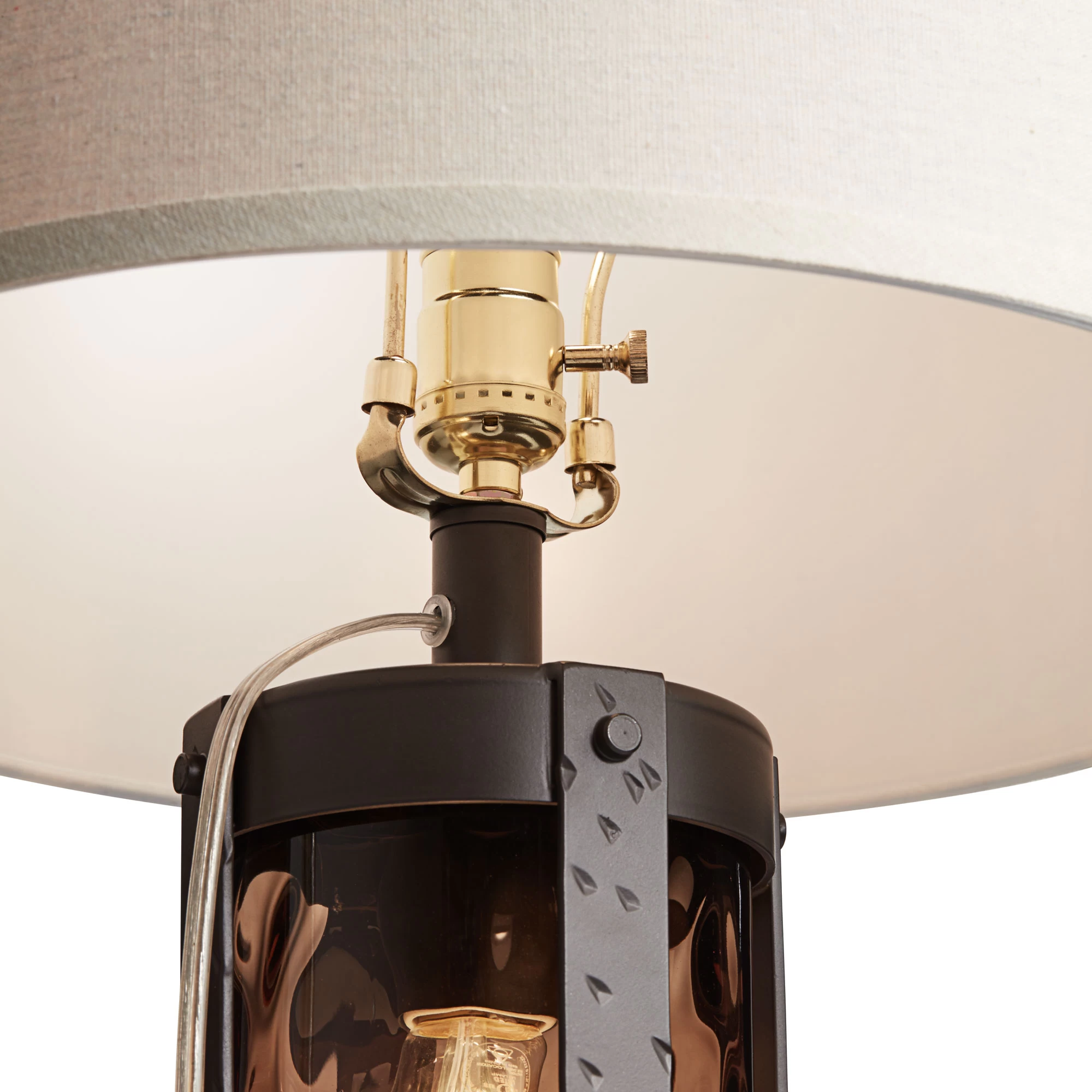 The Ashford Table Lamp offers a decorative bronze finished frame with eye-catching flared feet. The frame surrounds a textured amber glass cylinder housing an internal nightlight. A linen drum shade over the main lamp provides soft, diffused illumination.