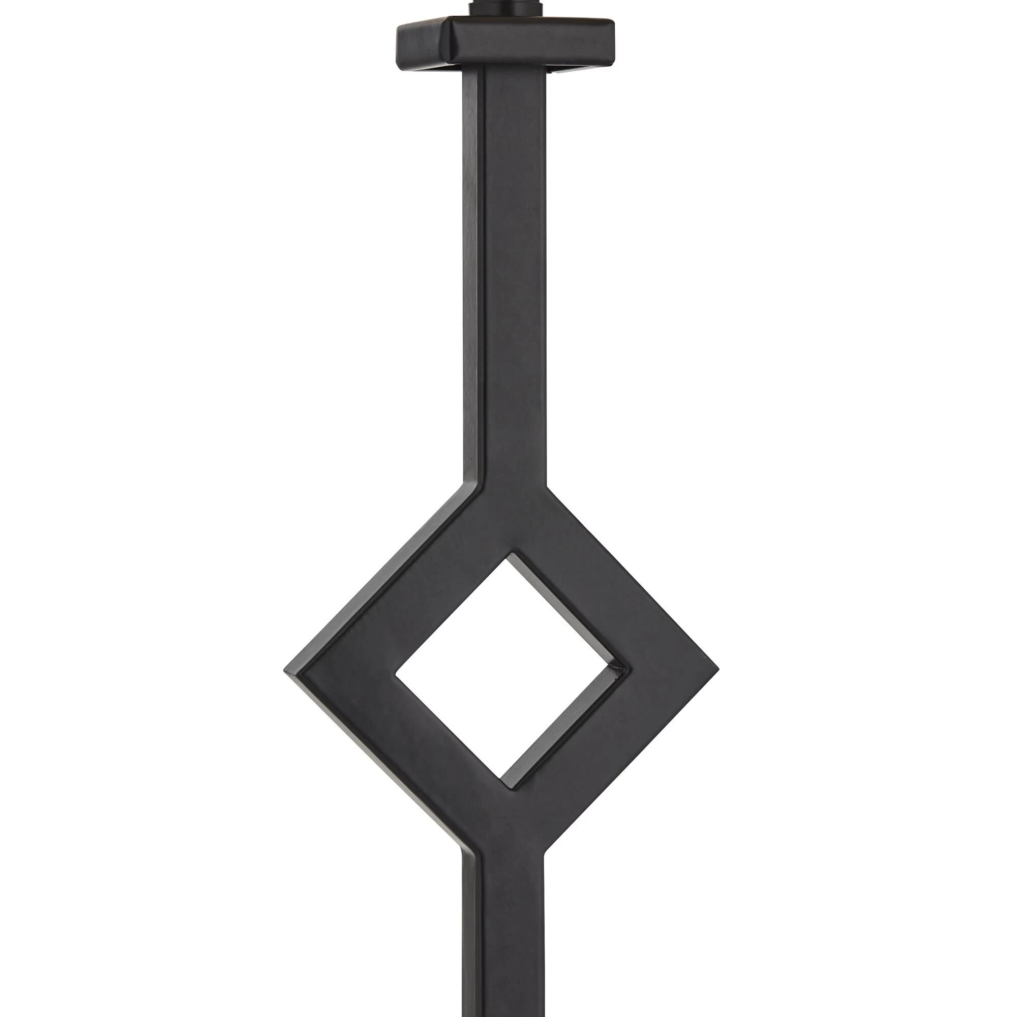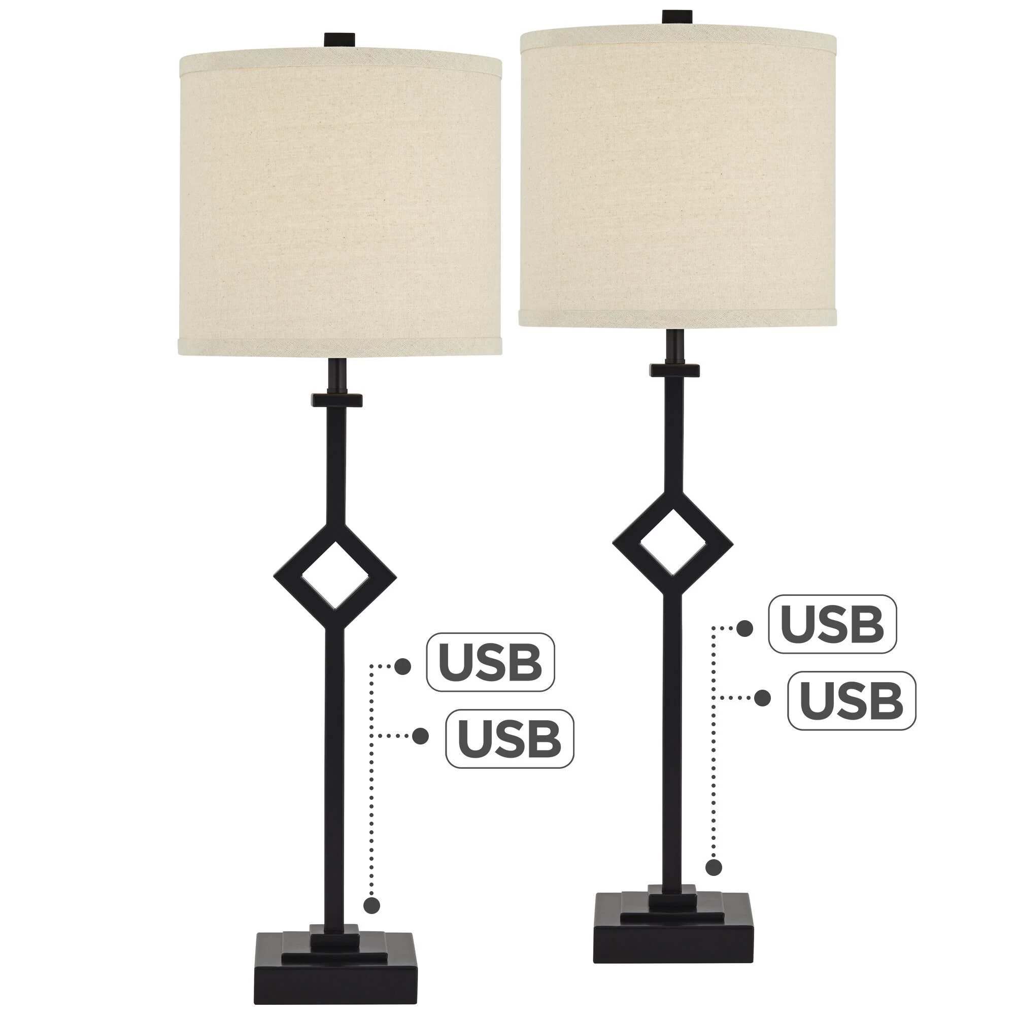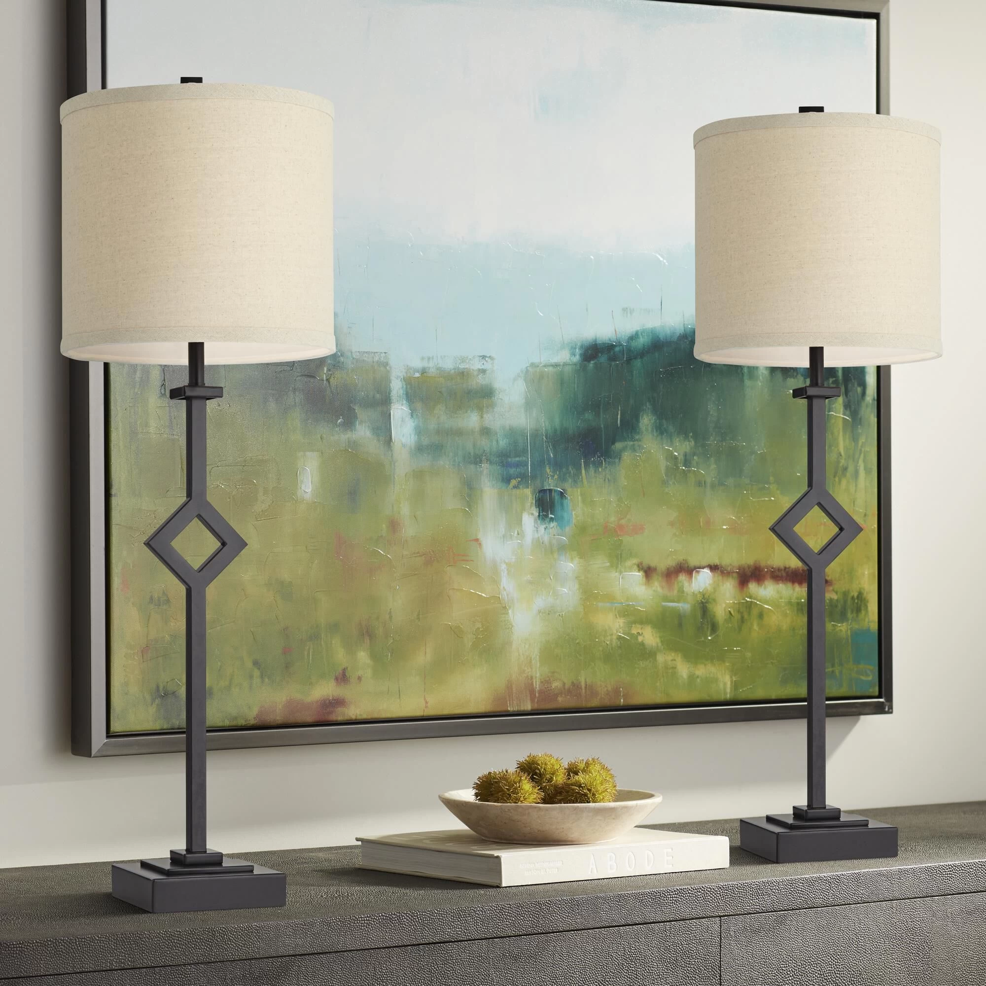 Open diamonds pair with a black finish to bring impeccable style to this set of two metal table lamps. The matched set is perfect for a coordinated look, and each is topped with a neutral drum shade for excellent light diffusion. Square, stacked bases add to the geometric flair of the set, perfect for a transitional or southwestern motif.