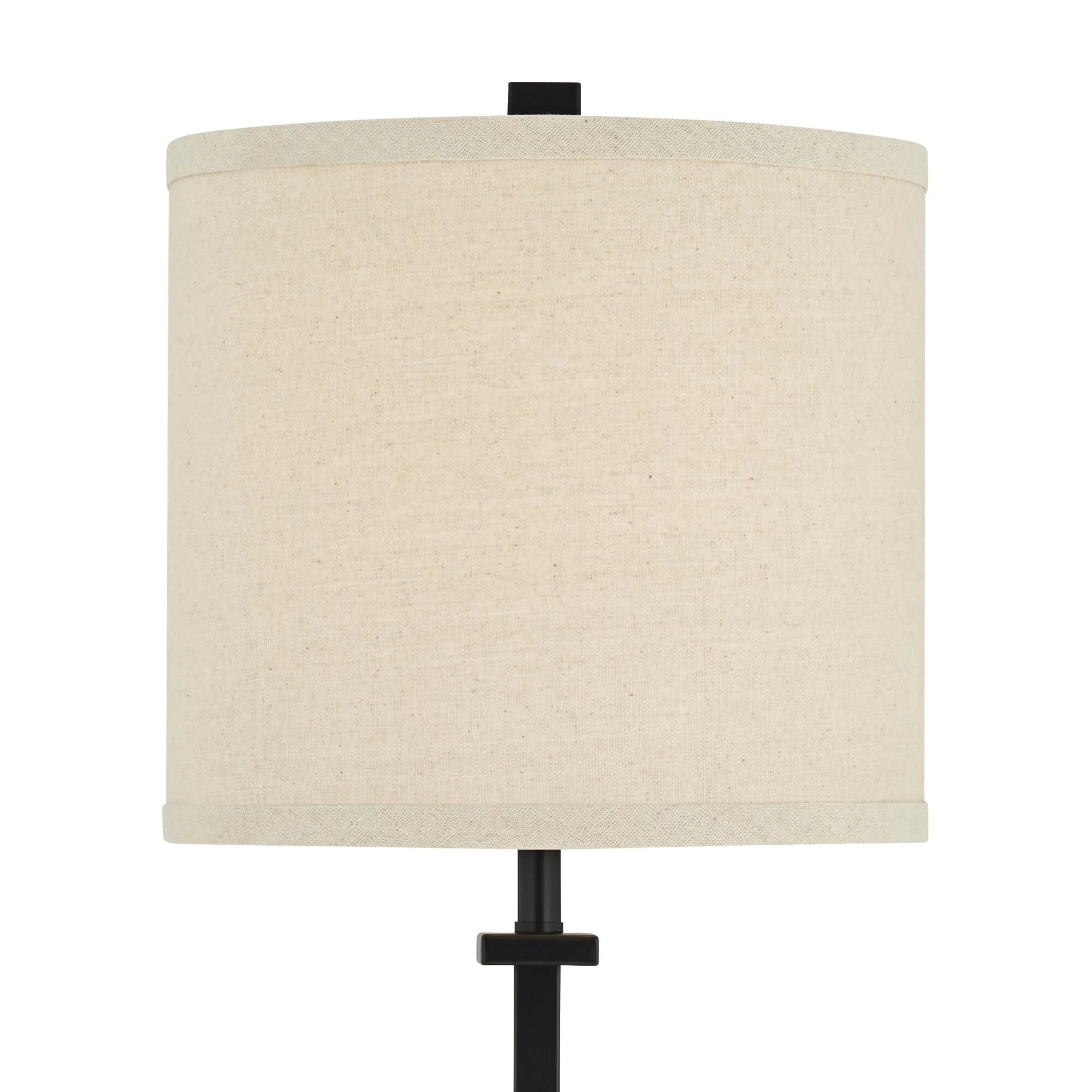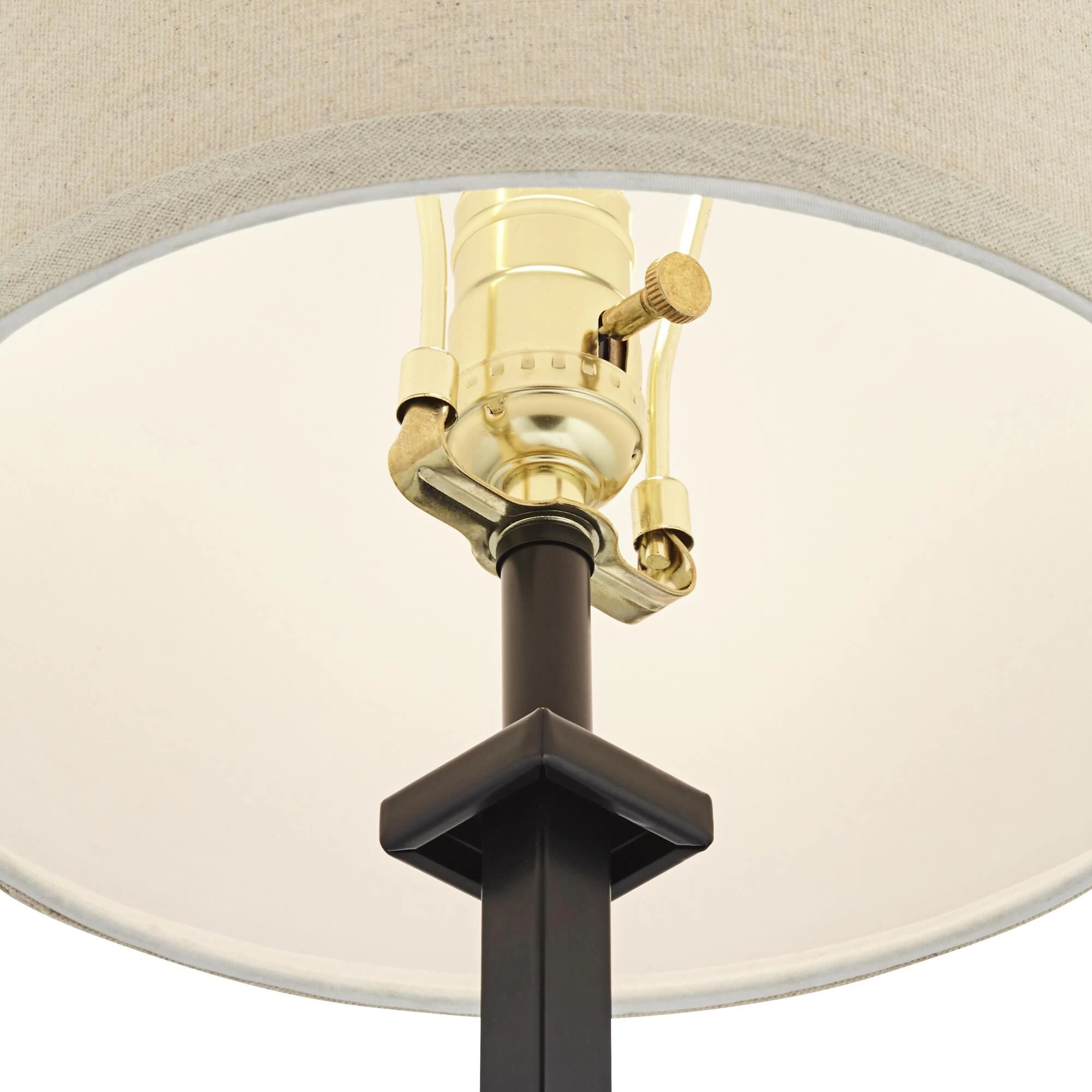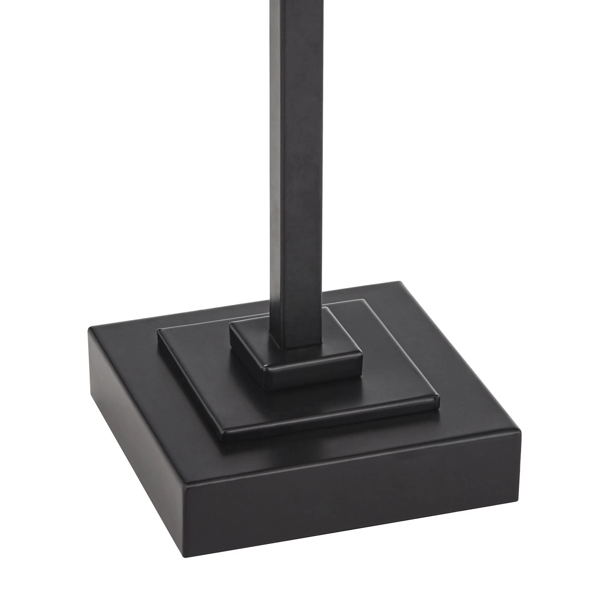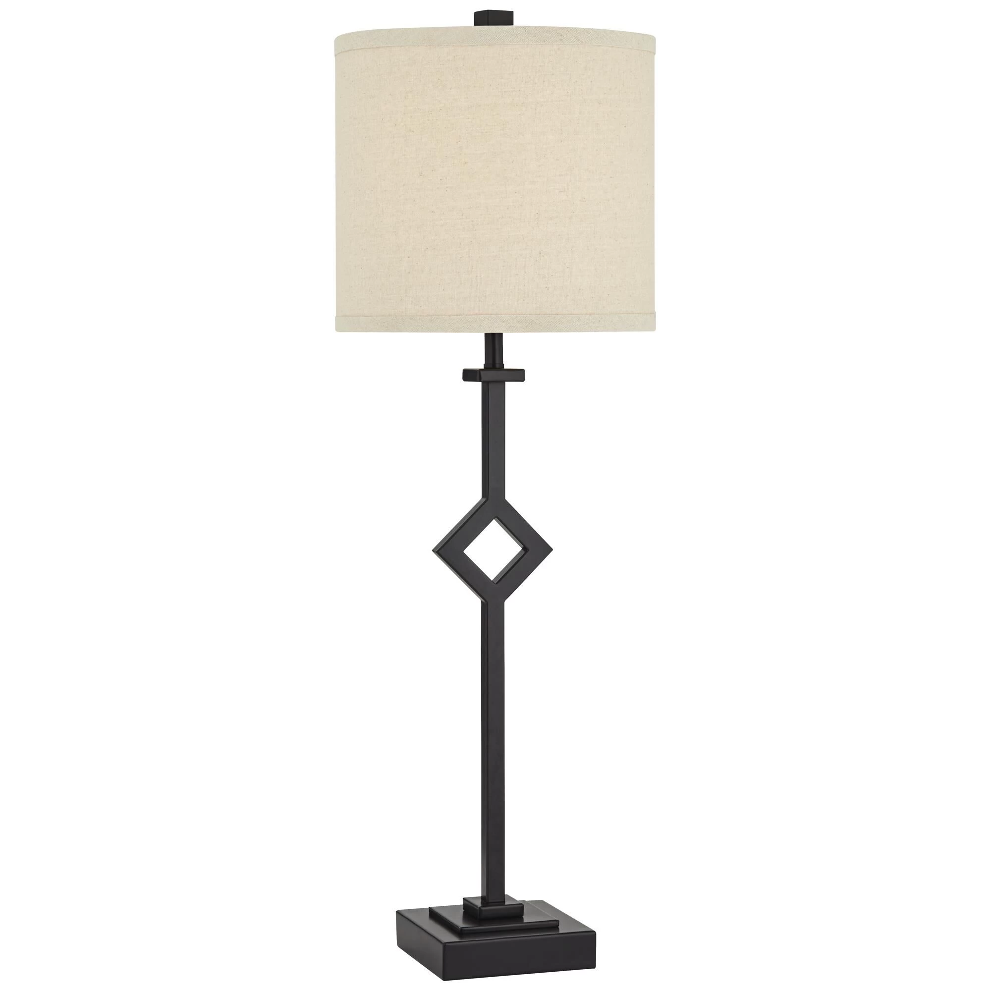 Open diamonds pair with a black finish to bring impeccable style to this set of two metal table lamps. The matched set is perfect for a coordinated look, and each is topped with a neutral drum shade for excellent light diffusion. Square, stacked bases add to the geometric flair of the set, perfect for a transitional or southwestern motif.