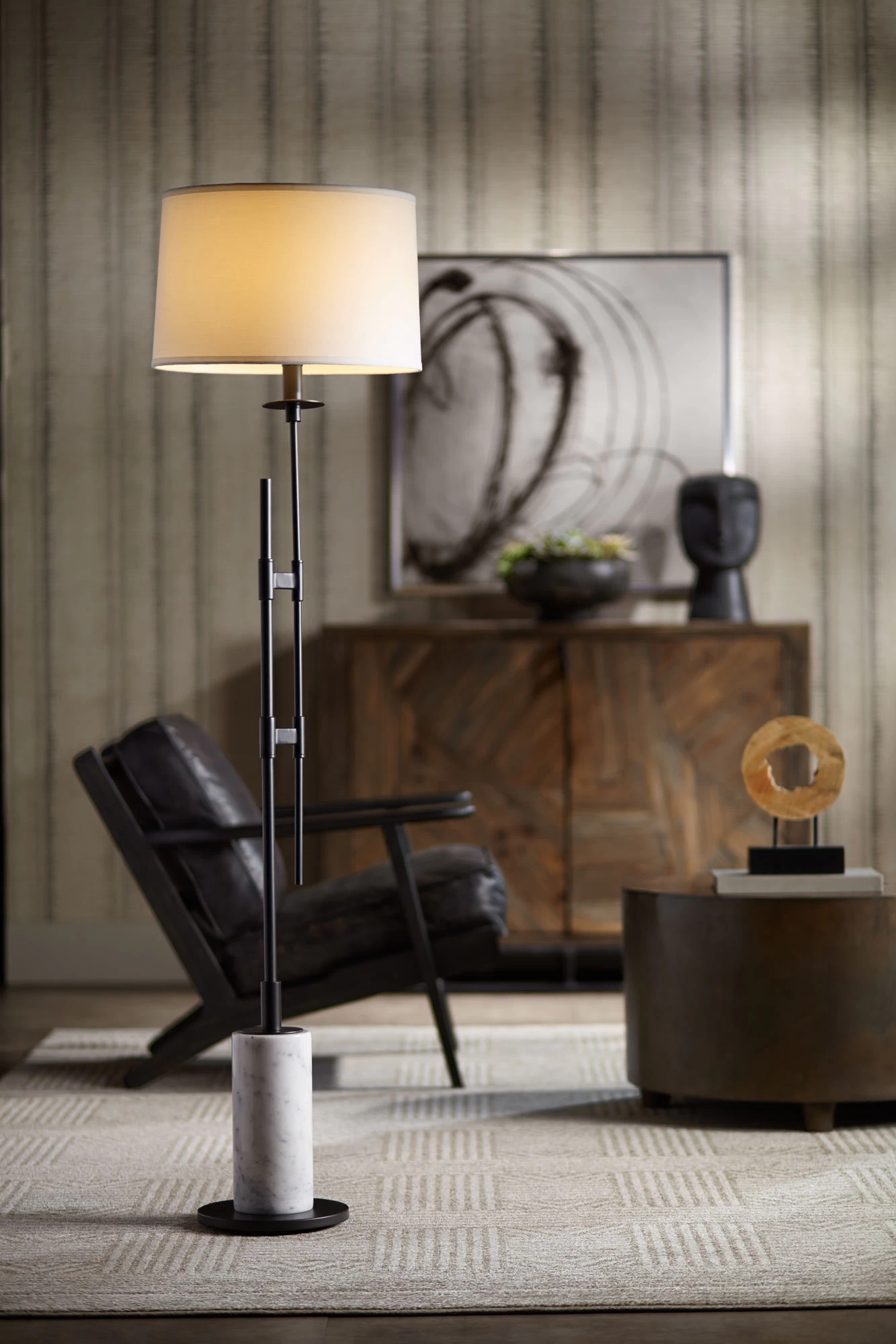Smooth, sleek, and endlessly chic, the Blackstone Floor Lamp brims with modern elegance. The white linen shade and white marble base are joined by metal posts in a dark Gun Metal grey finish. Brackets connecting the two posts add a contemporary, industrial feel. On/off switch on socket.