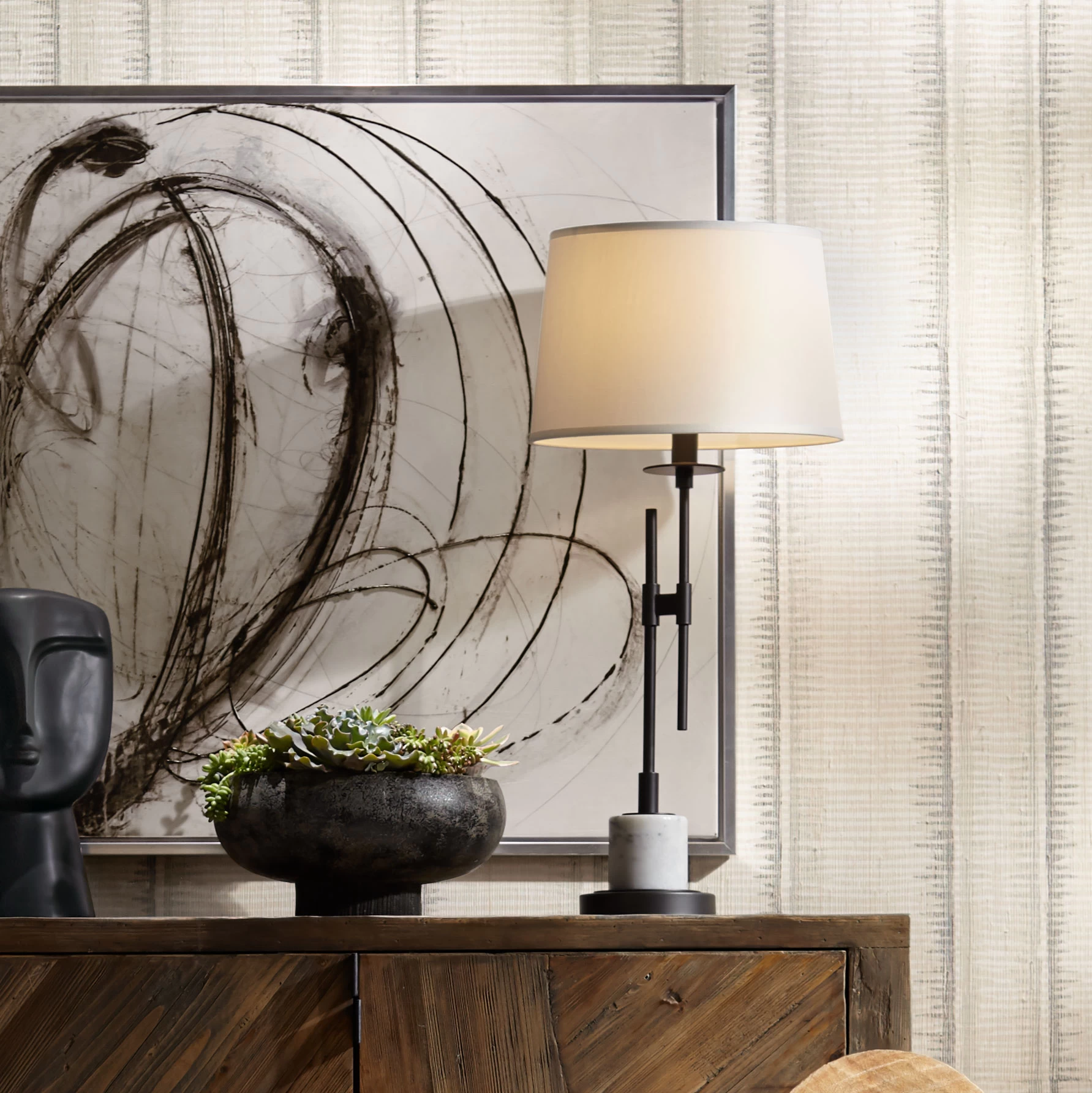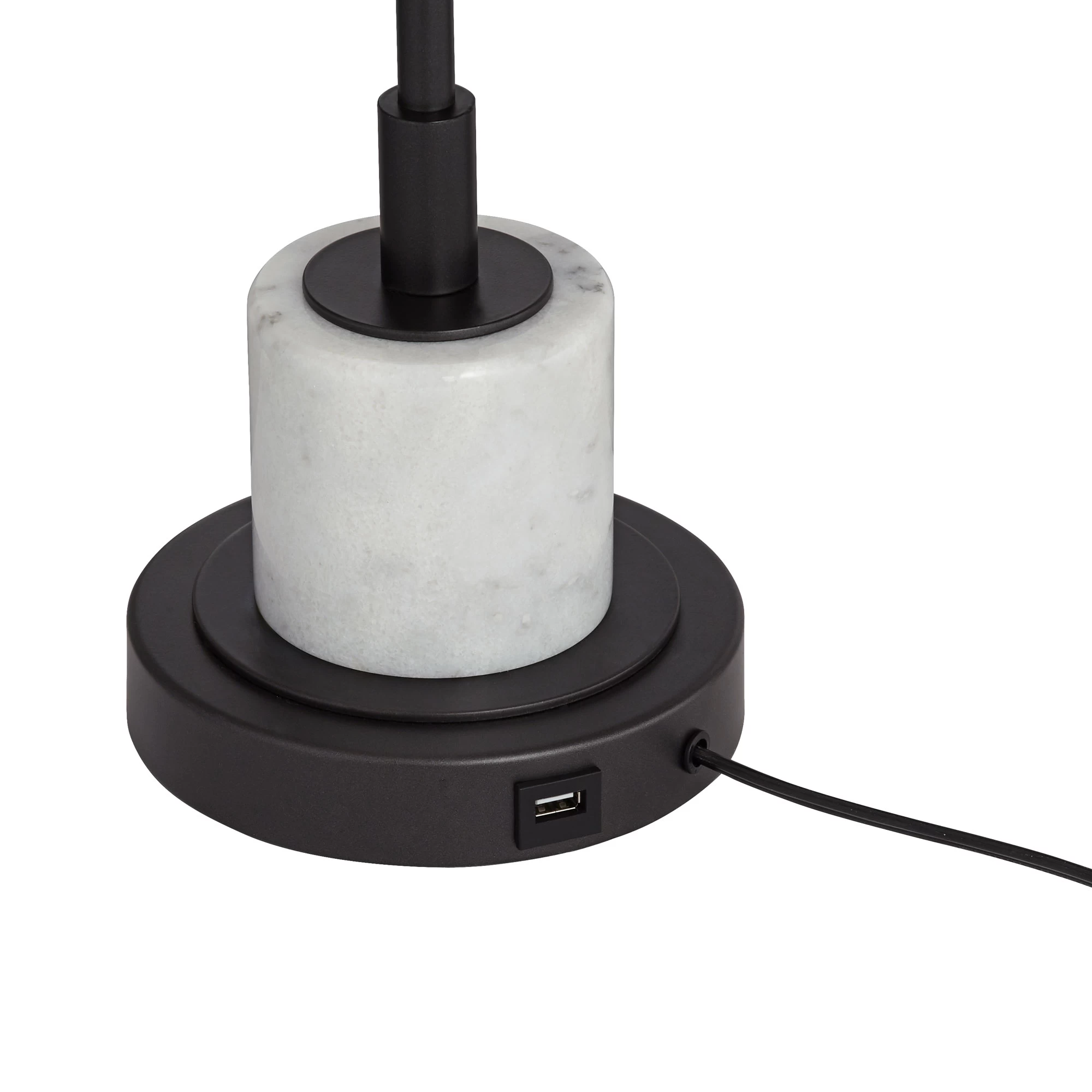 Smooth, sleek, and endlessly chic, the Blackstone Table Lamp brims with modern elegance. The white linen shade and white marble base are joined by metal posts in a dark Gun Metal grey finish. Brackets connecting the two posts add a contemporary, industrial feel. A USB charging port on the base provides convenient access to power. On/off switch on socket.