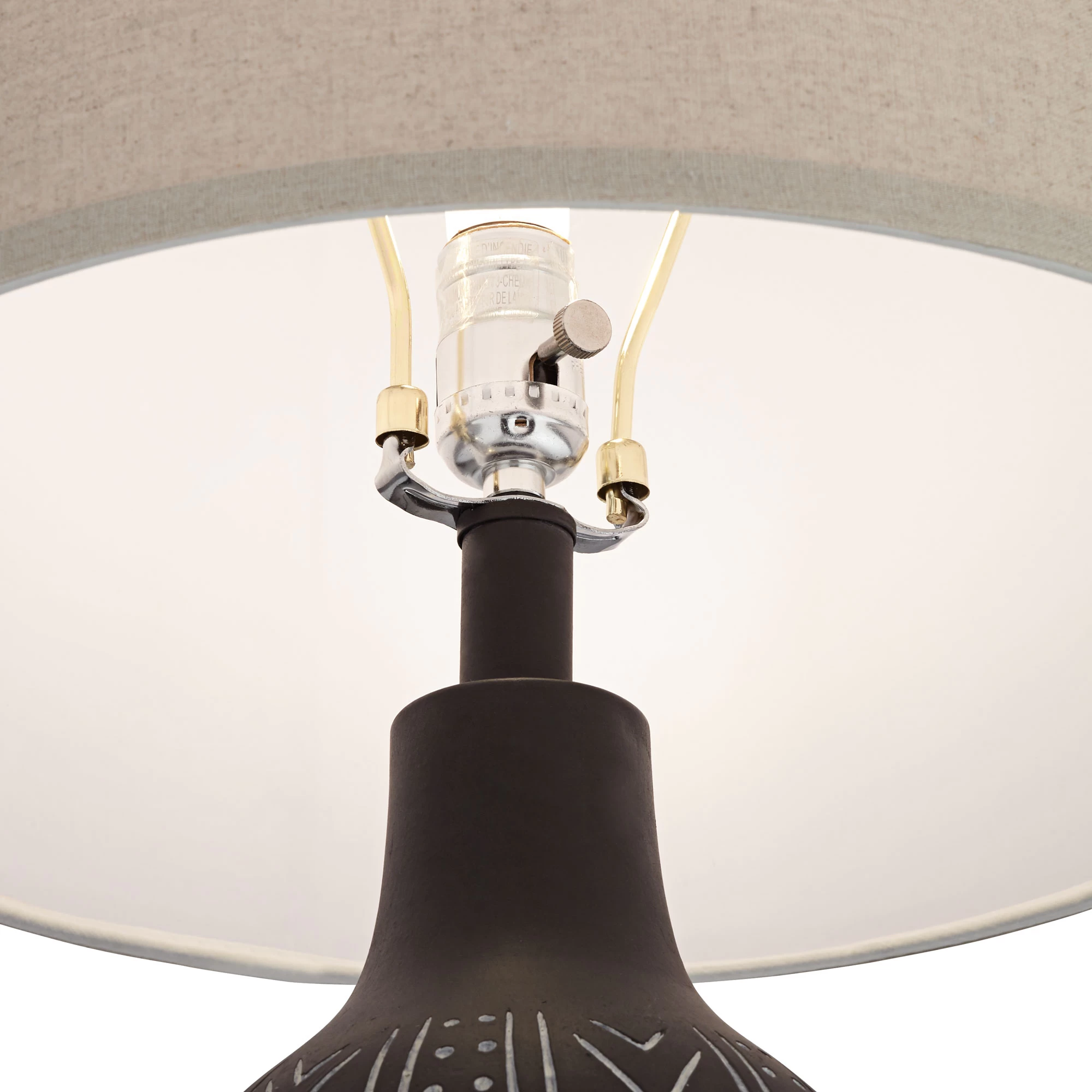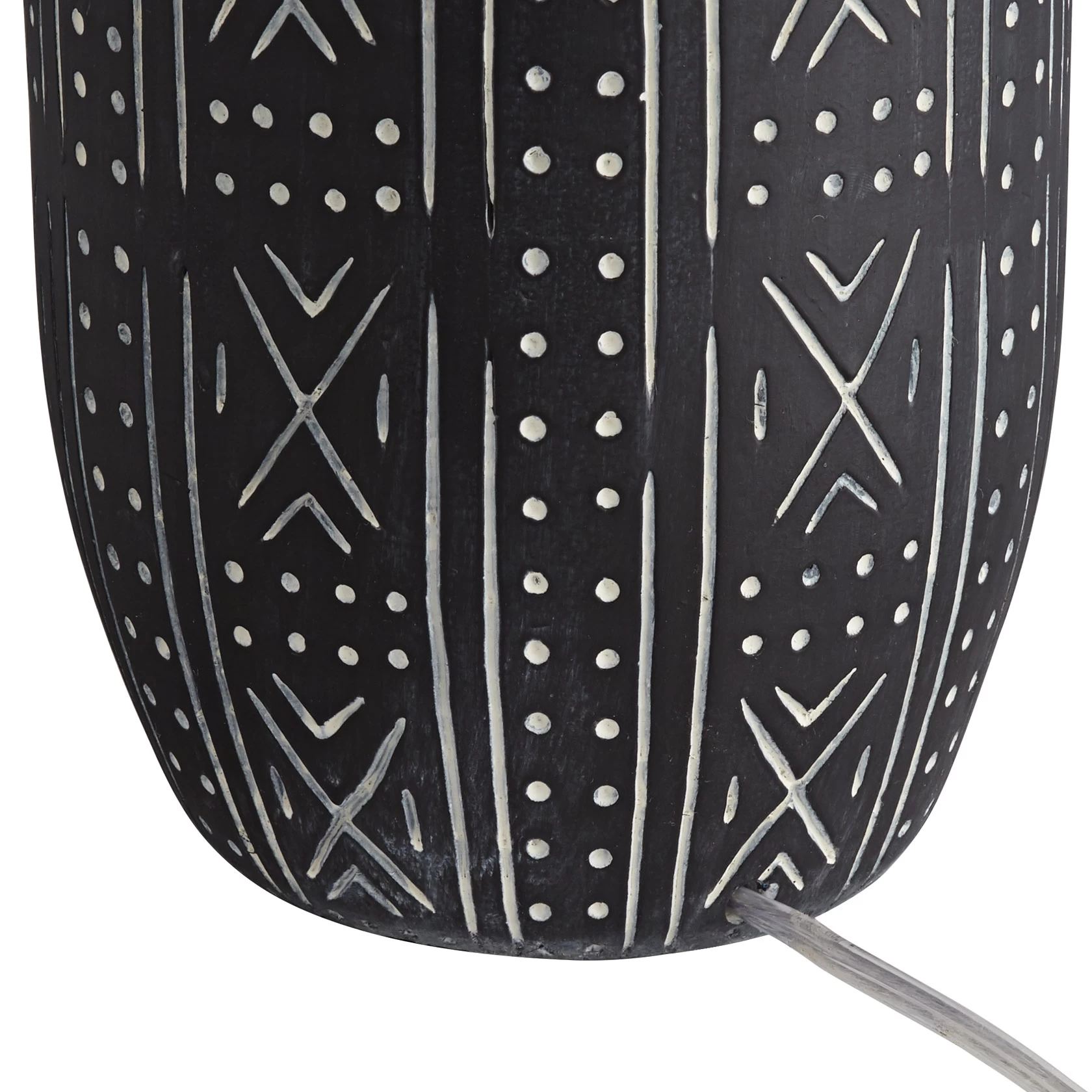 Bring a global flair to your bedroom or living area with the Blackwater Table Lamp. Delicate dot and line patterns etched into the charcoal resin base add a pop of contrast, and a beige shade adds soft illumination. On/off rotary switch installed on socket.