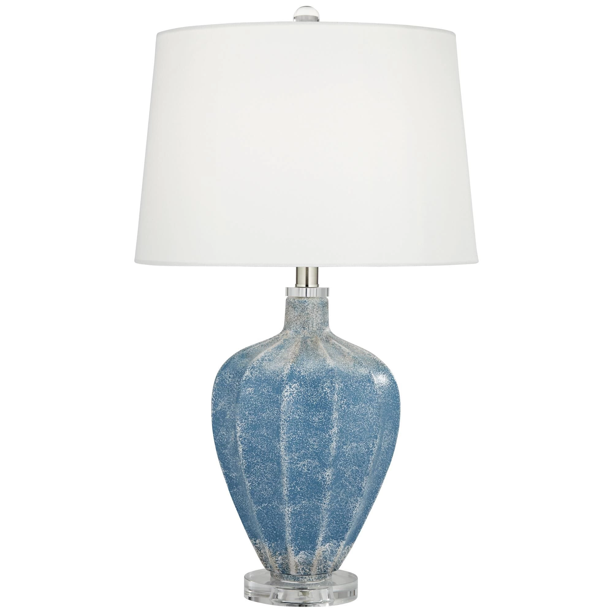 Icy blue glass is delicately shaped and intricately textured to bring lively energy to this modern table lamp. A stunning addition to a sophisticated living space, it boasts a delicate, familiar silhouette of graceful curves that sits on a clear disc base for added elegance. A drum shade sits on top, offering bright, diffused illumination to a living room or library.