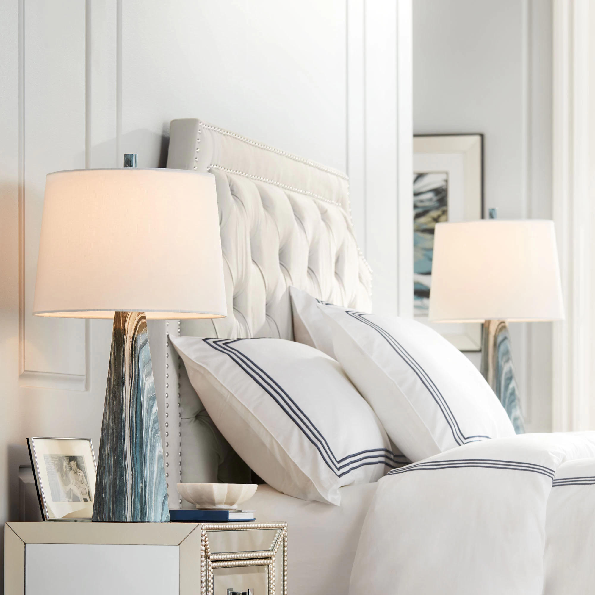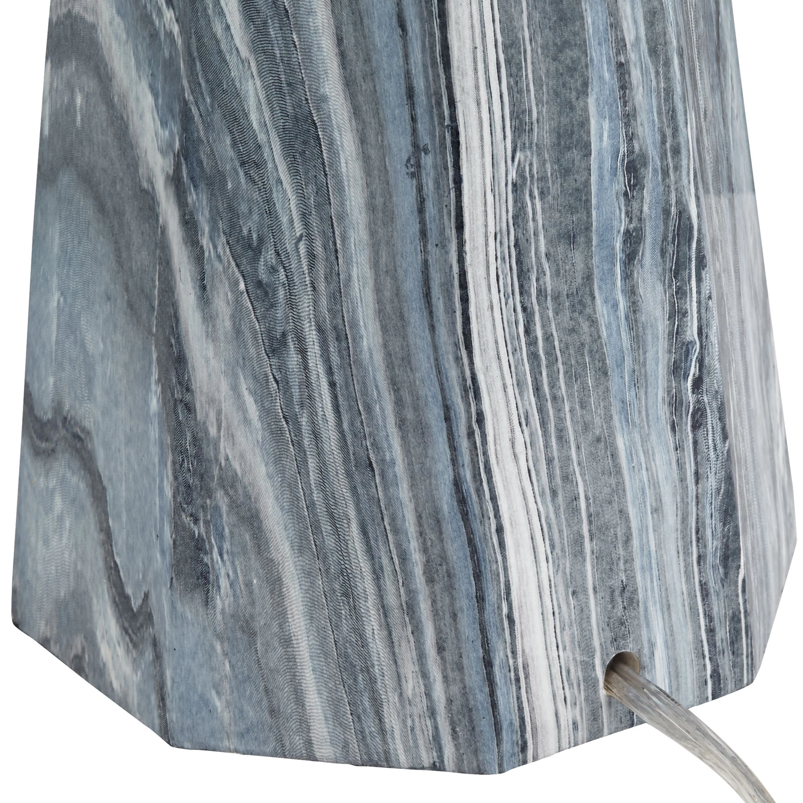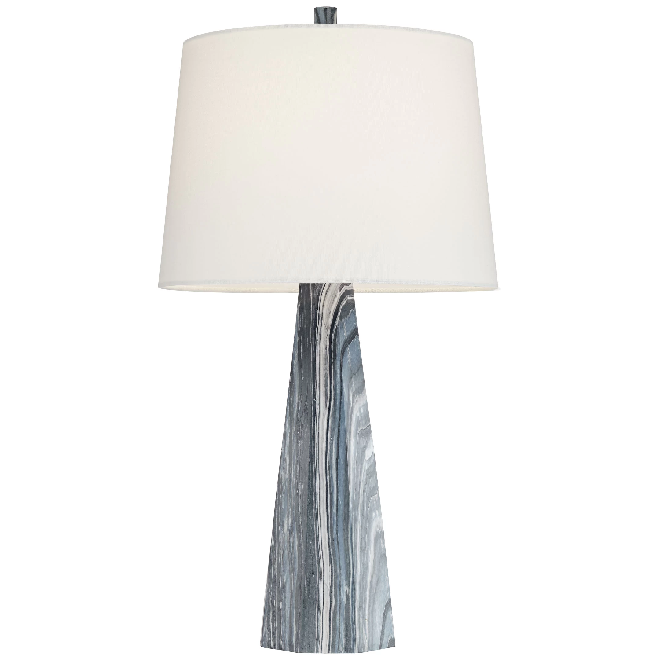 The Bluestone Table Lamp Set features a pair of lamps with a geometric resin base in a faux stone finish. Striations of blue, gray and white add a pop of color to complement a tapered linen drum shade. An on/off rotary switch is installed on the socket.