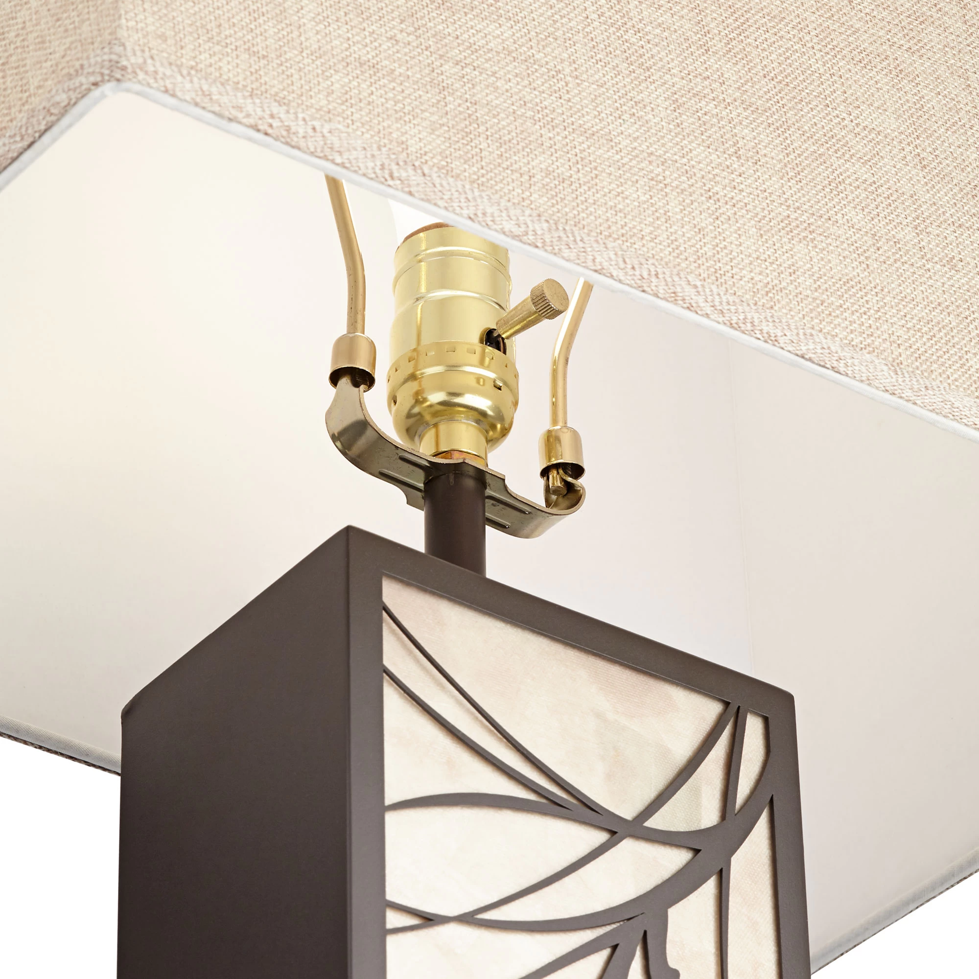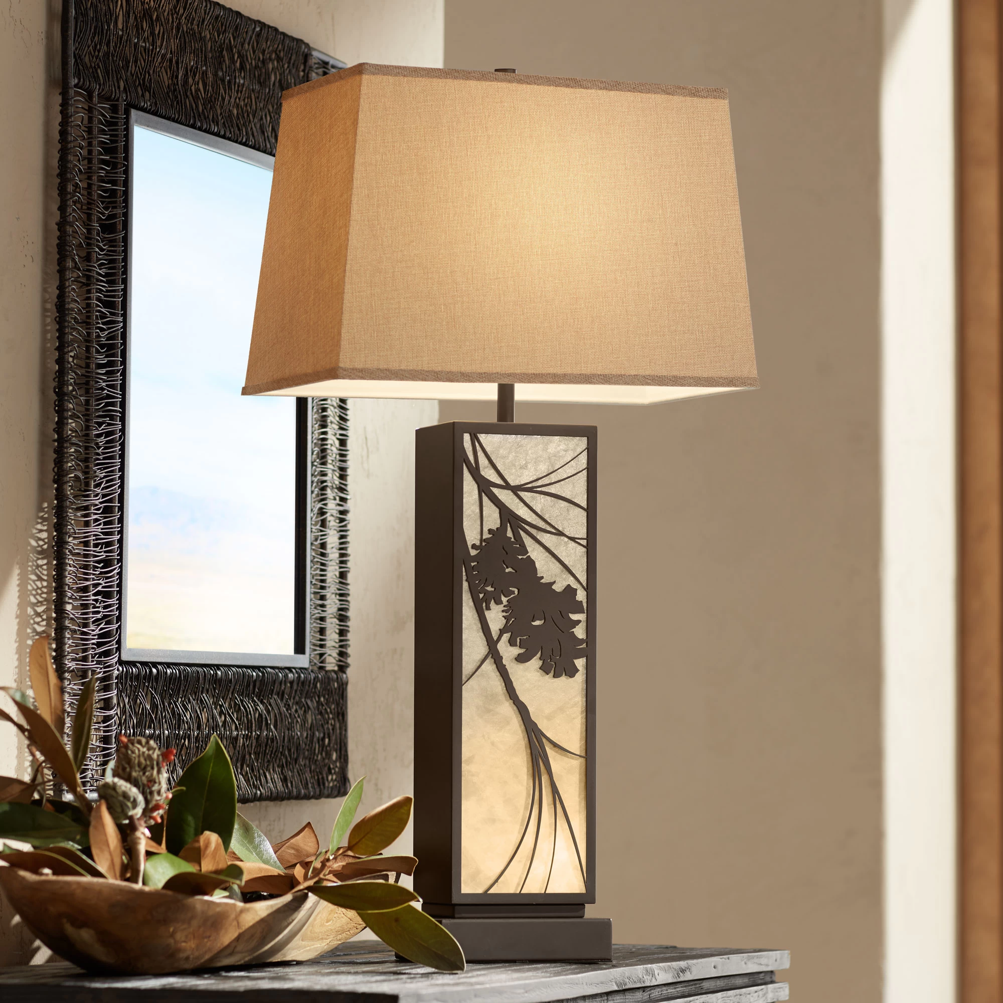 The Brookline Table Lamp brings a natural touch to your space with a delicate branch detail over a mica backing. The rectangular base houses an included 40W nightlight that gently shines through the translucent mica. A tapered rectangular jute shade tops the lamp for a coordinating look. On/off switch located on socket.