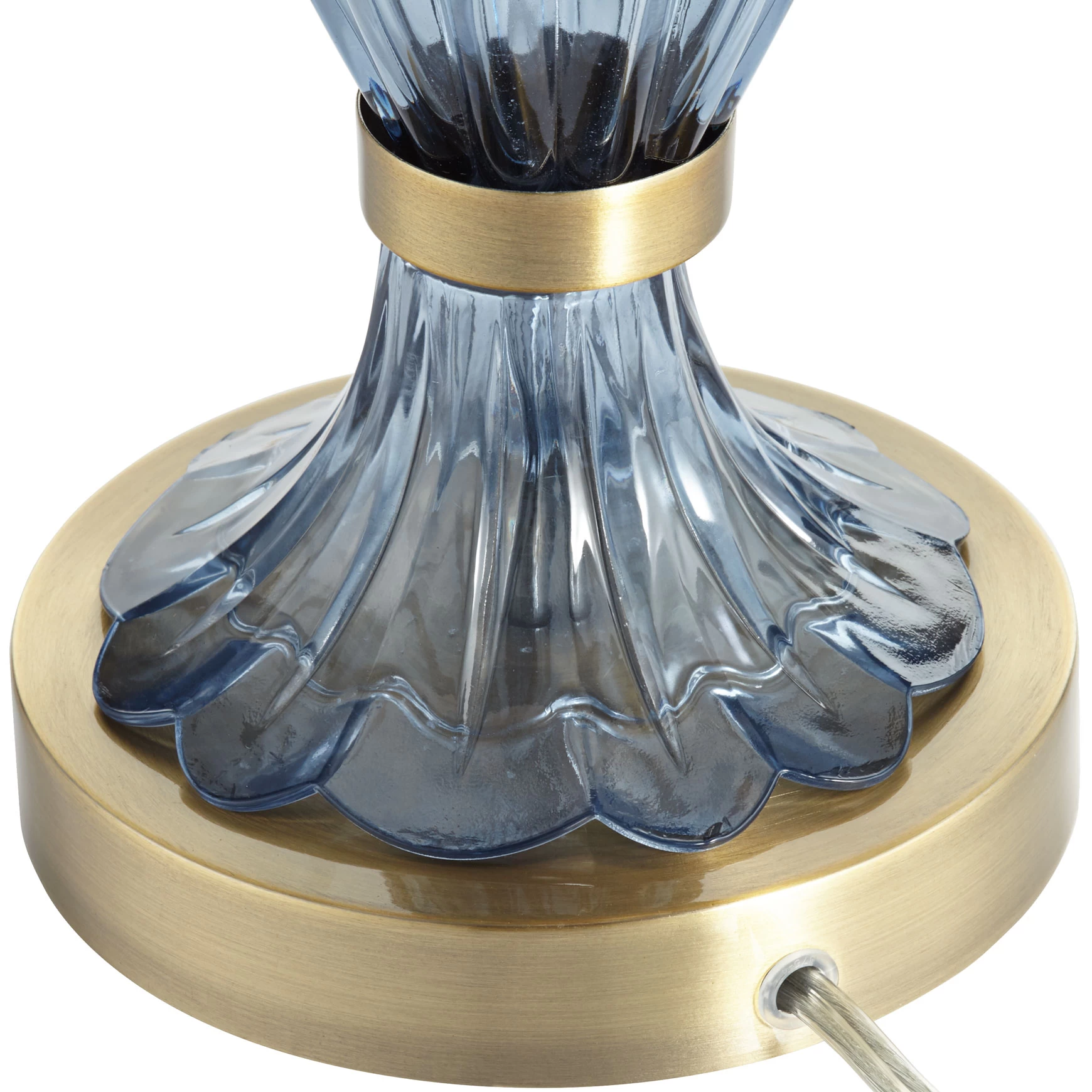 The Chateau Ariel Table Lamp offers a traditional design with a pop of color, featuring a curving tinted glass base topped with a white faux silk shade. Ribbed glass creates a rich texture, and Brass finished metal bands add a touch of contrast. On/off switch on socket.