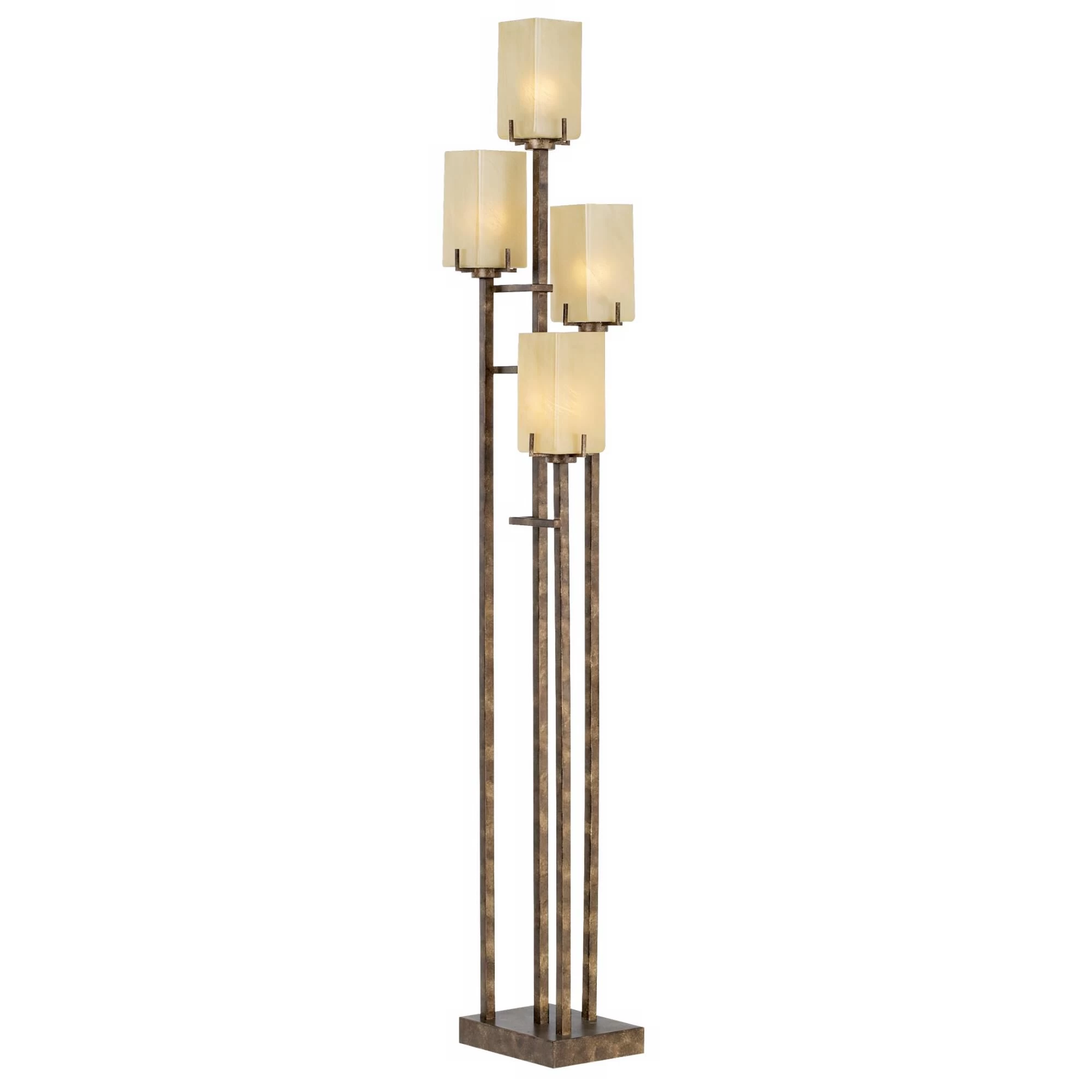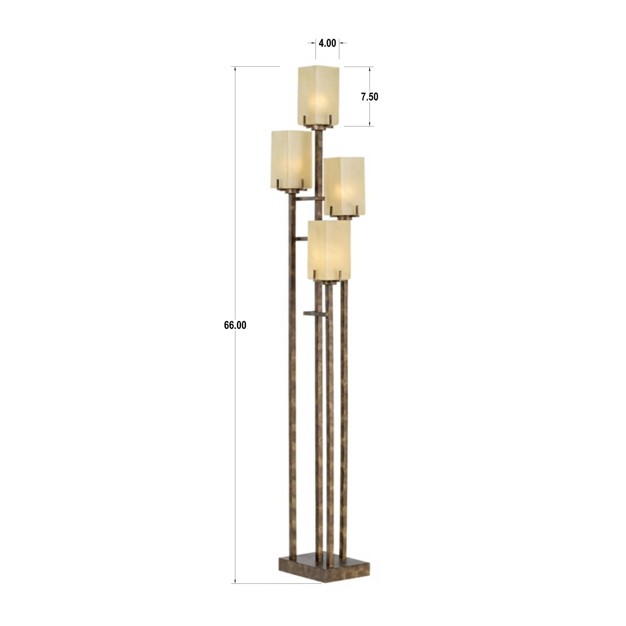 Set at varying heights, four rectangular glass shades add casual character to this Kathy Ireland City Heights uplight floor lamp, which boasts metal construction in a copper bronze finish with gold highlights.
