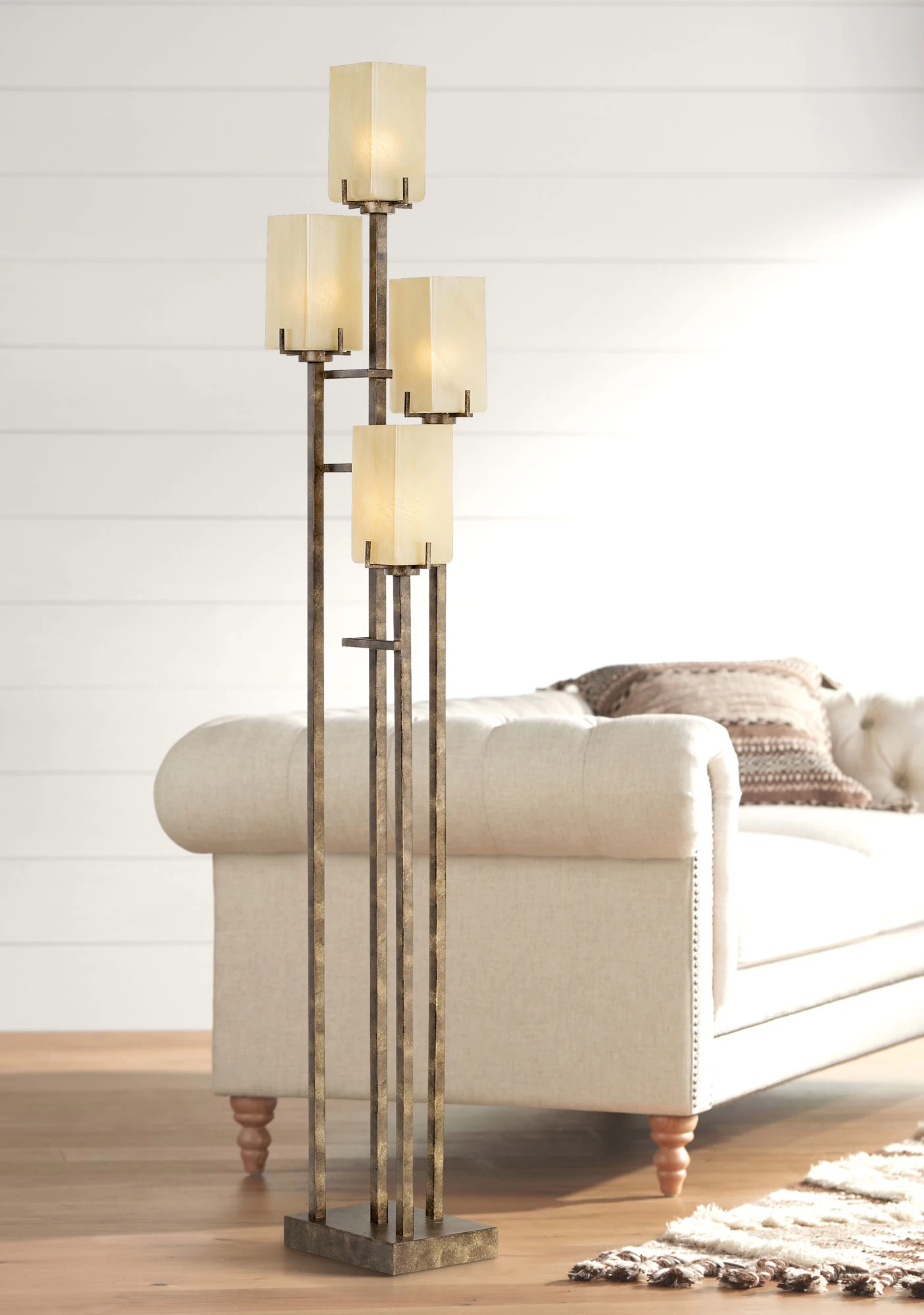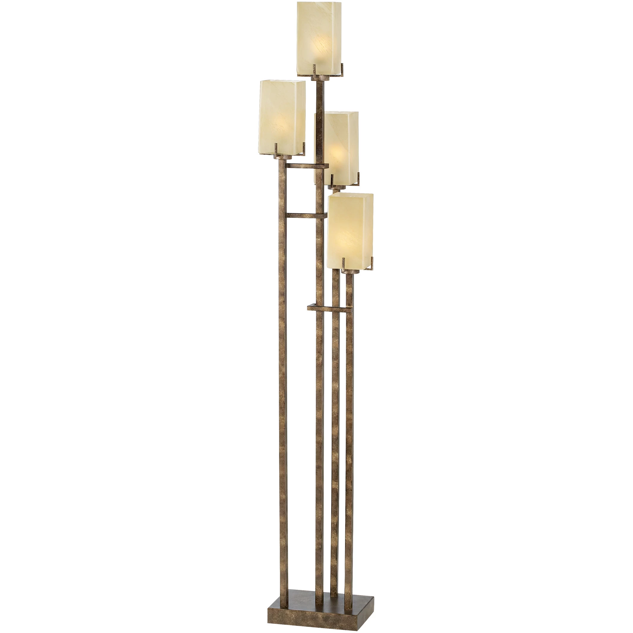 Set at varying heights, four rectangular glass shades add casual character to this Kathy Ireland City Heights Uplight Floor Lamp. Metal construction in a copper bronze finish gives the lamp a contemporary look.