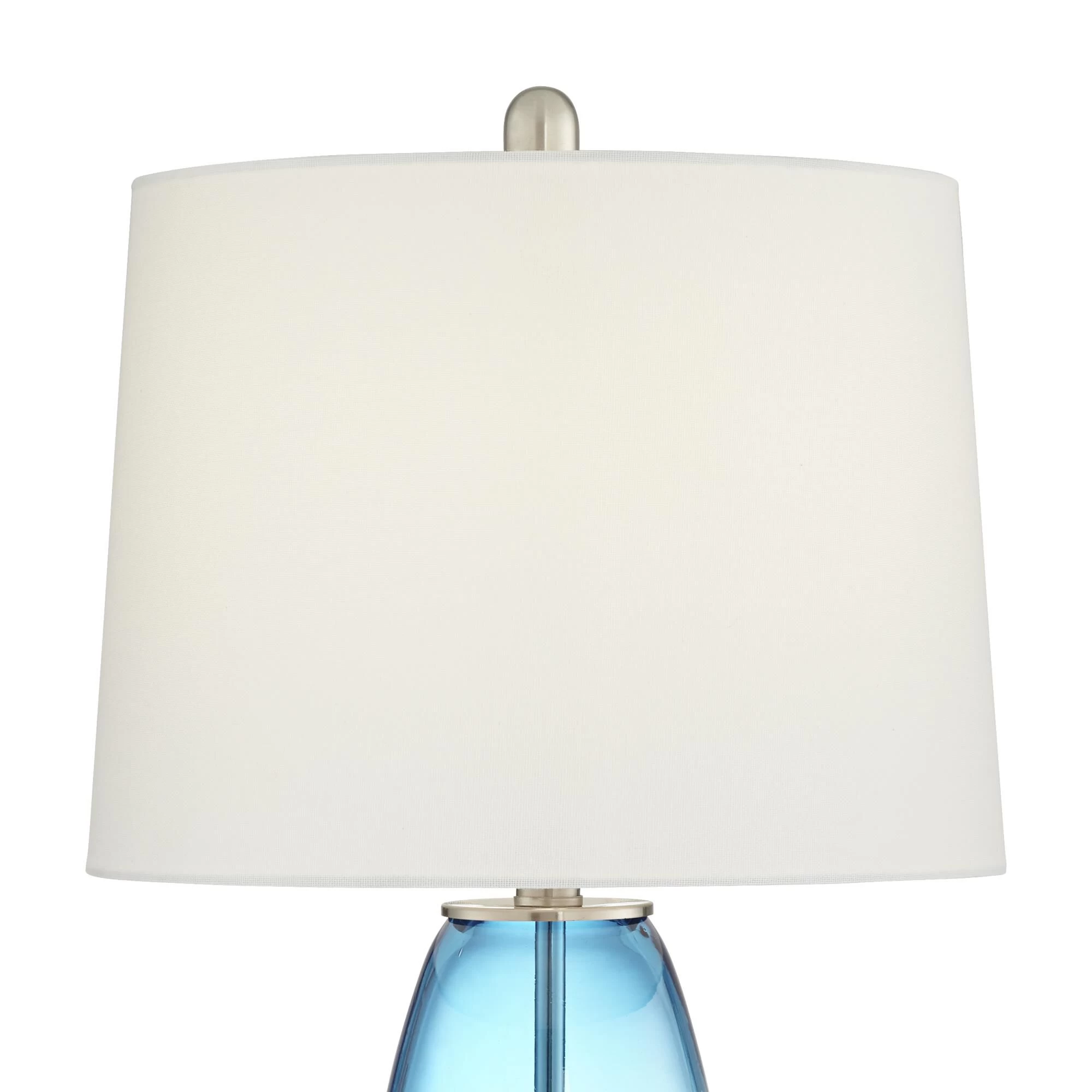 Put the finishing touches on a modern coastal theme with the tropical blue coloration of this set of two glass table lamps. Each is adorned with abstract white-toned accents that create the illusion of foaming surf. A brushed nickel toned base and finial add a chic touch and white drum shades ensure diffused illumination from this stylish pair.