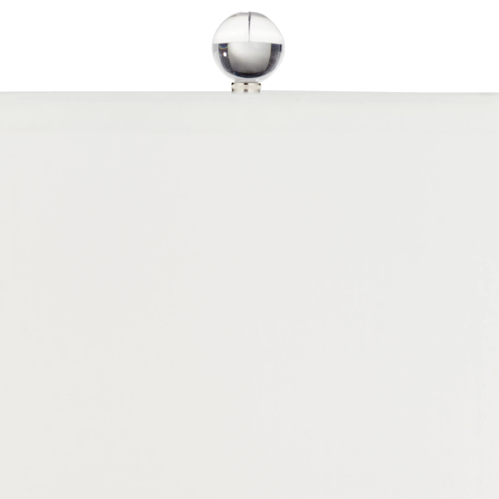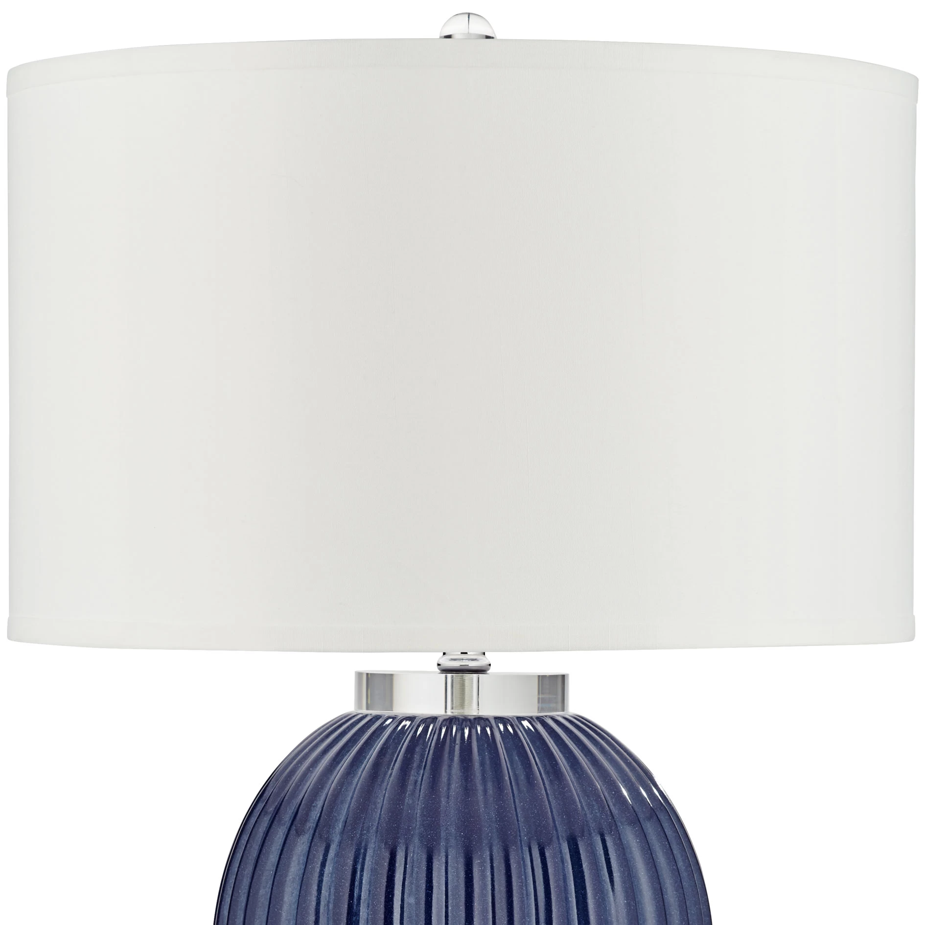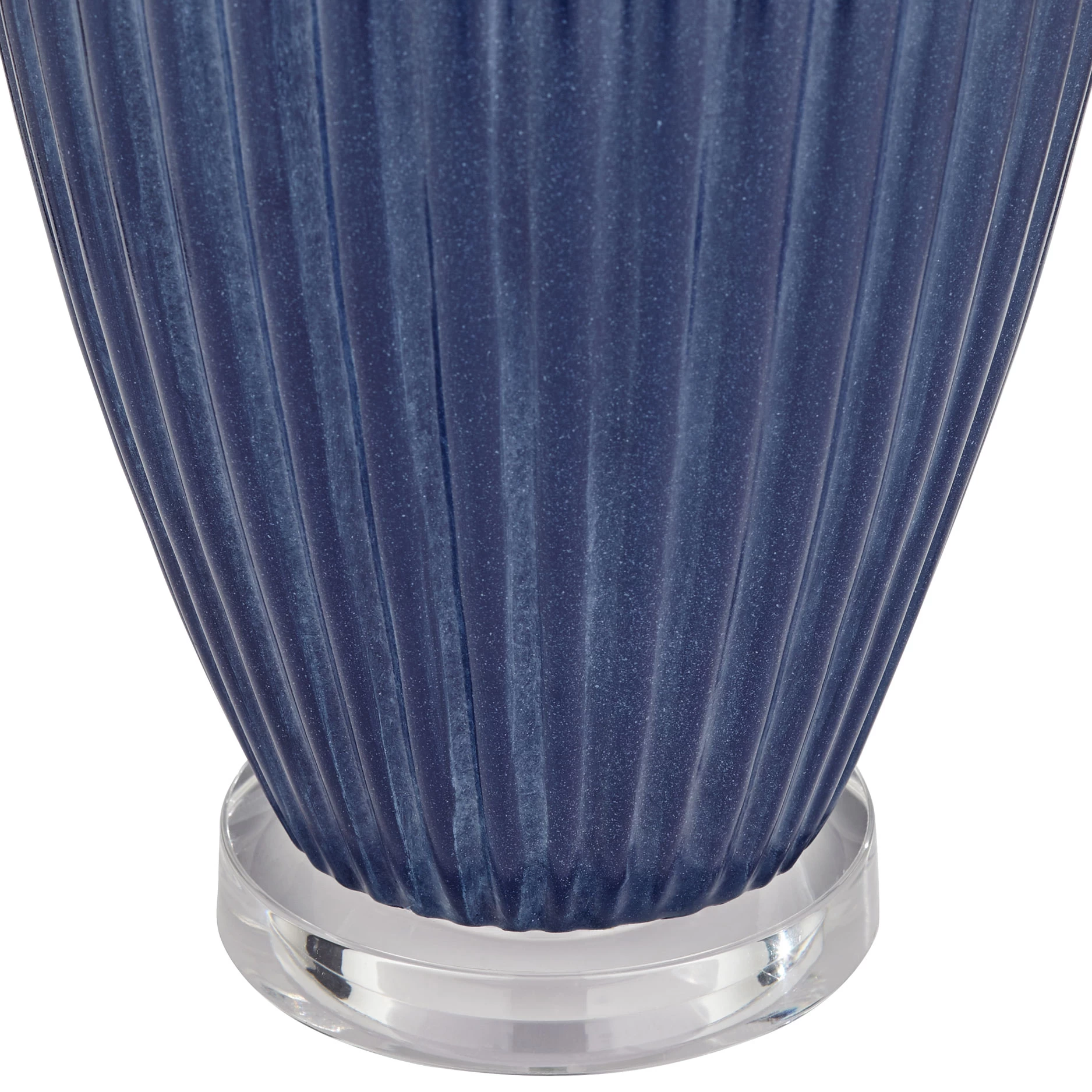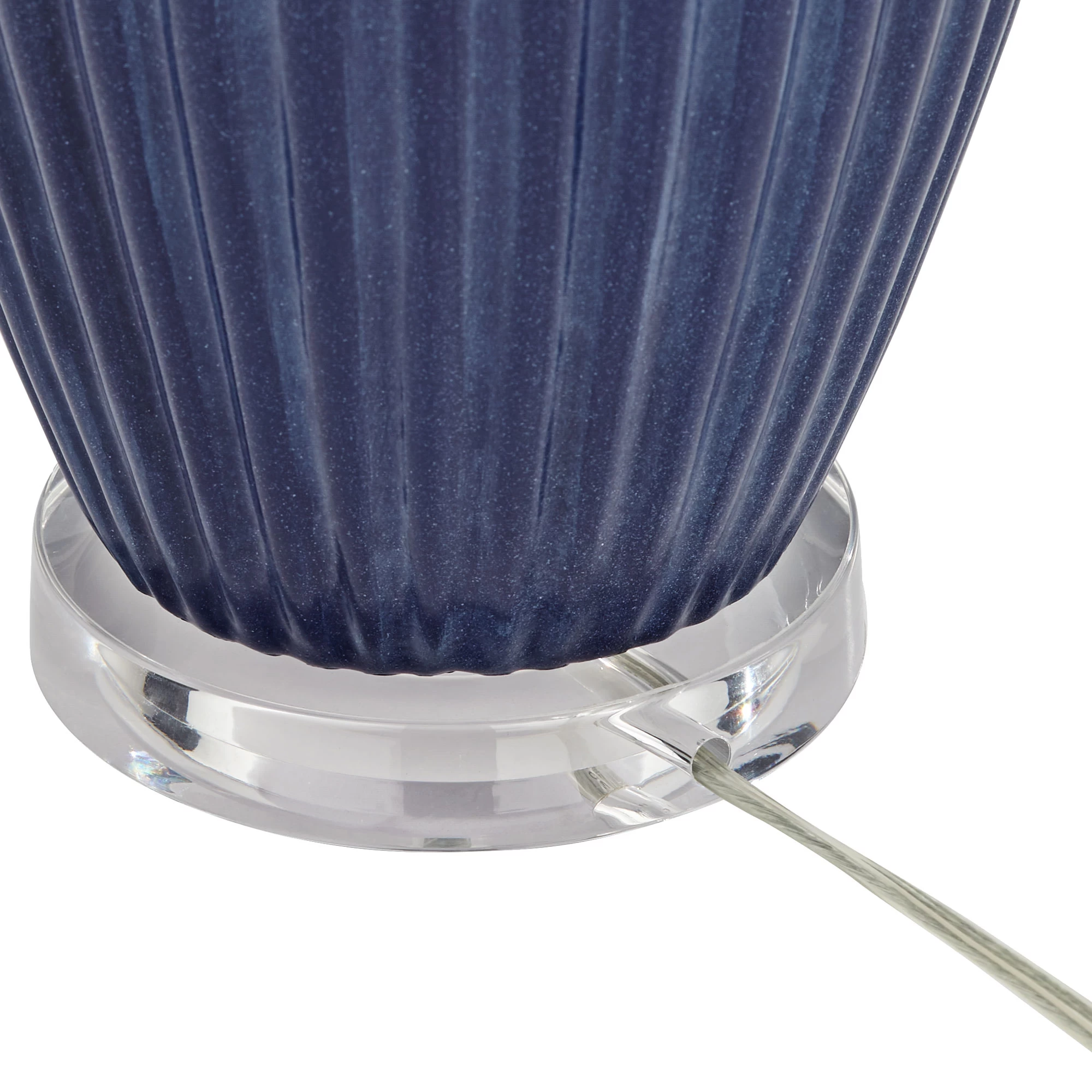 The Colbie Table Lamp features a blue, ribbed glass base that provides a wonderful texture and dimension. The lamp’s body is complemented by a clear disc foot and faux silk drum shade for a cohesive, elegant look that will complement a variety of decor styles. On/off switch located on socket.
