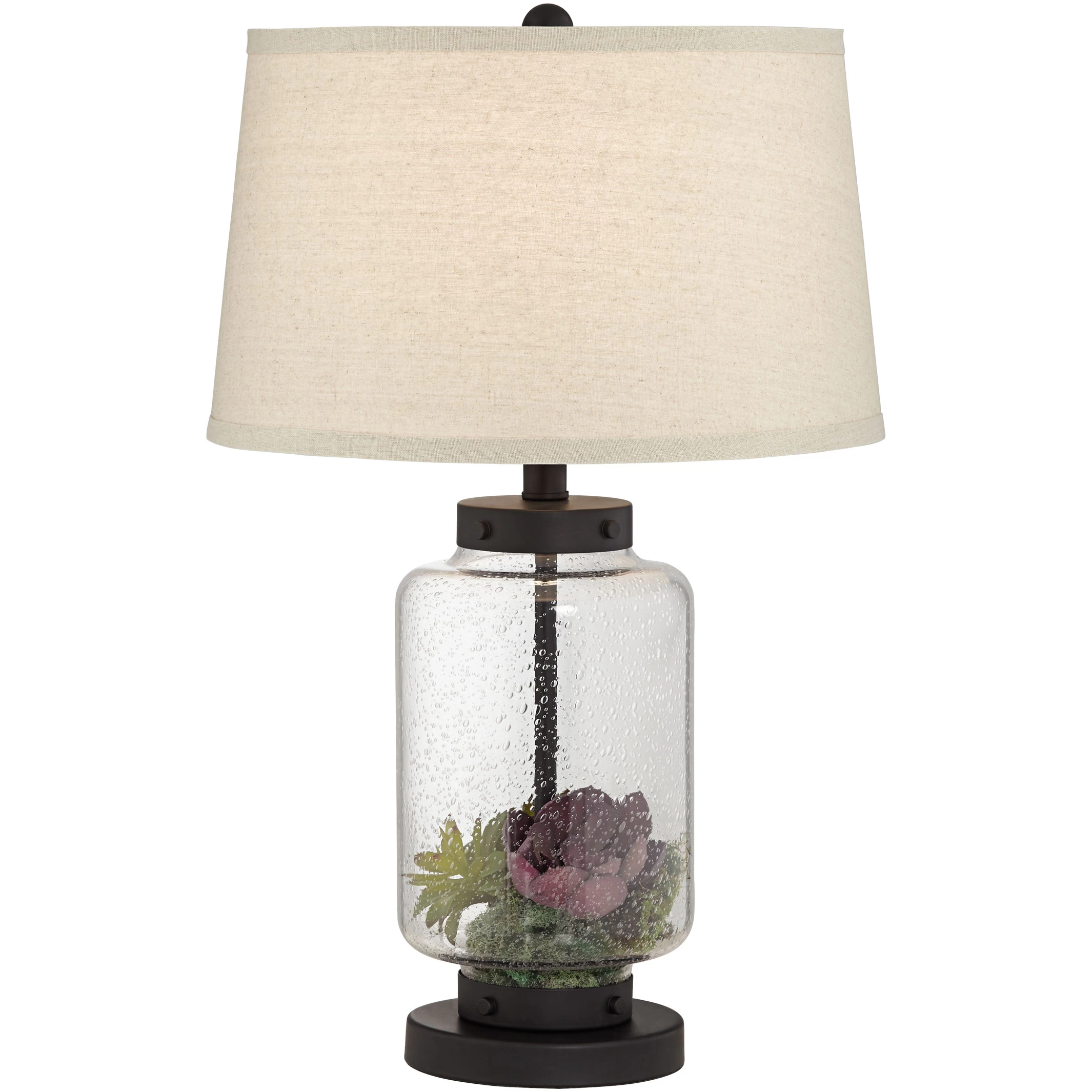 Show off your collectables with the Collectors Dream Table Lamp. Its seeded glass base can be opened and filled with your choice of decorative accent. A tapered linen shade and black metal accents complete the look for a transitional piece that can blend into a variety of interiors. On/off switch located on socket.