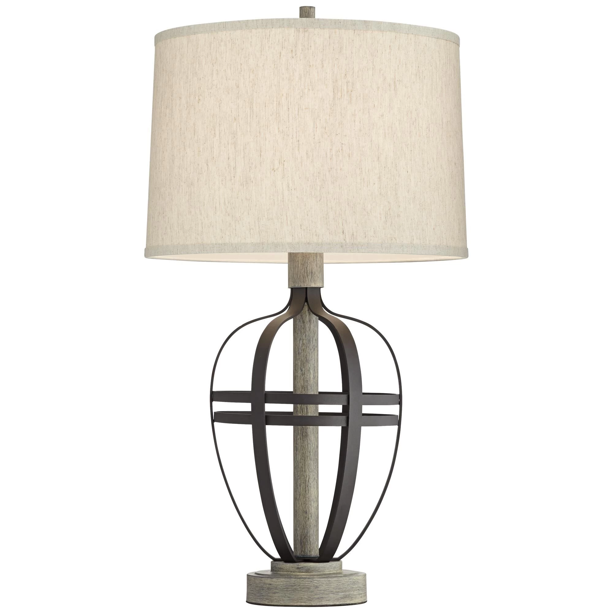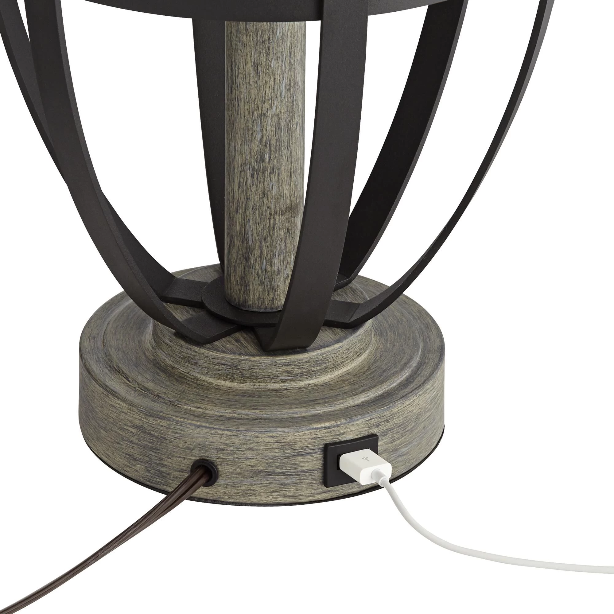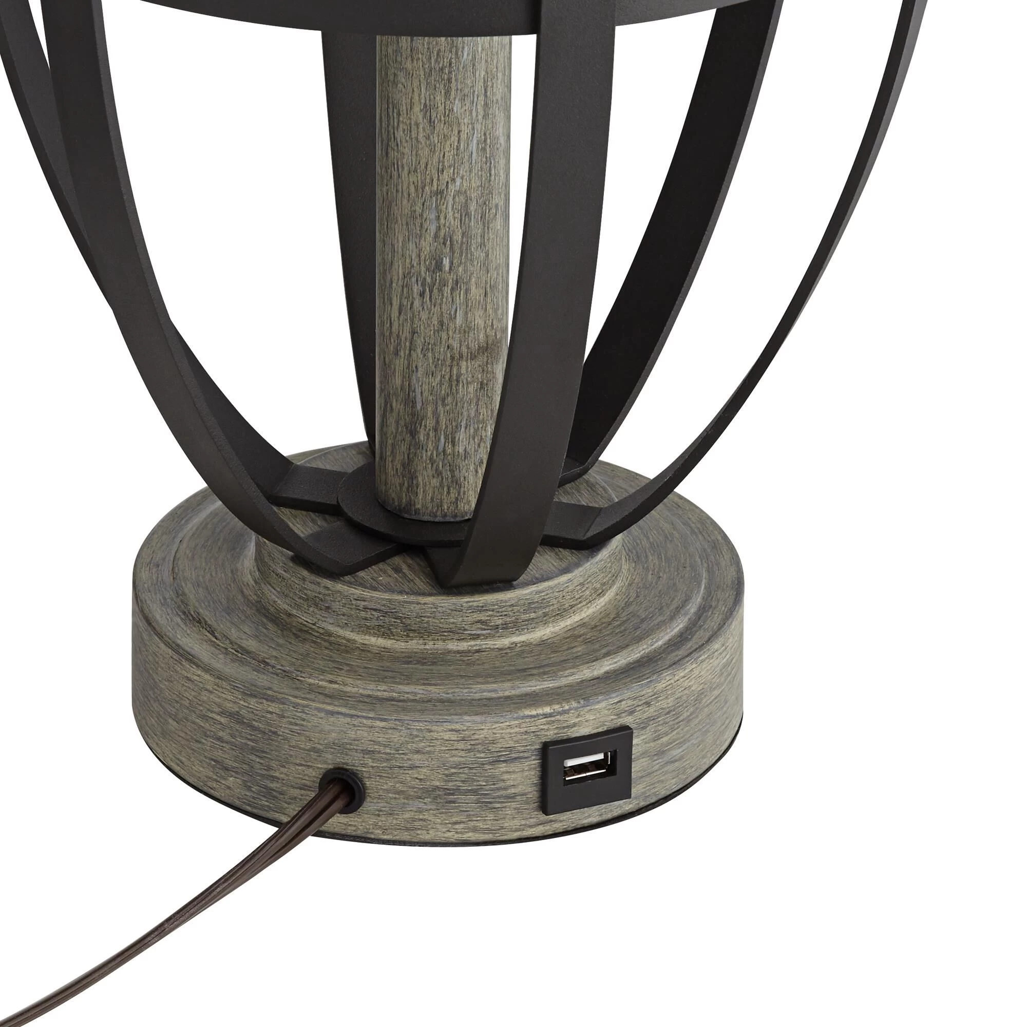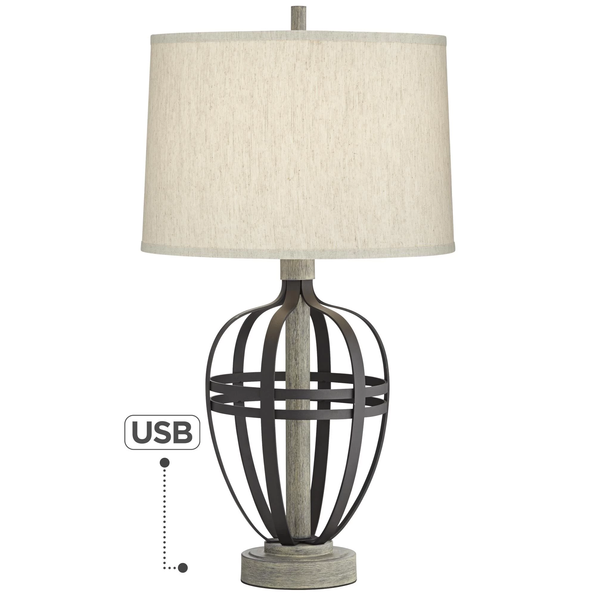 This rustic style table lamp carries a warm presence that has modern function with an included USB port on the base. This table lamp has a matte black metal open cage design that surrounds the stem of the lamp. A light wash grey finish covers faux wood construction and this lamp is topped with a light linen shade.