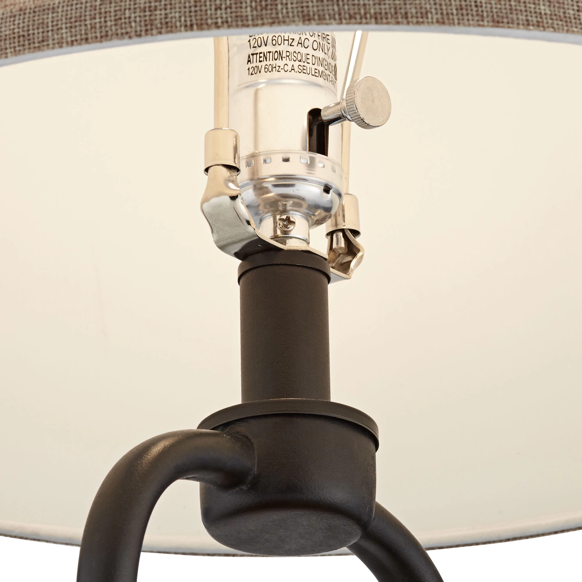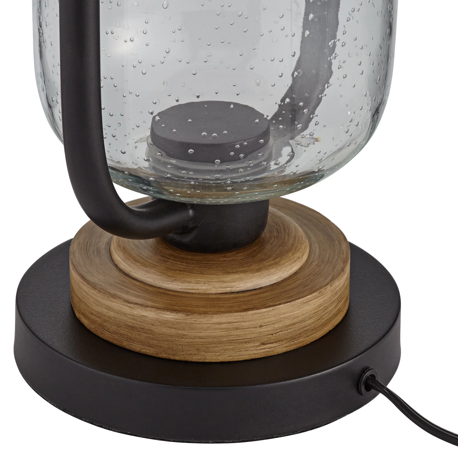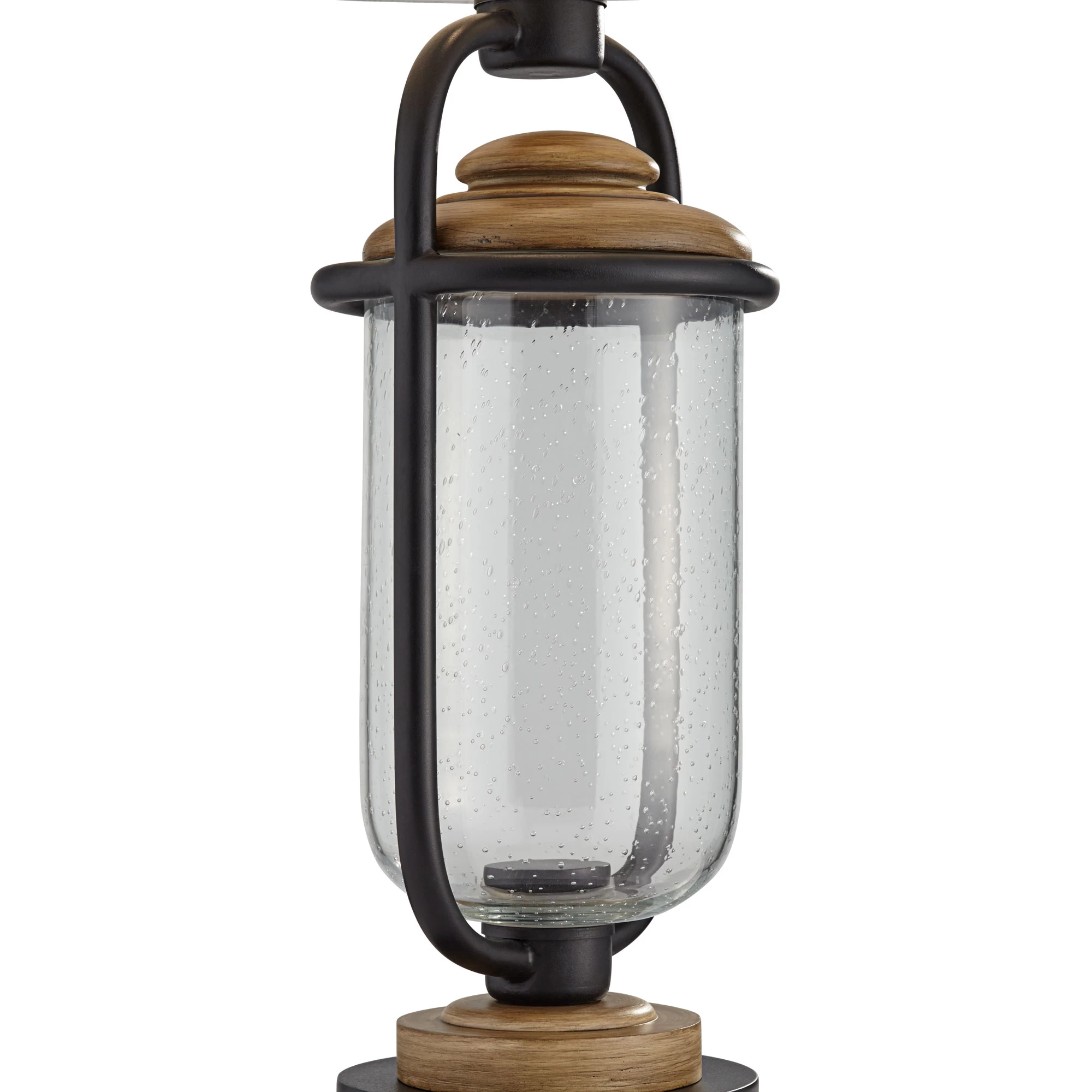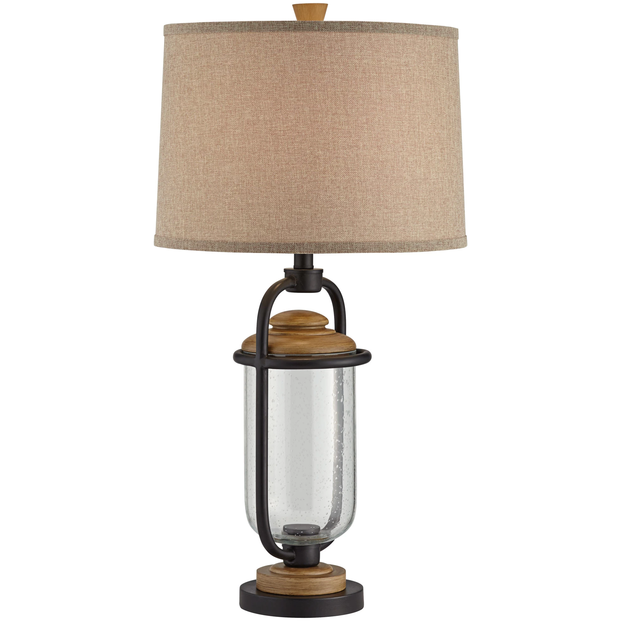 The Darby Table Lamp celebrates the classic form of a vintage lantern with a metal and seeded glass base. A jute shade and faux wood finish accents add a touch of rustic charm that would make Darby right at home in a lake house or cabin. On/off rotary switch installed on socket.