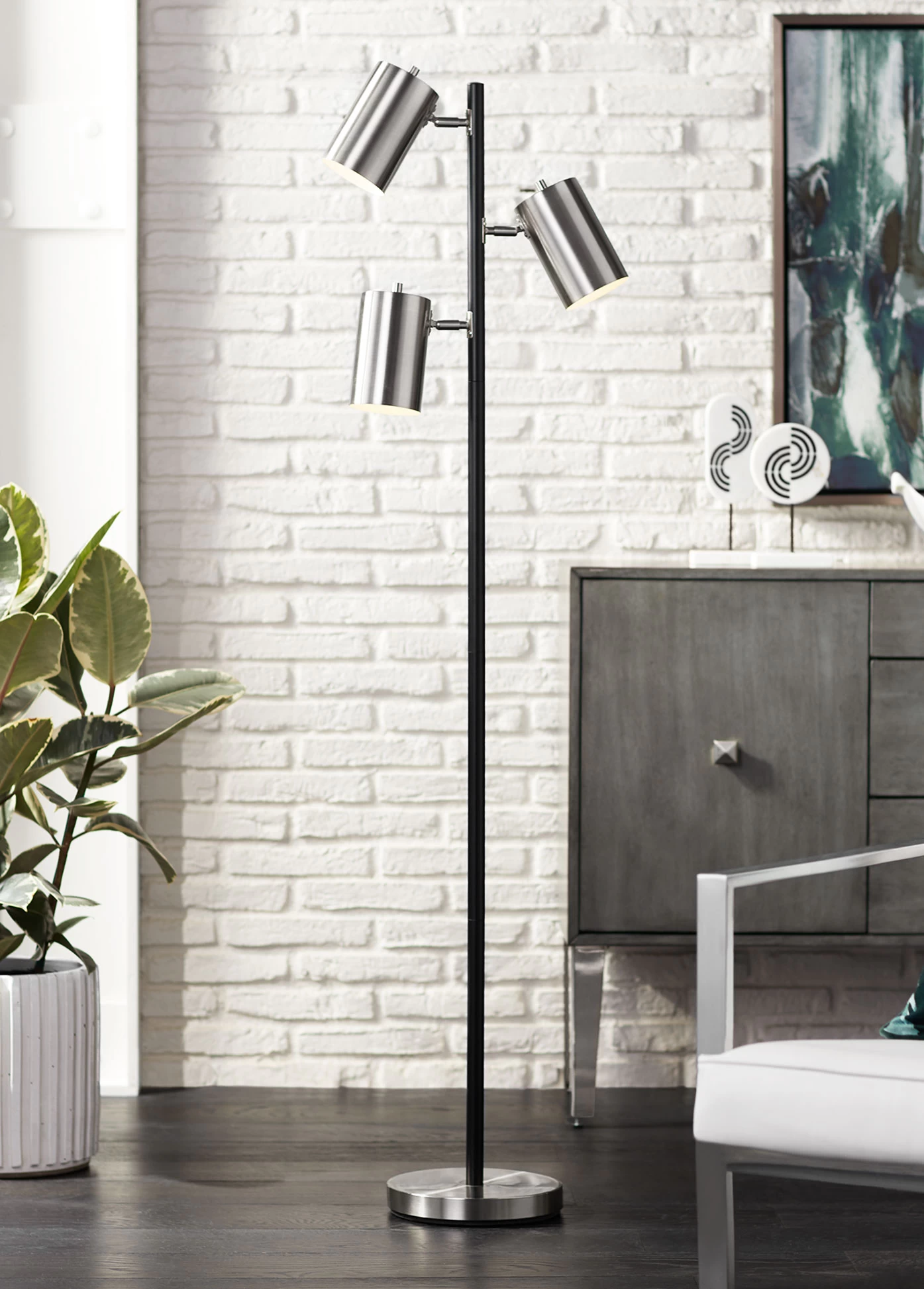 The Donatello Floor Lamp features three independently adjustable lights, making it perfect for providing task or ambient lighting. Its sleek, contemporary design complements a variety of interior decor styles. Available with Brushed Nickel shades and Black post or Brass shades and Walnut post. On/off switches installed on each shade allow the lights to be switched on independently.