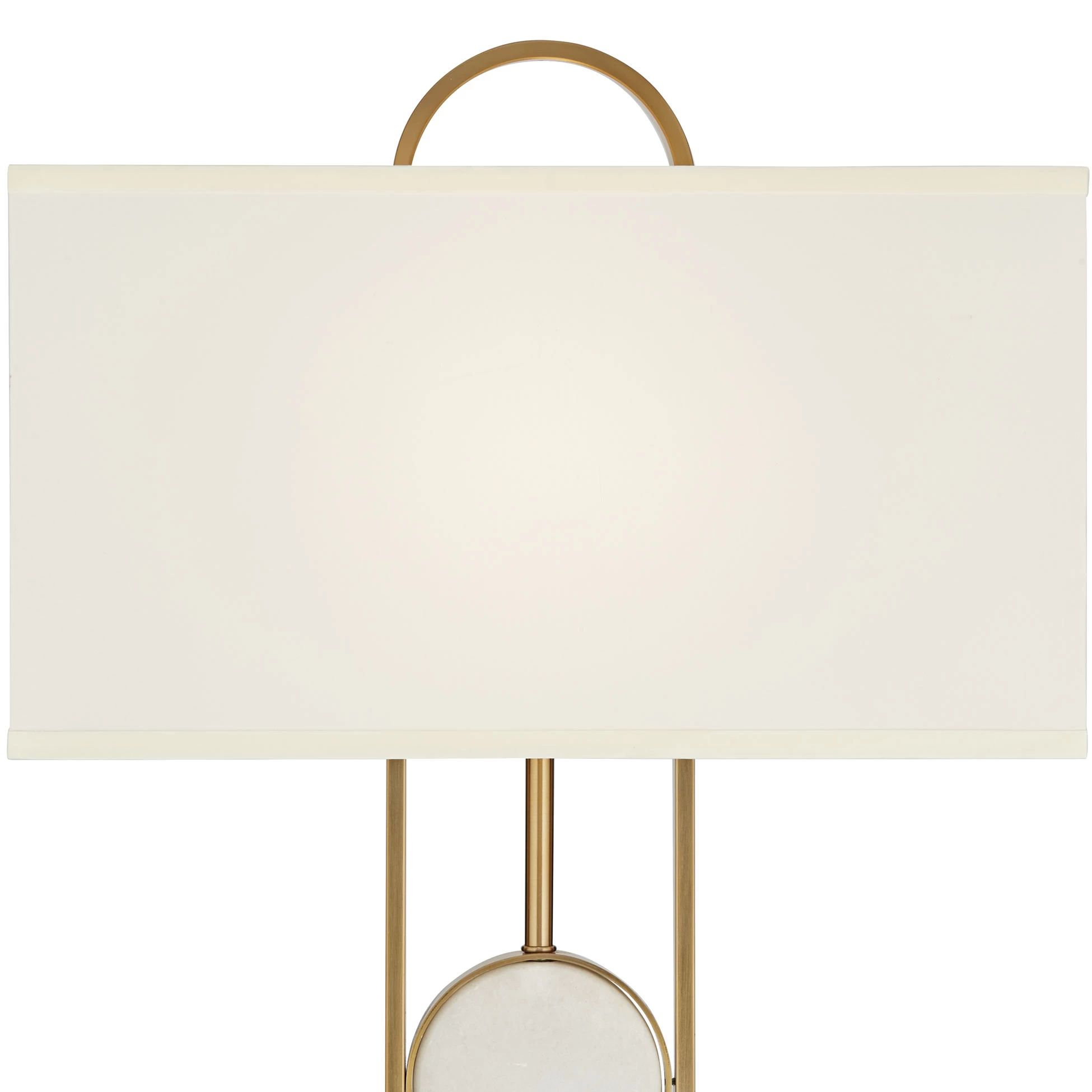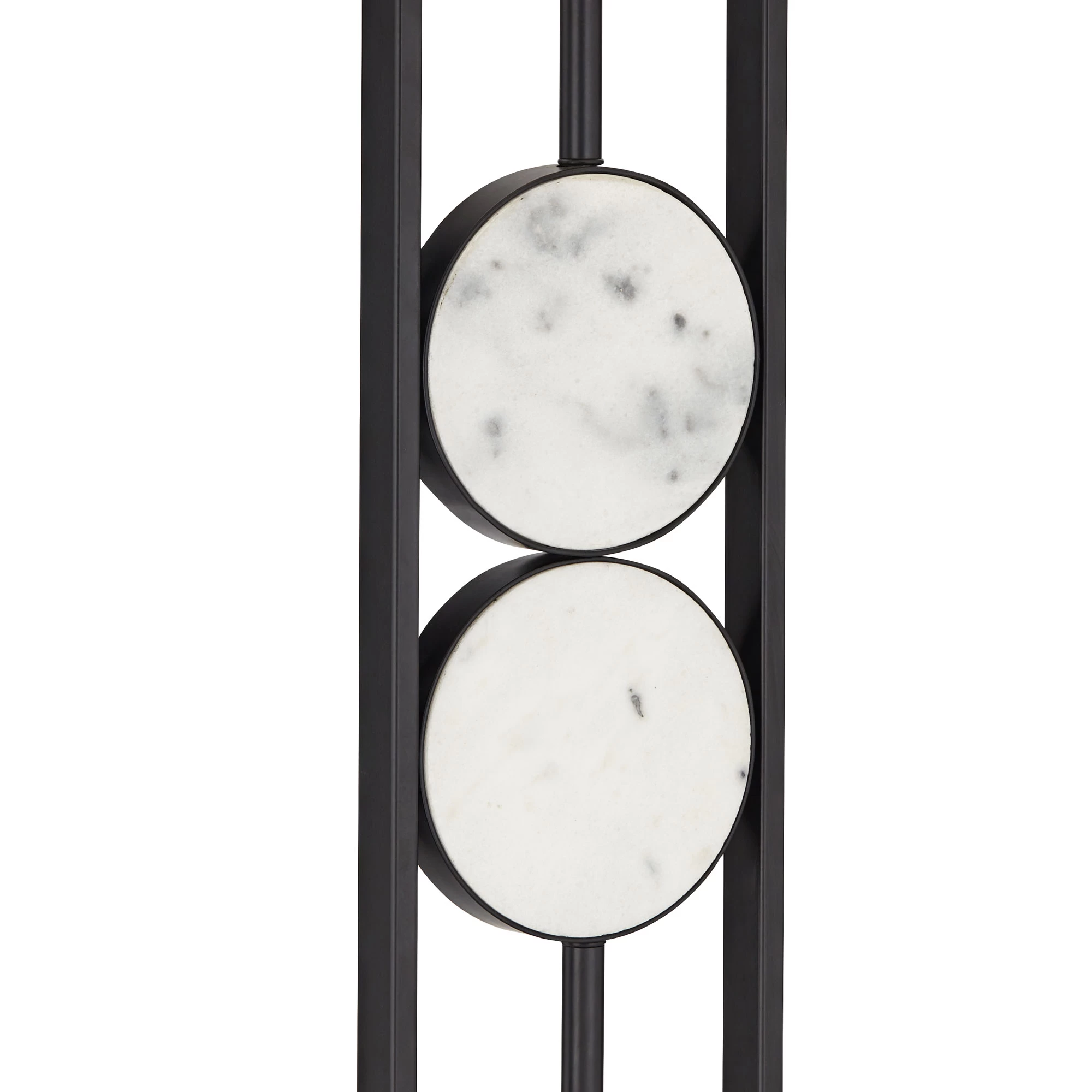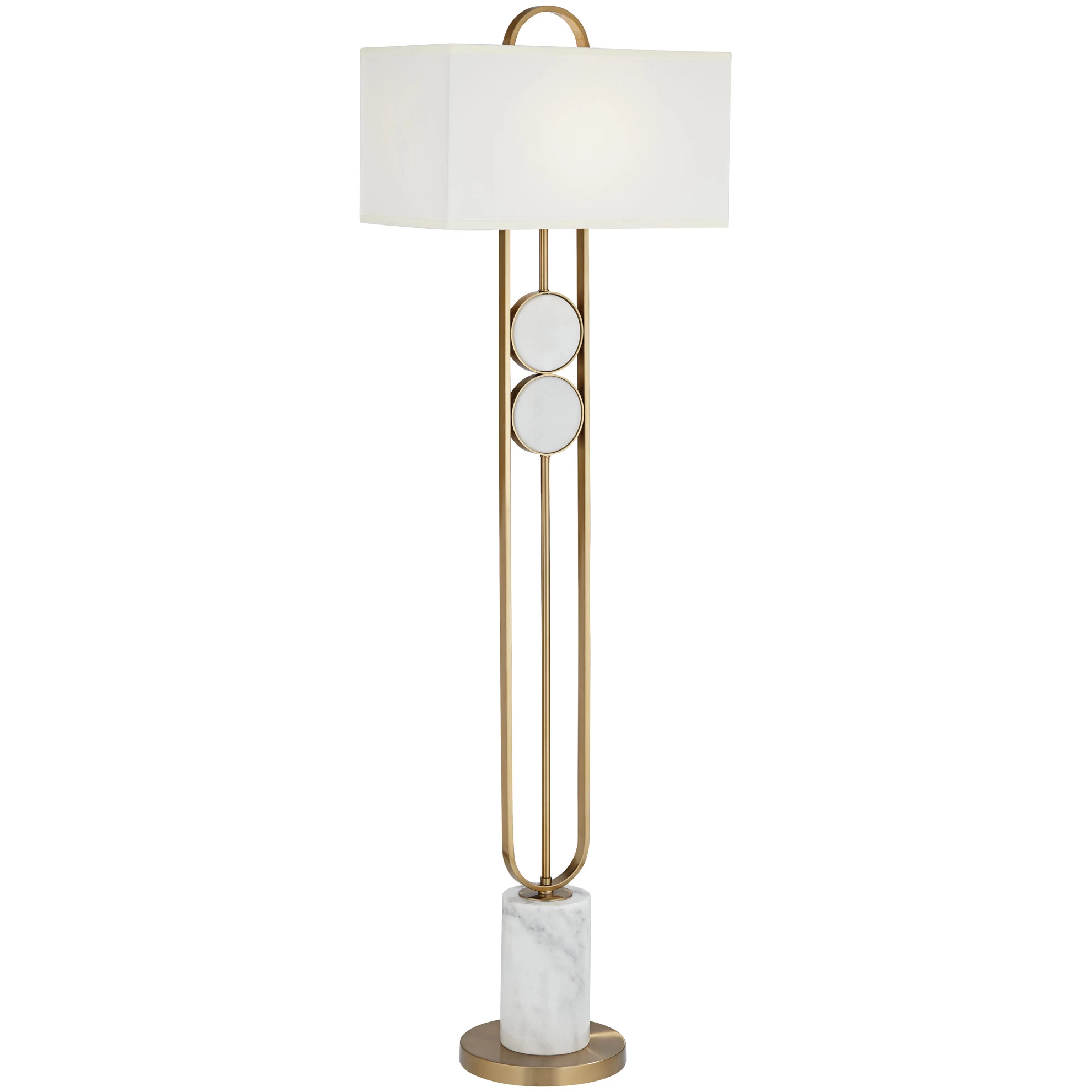 Circles and curves flow together in elegant harmony to give the Eleanor Floor Lamp a sophisticated vibe. Inspired by mid-century decor, Eleanor pairs marble disks with a geometric metal frame available in two finish options. A rectangular base and shantung fabric shade provide an angular contrast to balance the curves of the frame. On/off switch located on socket.