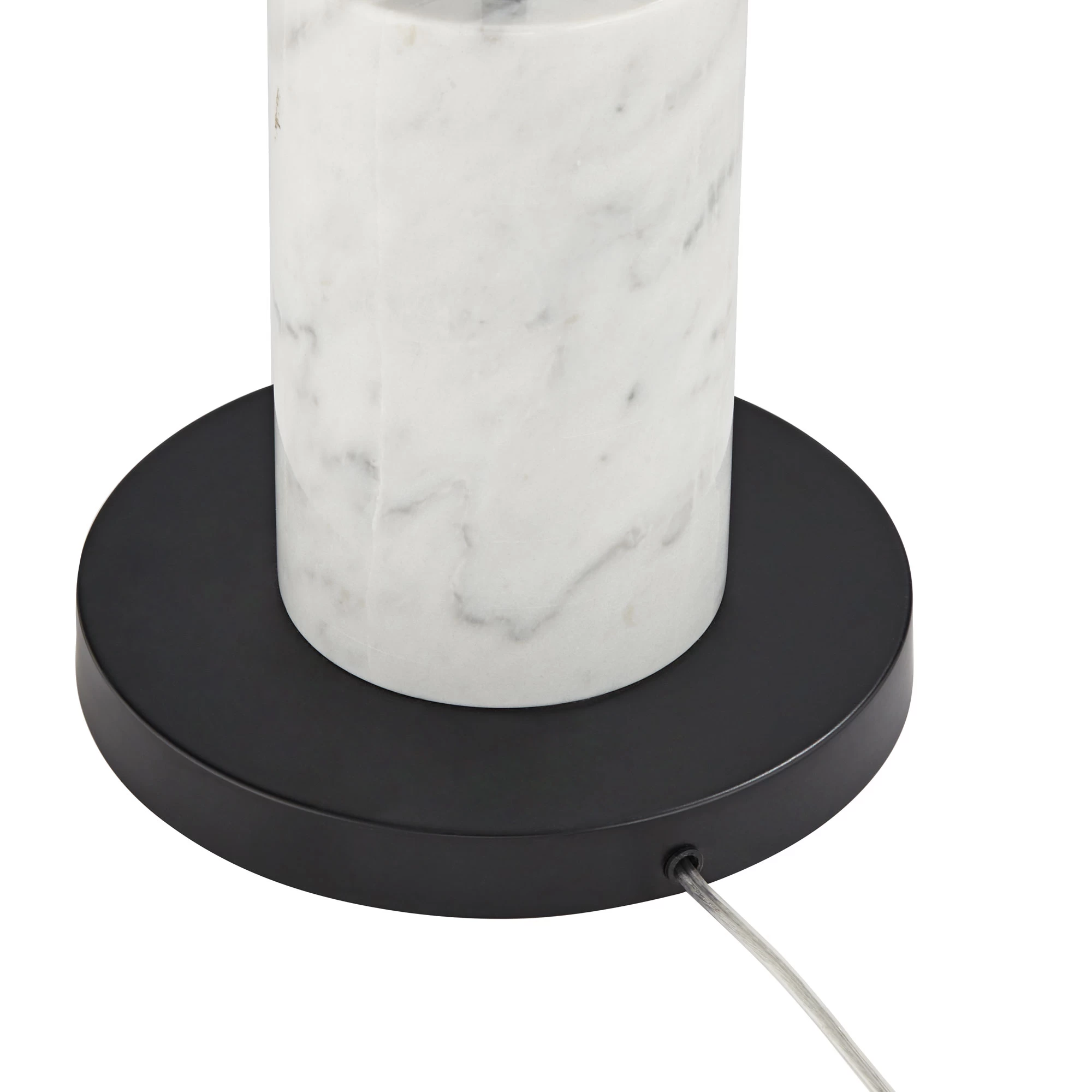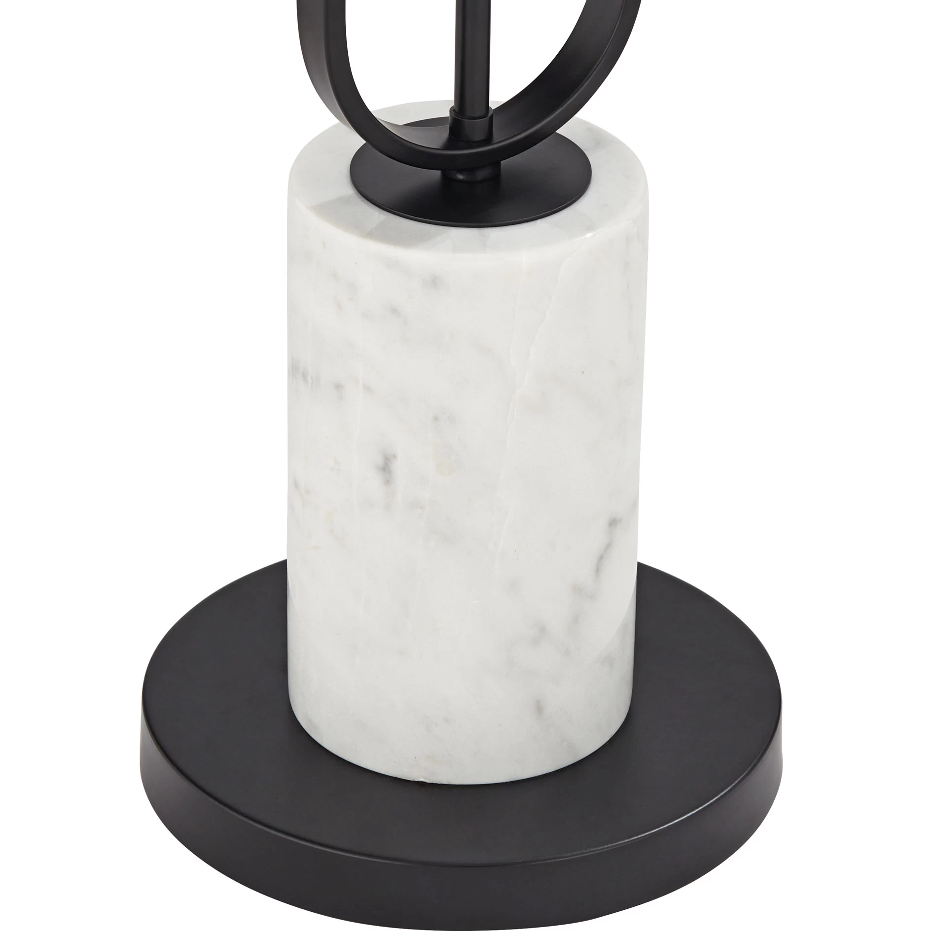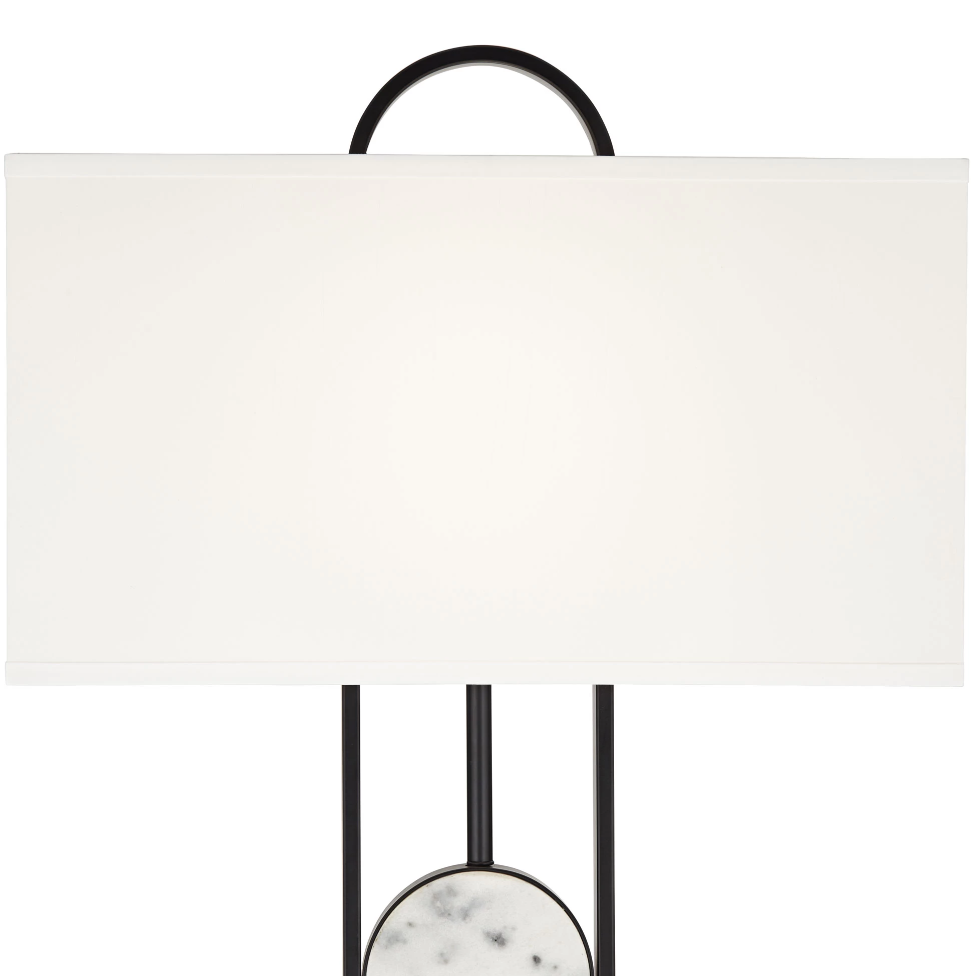 Circles and curves flow together in elegant harmony to give the Eleanor Floor Lamp a sophisticated vibe. Inspired by mid-century decor, Eleanor pairs marble disks with a geometric metal frame available in two finish options. A rectangular base and shantung fabric shade provide an angular contrast to balance the curves of the frame. On/off switch located on socket.