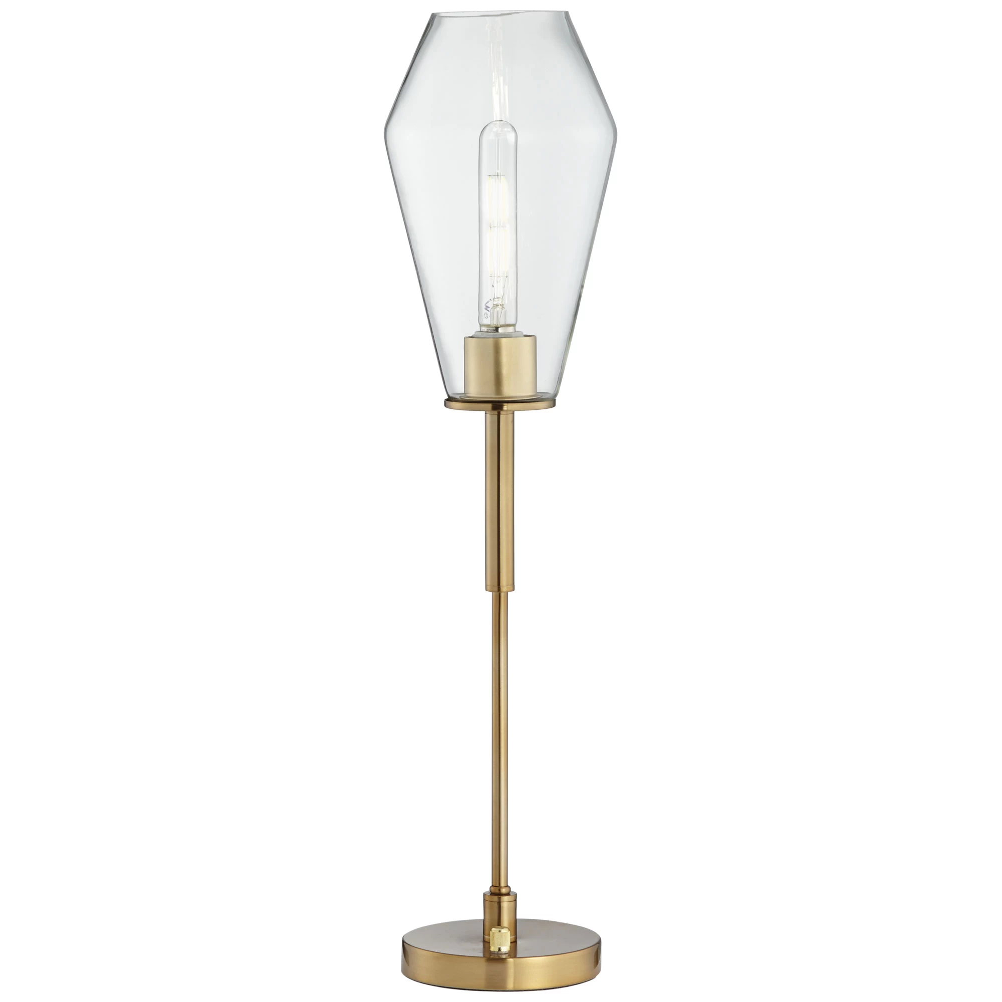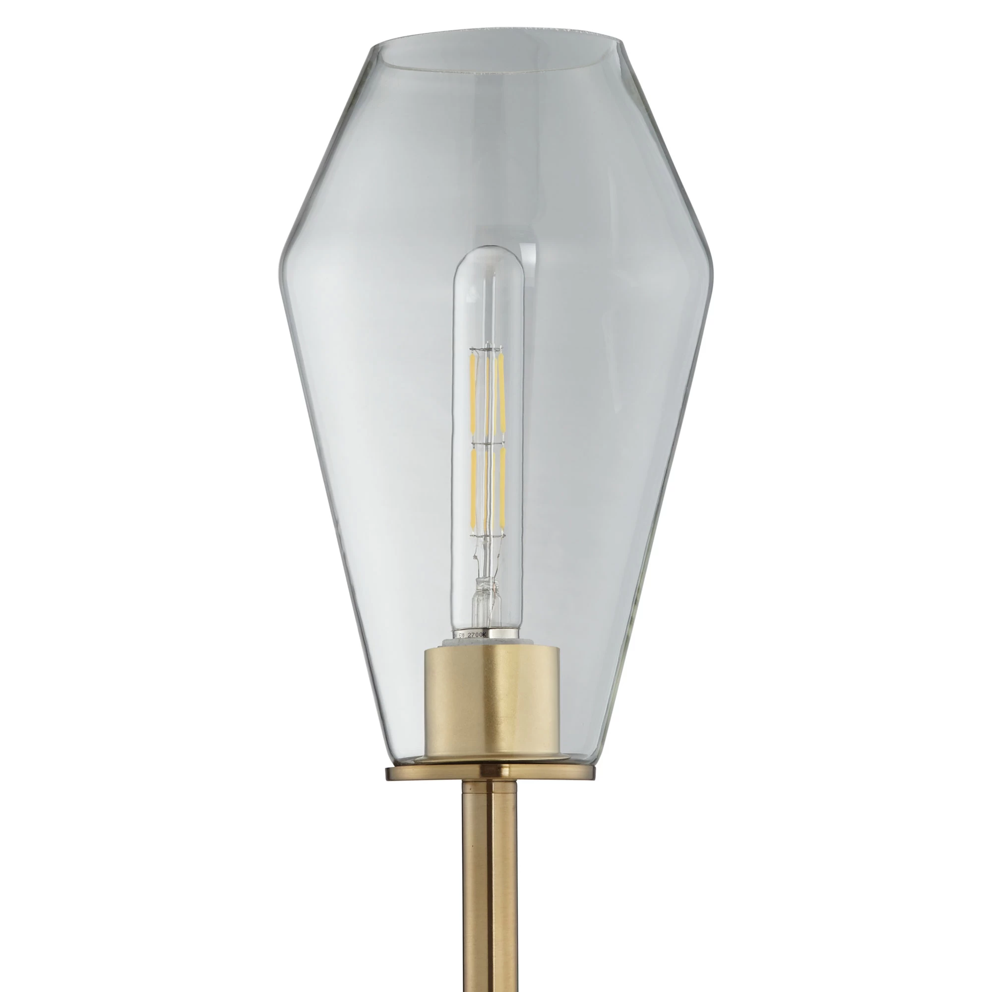 The Ellis Table Lamp Set includes a pair of slender lamps that offer a modern take on traditional candlesticks. A lantern shaped glass shade directs light upwards, and a rotary dimmer switch on the base allows the brightness to be adjusted as needed.