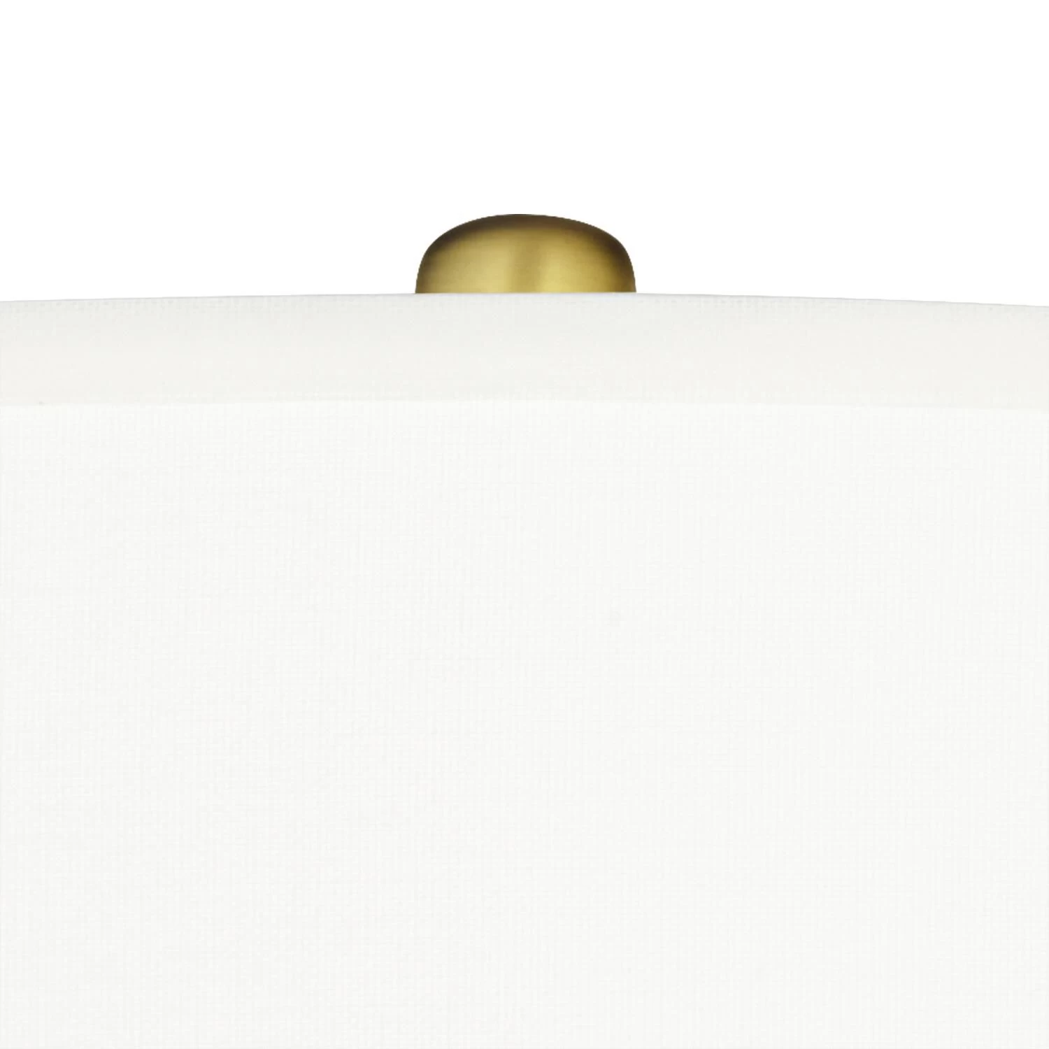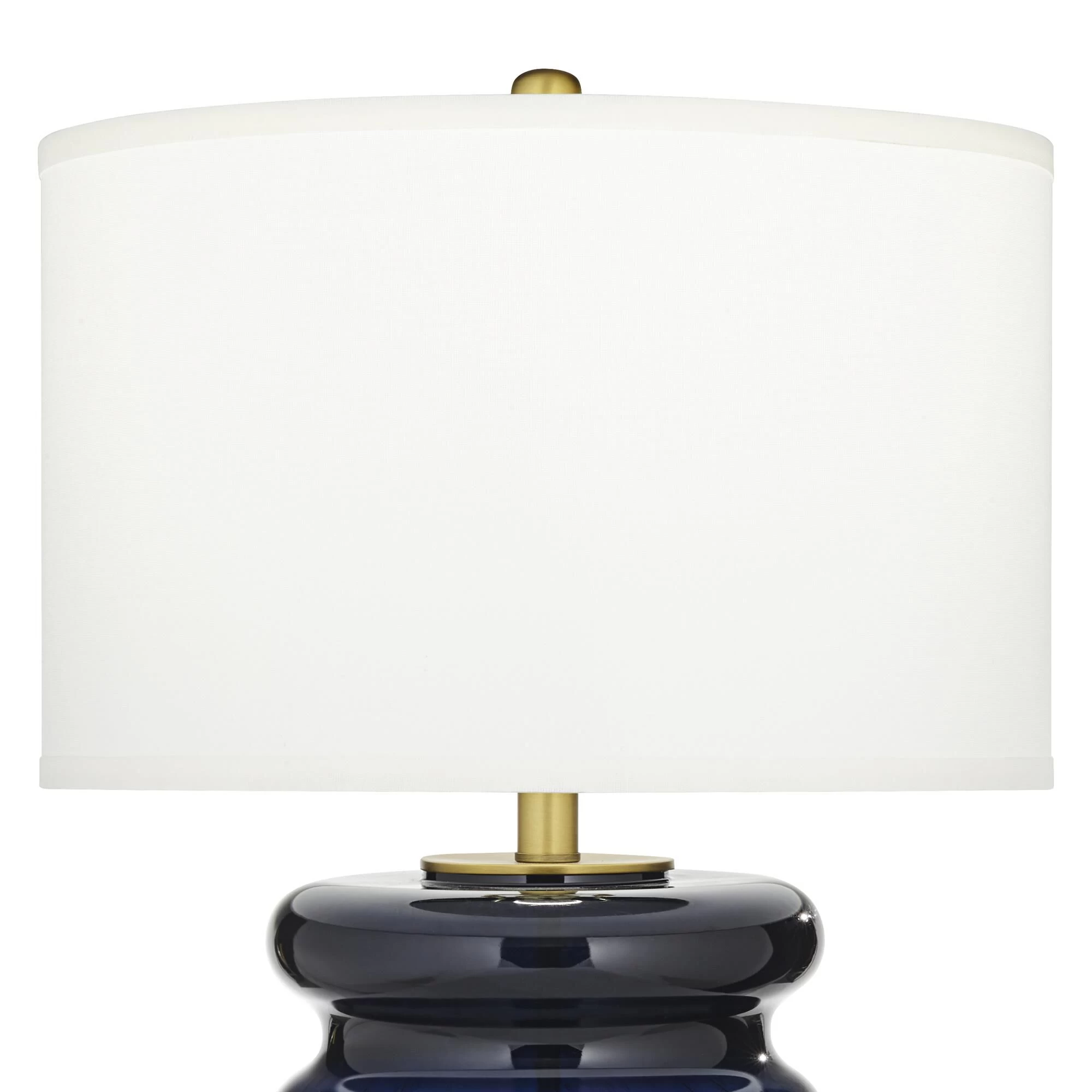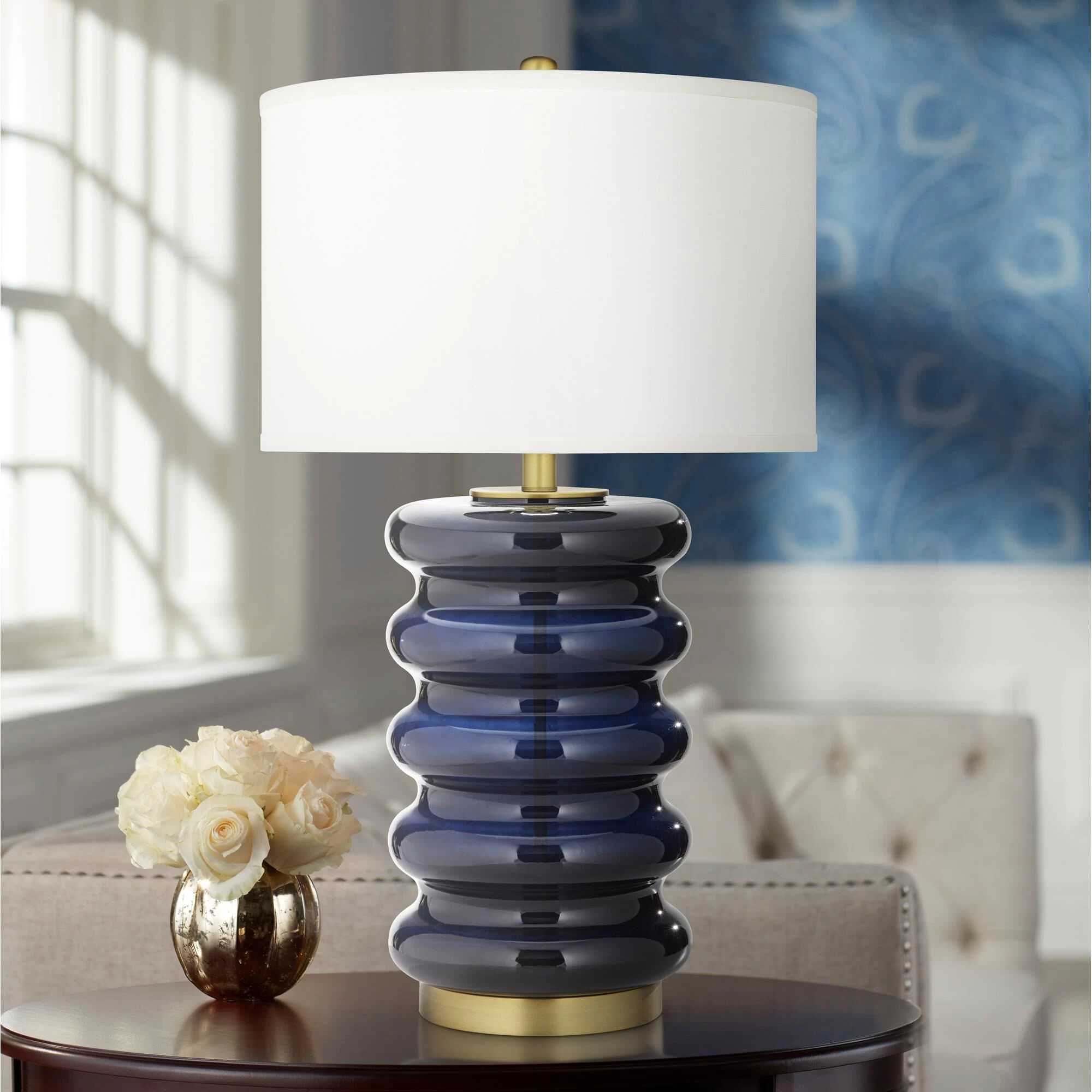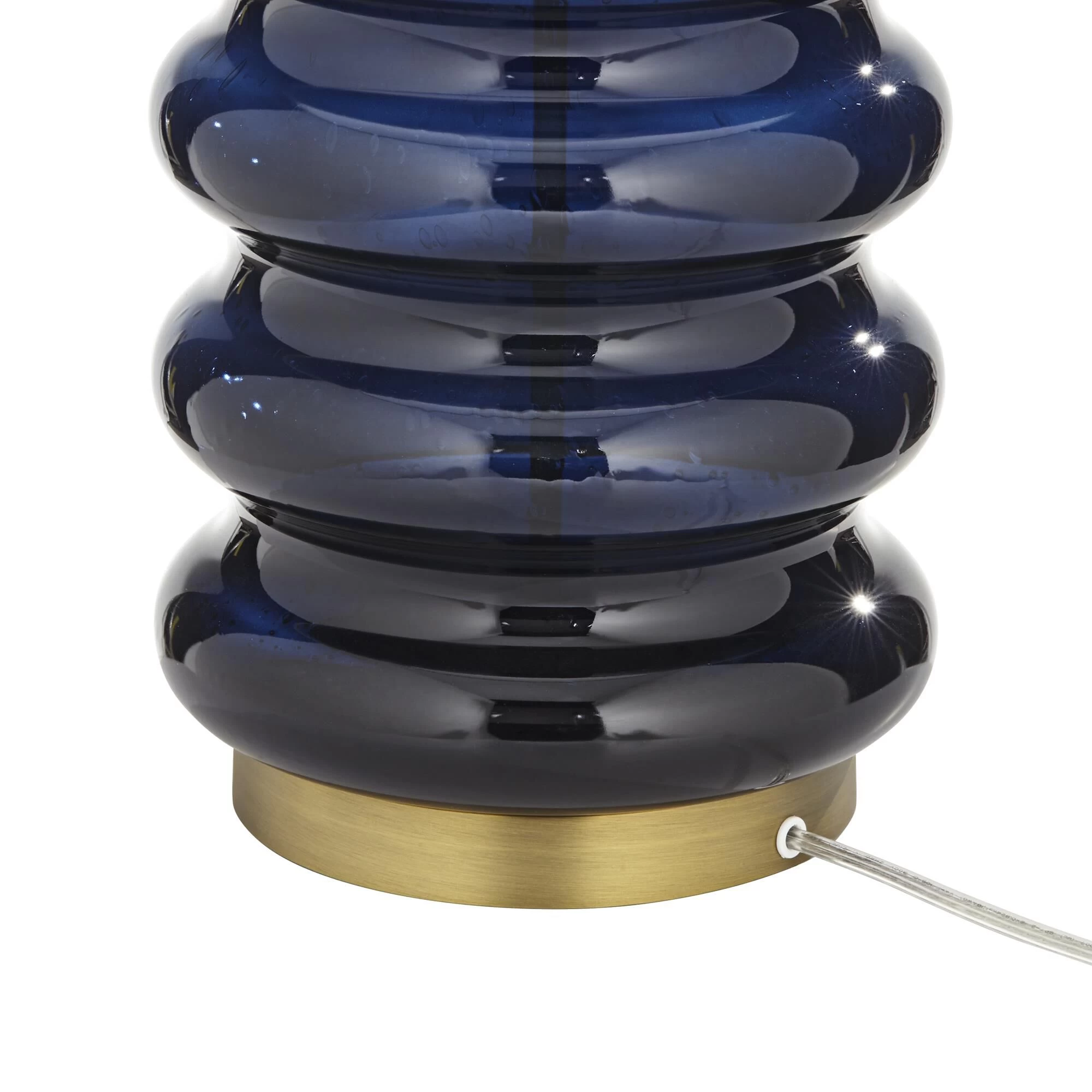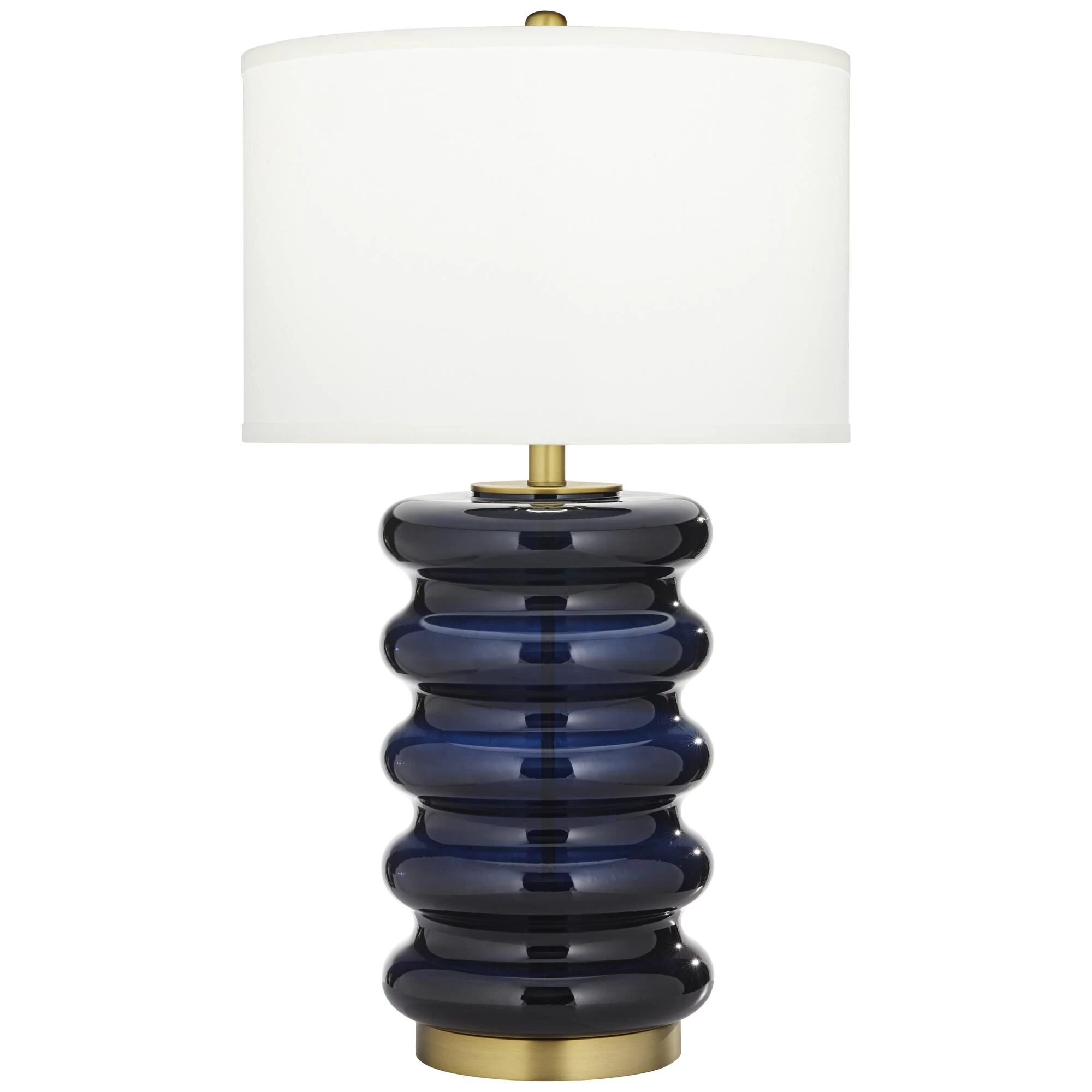 Stacked discs create a compelling silhouette for this contemporary table lamp. In navy blue glass, it gleams in the light while delivering a subtle pop of saturated color. Golden details highlight the base, neck, and finial, while a white drum shade delivers excellent illumination for tasks and ambiance.