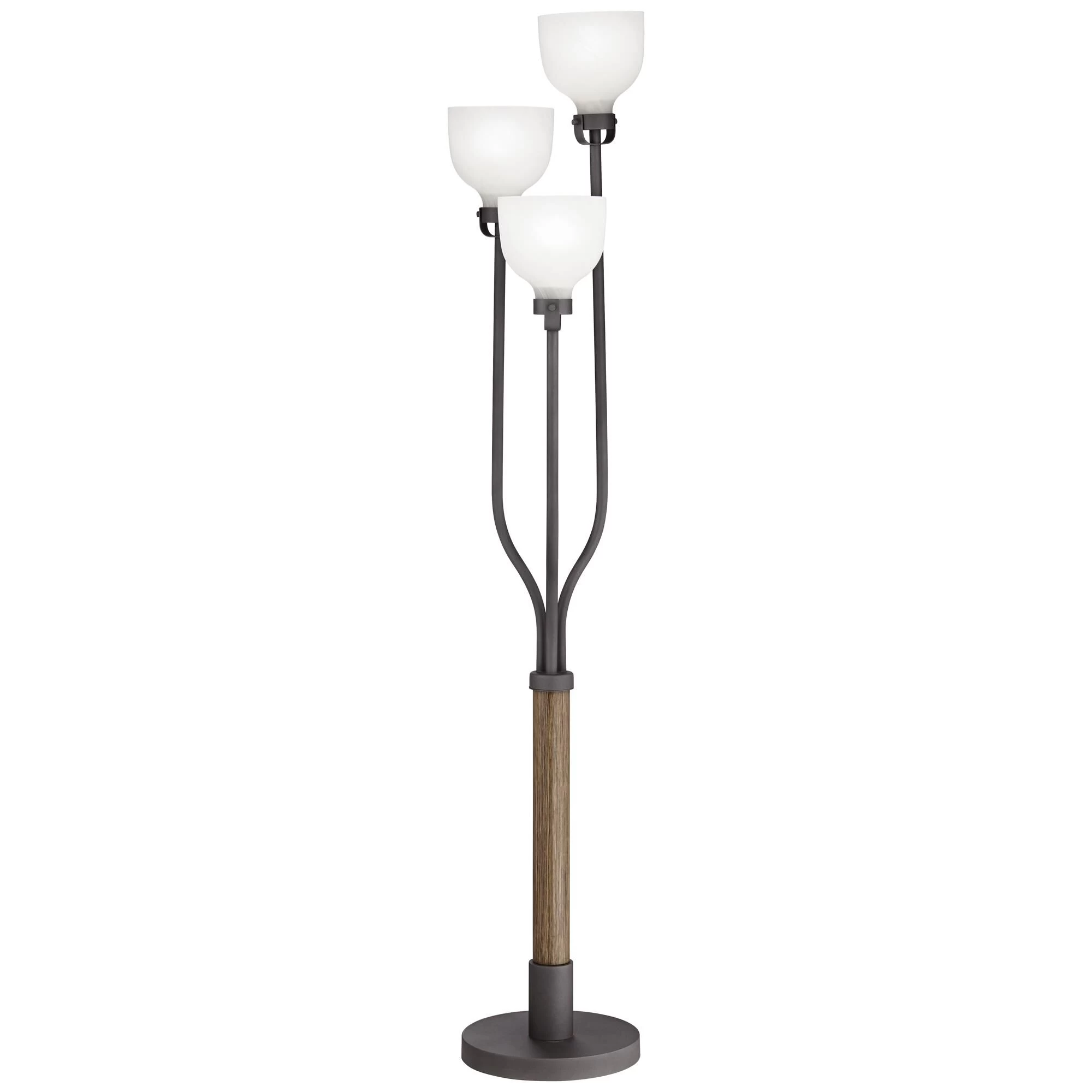 Rich wood grains and alabaster shades make this metal and glass uplight floor lamp a striking choice for the modern living room. Place it anywhere extra light is needed for graceful illumination. The three shades flow from a sleek metal frame in a rich gunmetal finish for a luxe, modern look.
