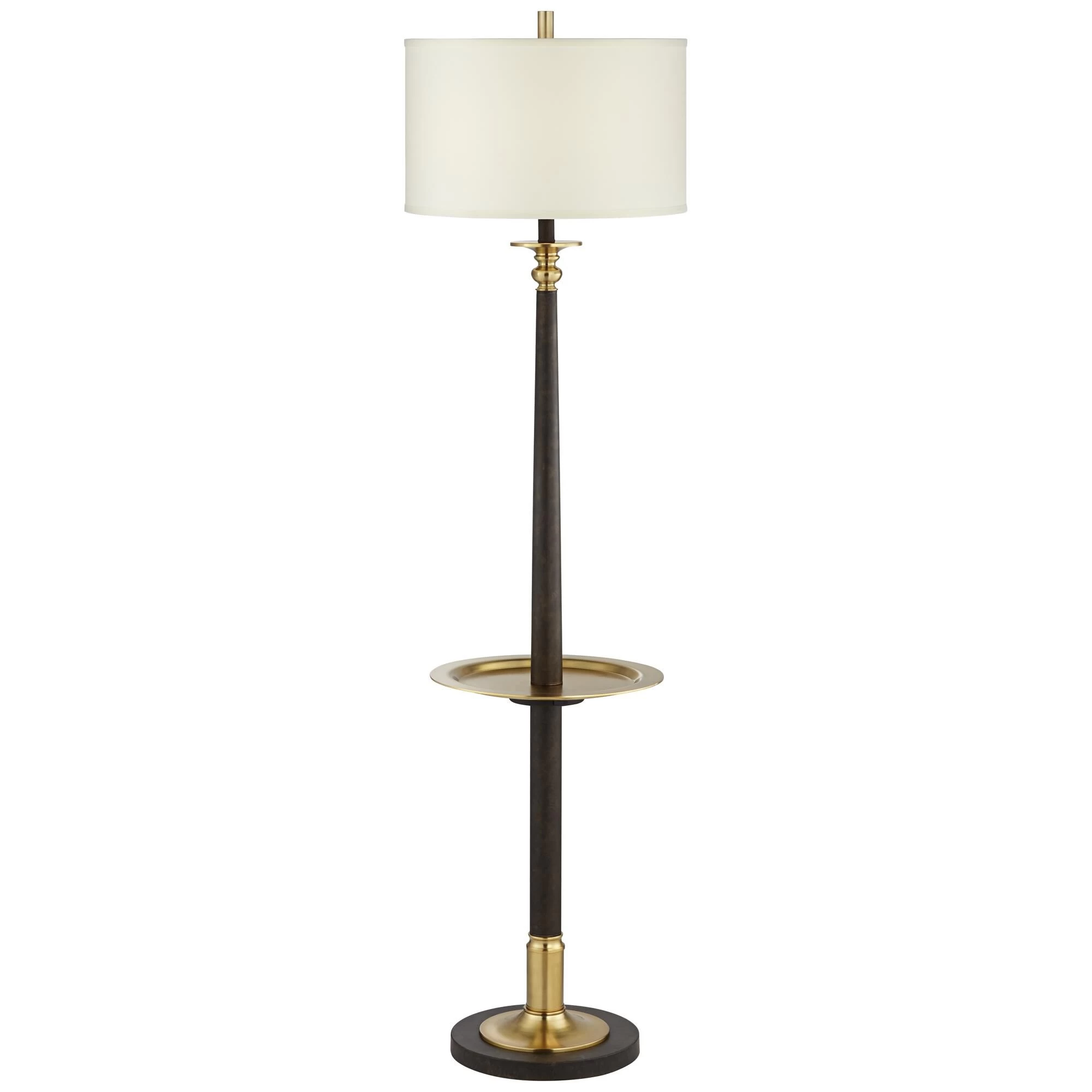 Take traditional elegance to your favorite sitting area with this floor lamp with a tray table. Perfect for multi-functional spaces, the petite tray and additional accents show off a warm golden finish, a great contrast to the bronze body finish of this lamp. The shade on top is a neutral drum, perfect for diffused, ambient illumination.