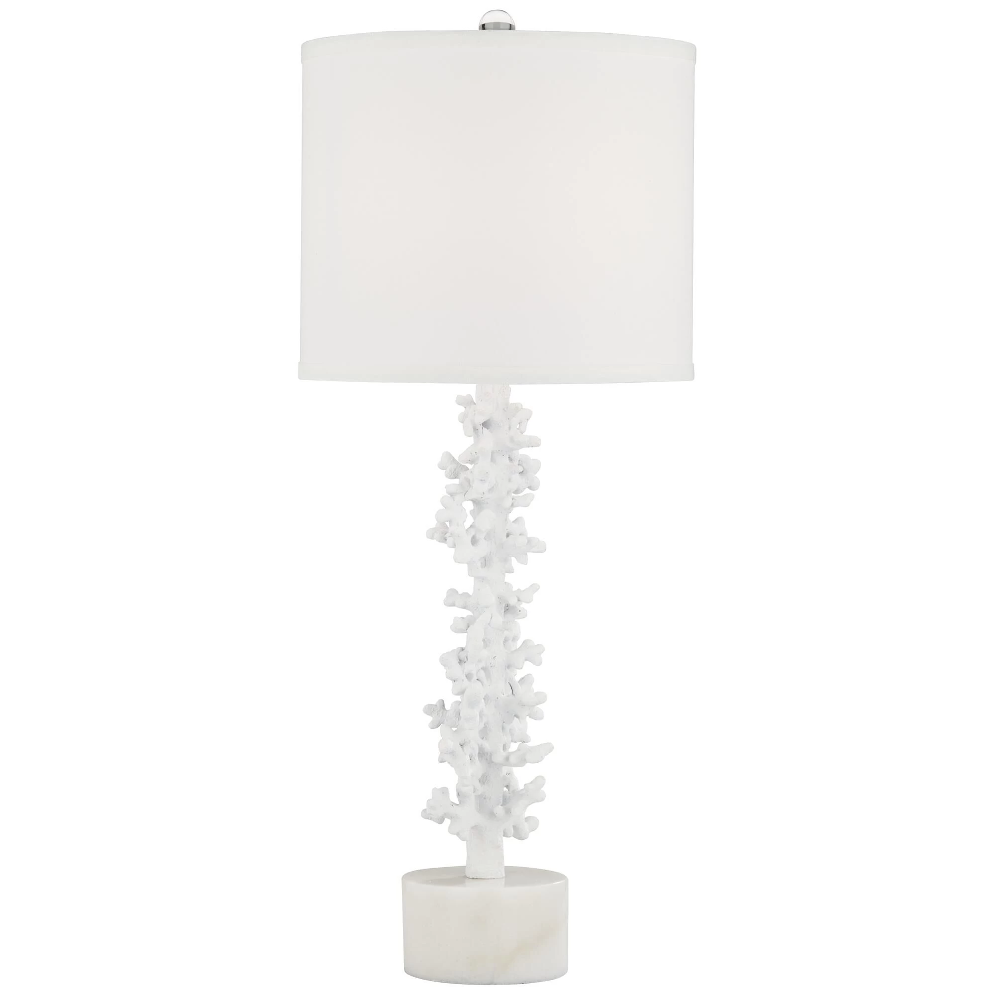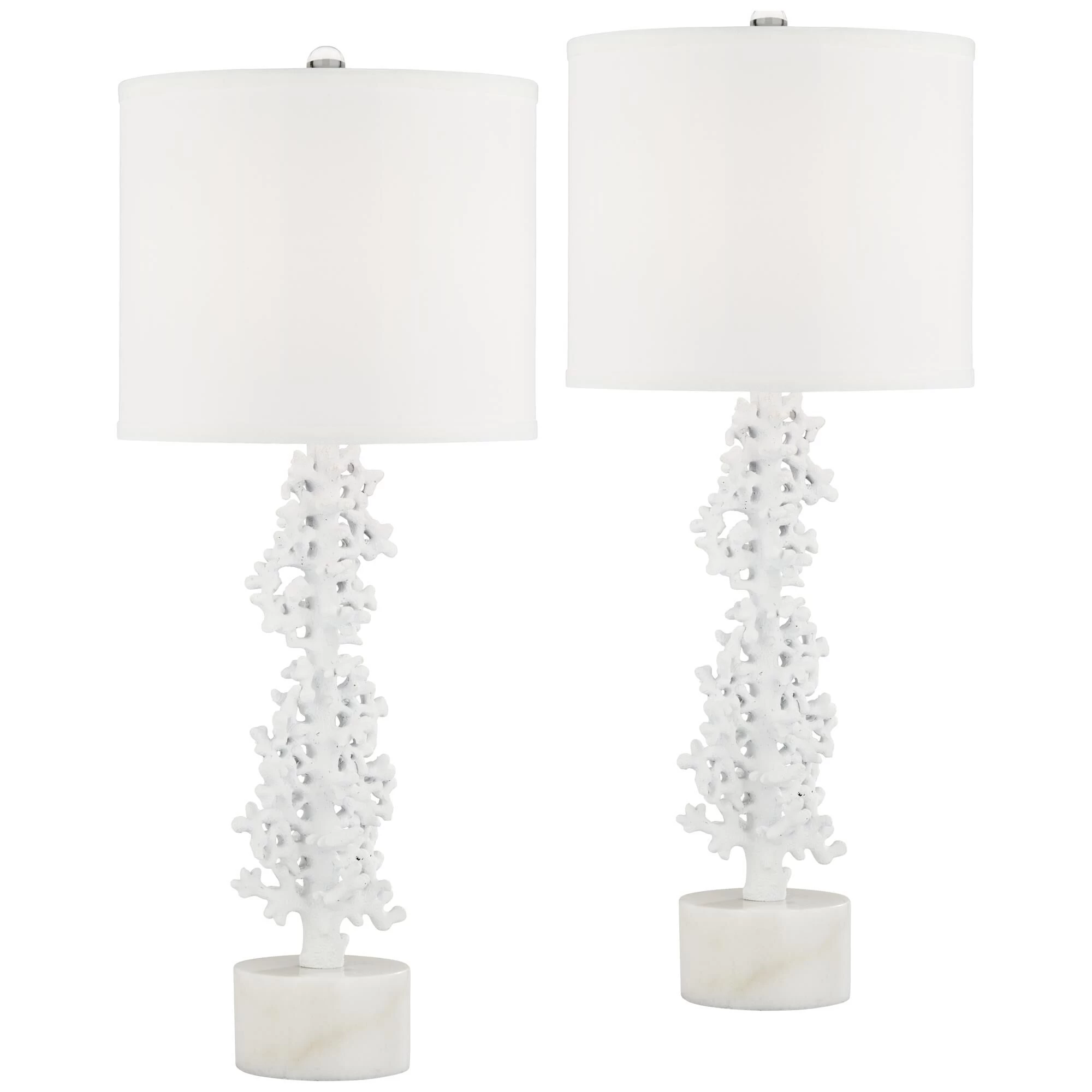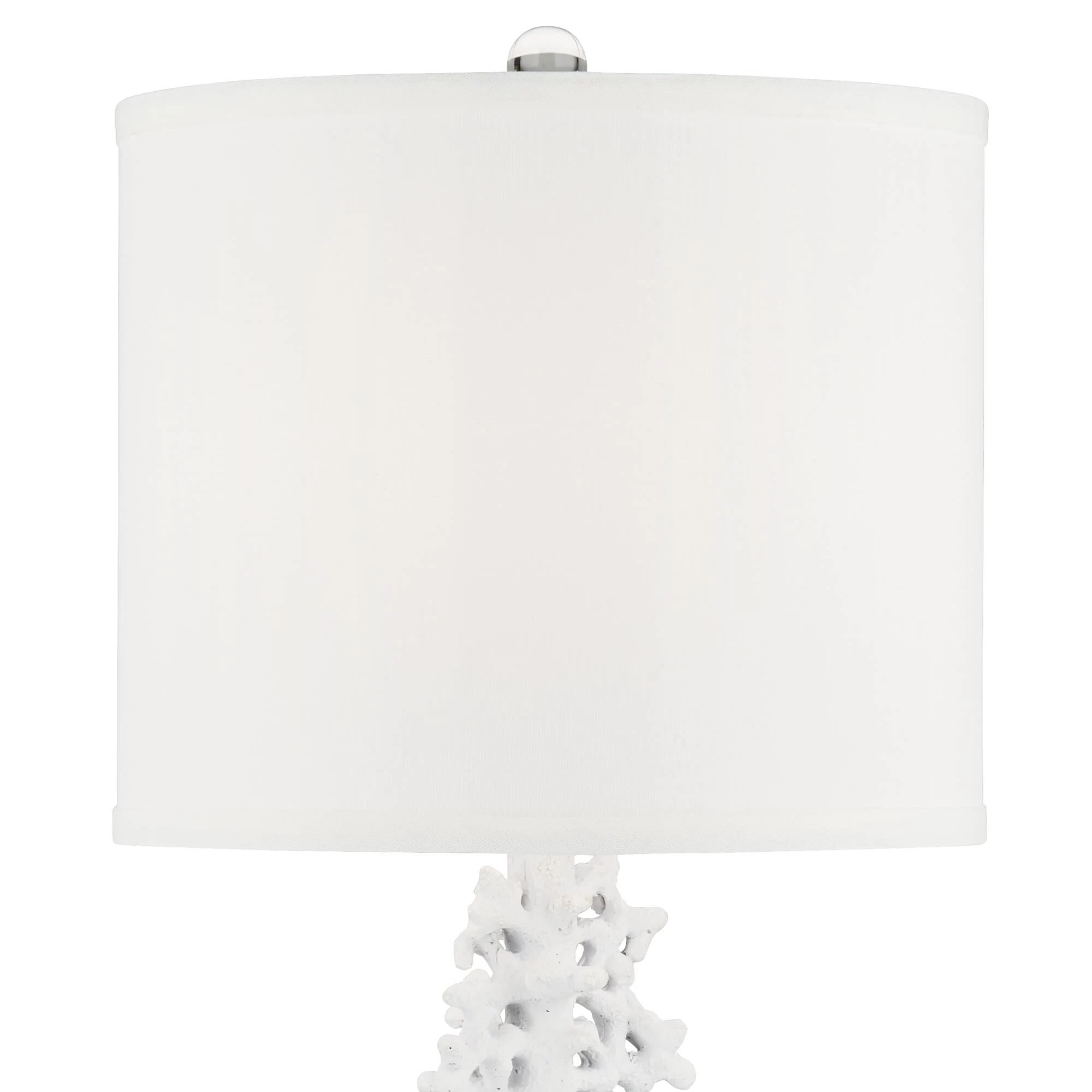 Put the finish touches on a coastal living space with this charming set of two faux coral table lamps. Each features a drum shade and a white finish for a monochromatic, textured look and feel. Tall, round bases resemble stone and clear ball finials ensure a polished final touch for each lamp.