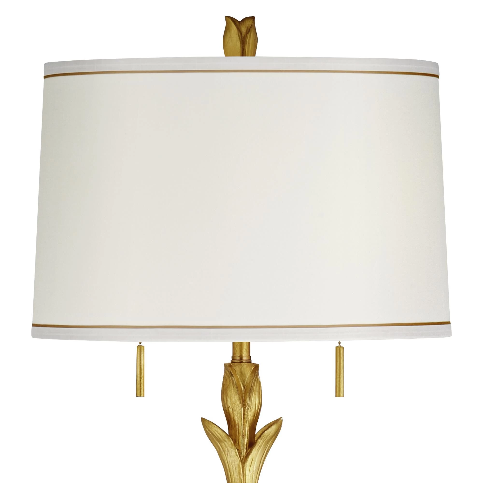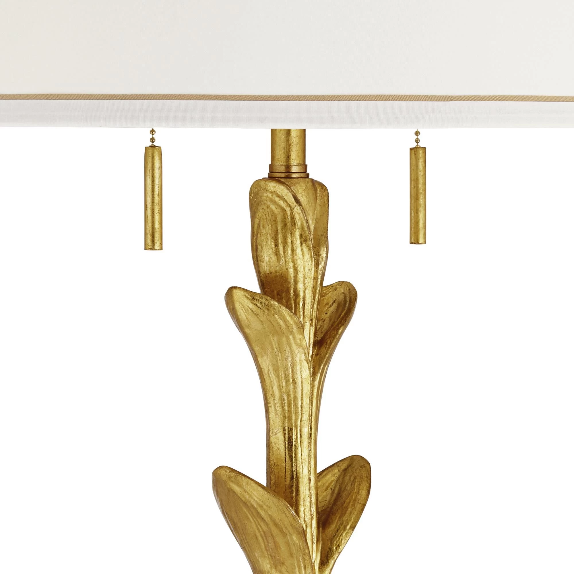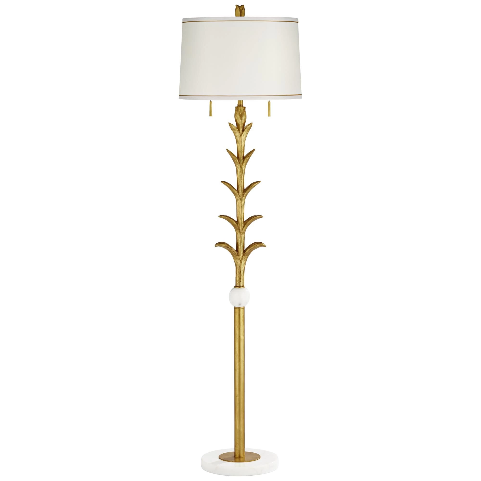 Imbued with tropically inspired elegance, this gorgeous gold floor lamp is an attention-getting in any living space. Its frond-like details and rich gold leaf finish ensure a rich, dimensional look that offers flam appeal to surrounding decor. The two-light design includes dual pull chains tucked under a neutral drum shade while white accents bring a polished finishing touch to the lamp.