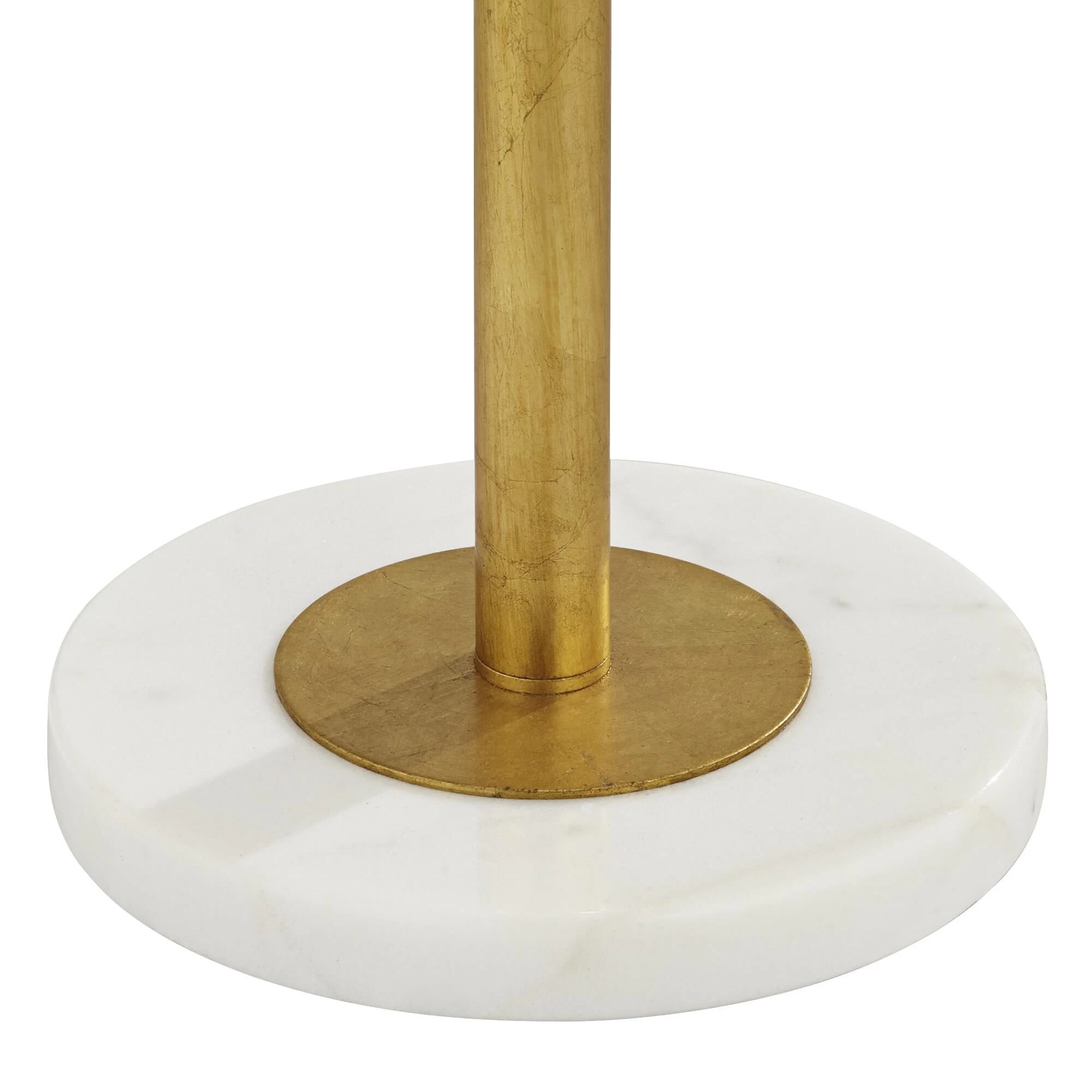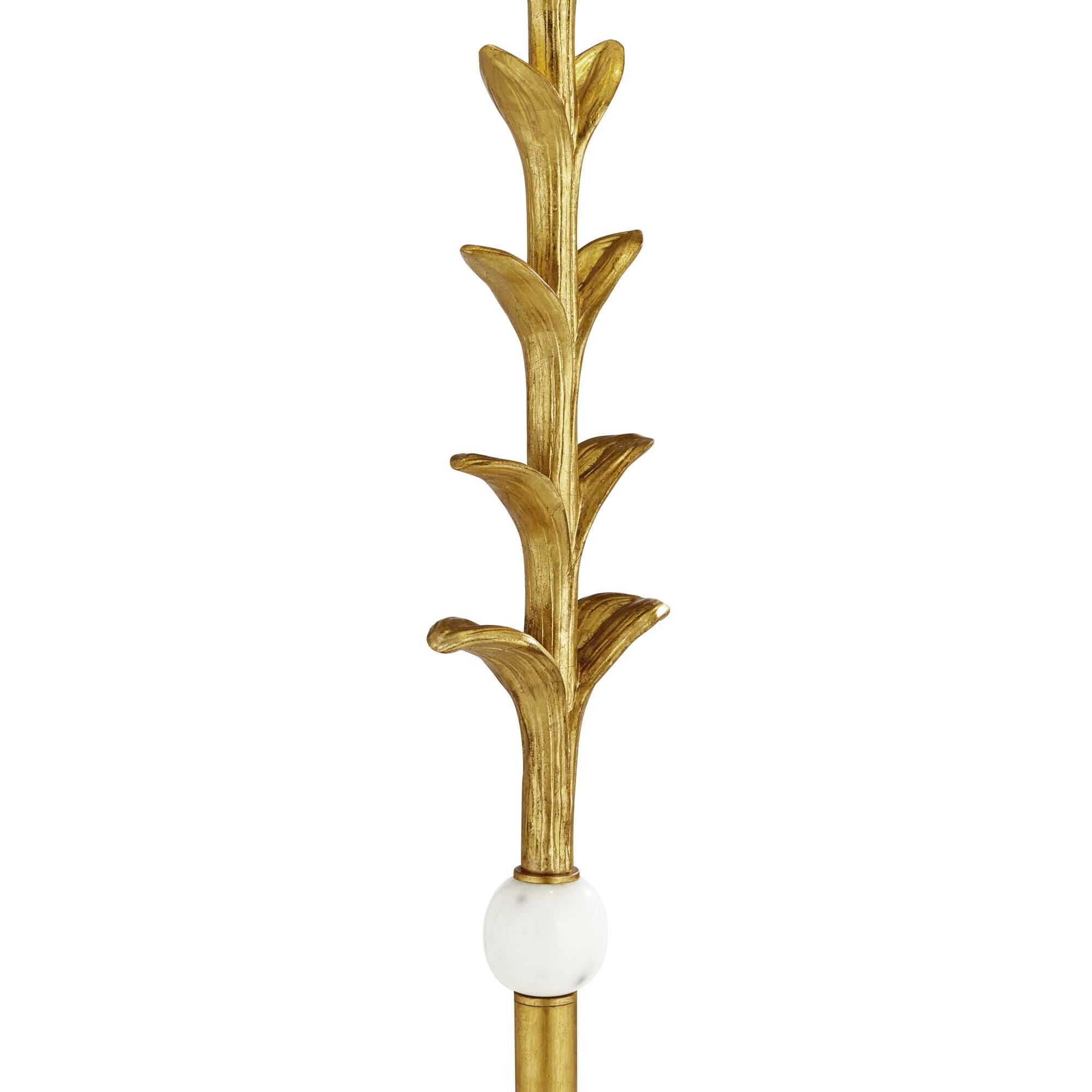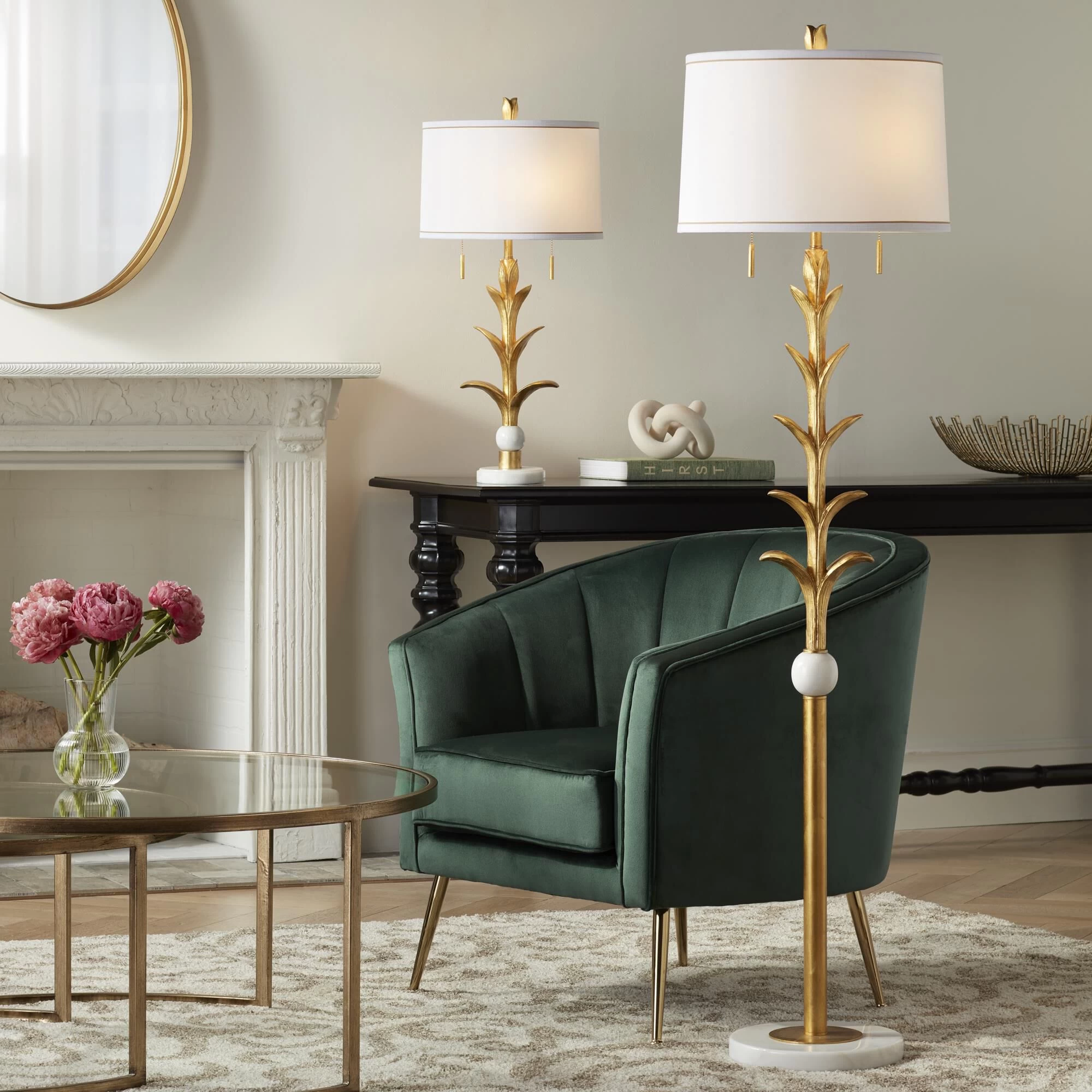 Imbued with tropically inspired elegance, this gorgeous gold floor lamp is an attention-getting in any living space. Its frond-like details and rich gold leaf finish ensure a rich, dimensional look that offers flam appeal to surrounding decor. The two-light design includes dual pull chains tucked under a neutral drum shade while white accents bring a polished finishing touch to the lamp.