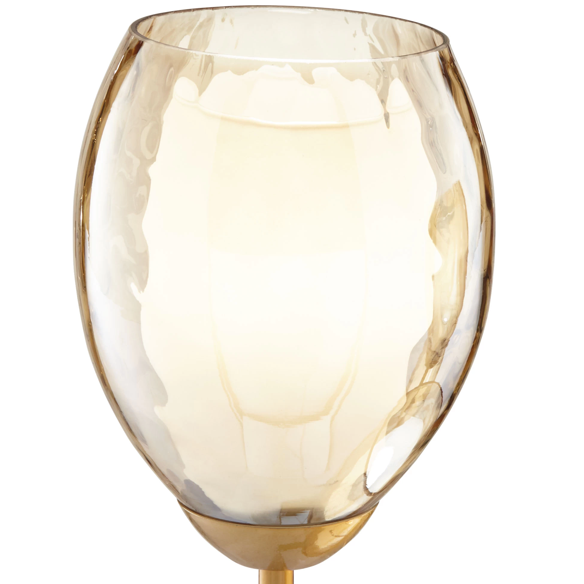 A mid-century modern living room will be instantly elevated by the Goldcrest Floor Lamp. Sleek curves support textured glass shades with a champagne tint for a look that exudes retro charm. A warm gold finish adds an inviting touch to this stylish statement piece. On/off footswitch located on cord.
