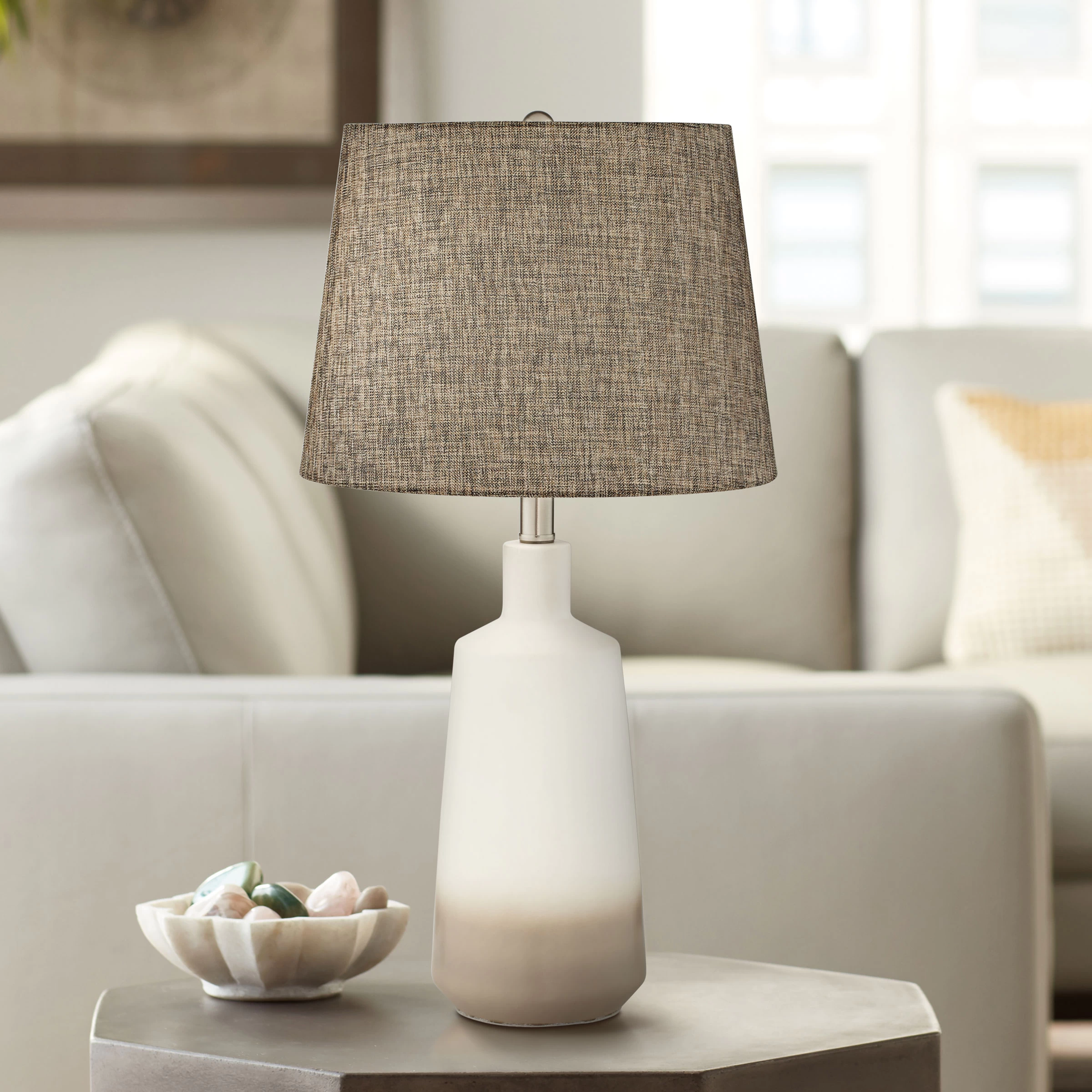Elegant, earthy colors set the tone for the Harlow Table Lamp. The ceramic body features a white finish with a taupe accent, and a brown linen shade completes the look with a coordinating color.