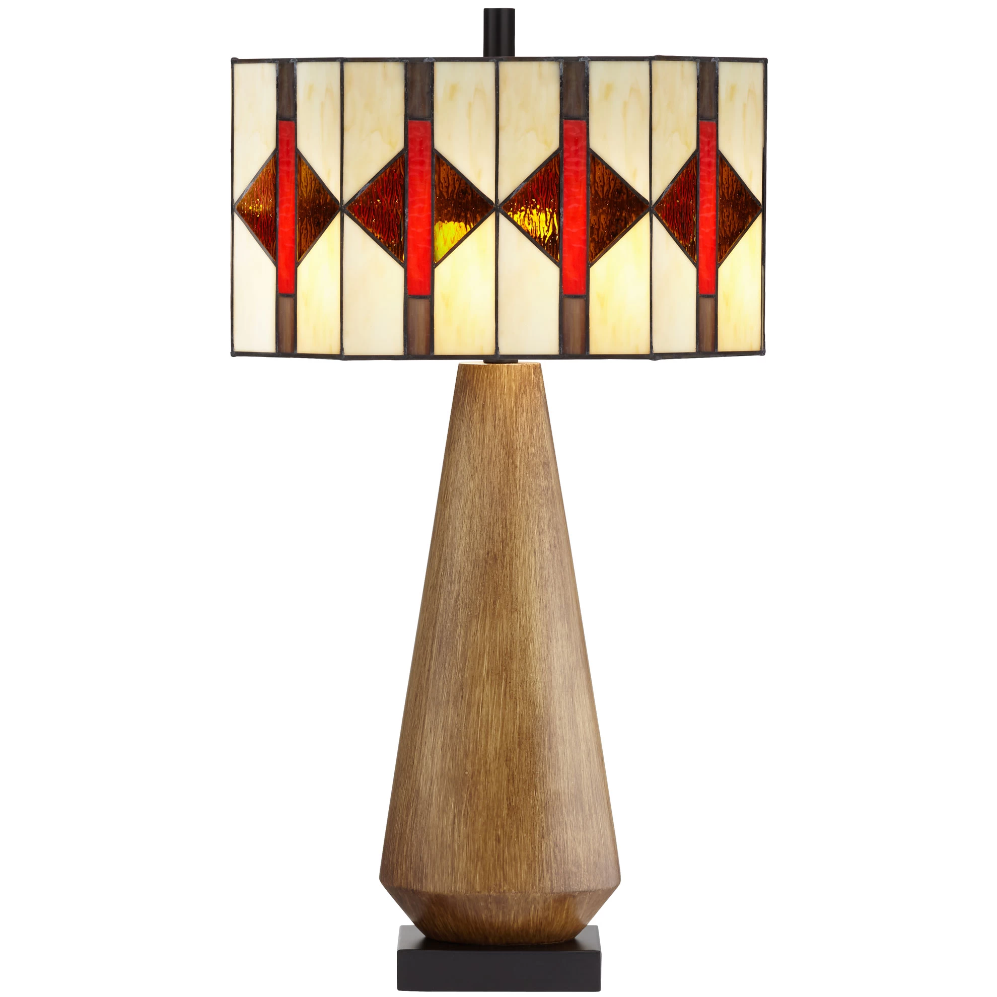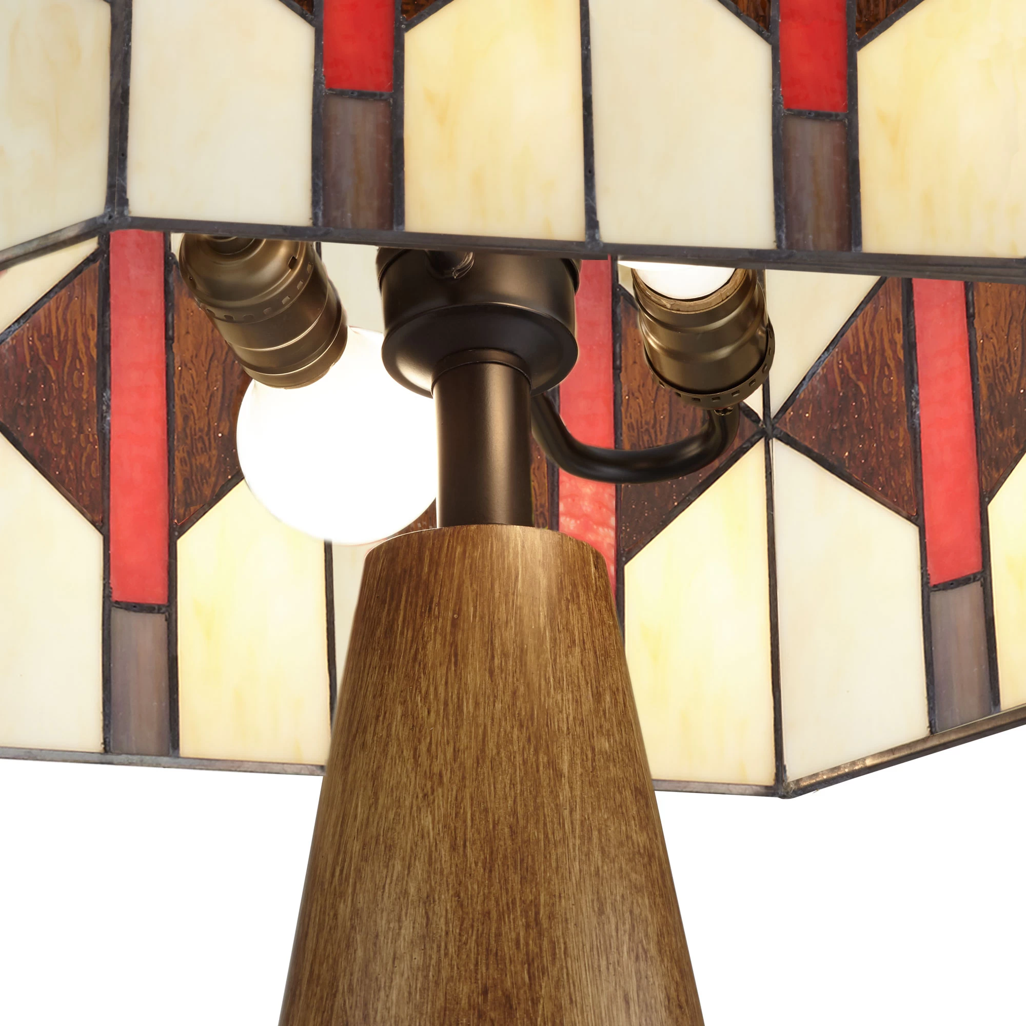 The Haywood Table Lamp boasts a colorful art glass shade that evokes the glow of fiery embers when illuminated. Its hexagonal shape offers a unique geometric accent. A tapered resin body with a faux wood finish and black metal foot give the piece a transitional look that complements a variety of interior styles.