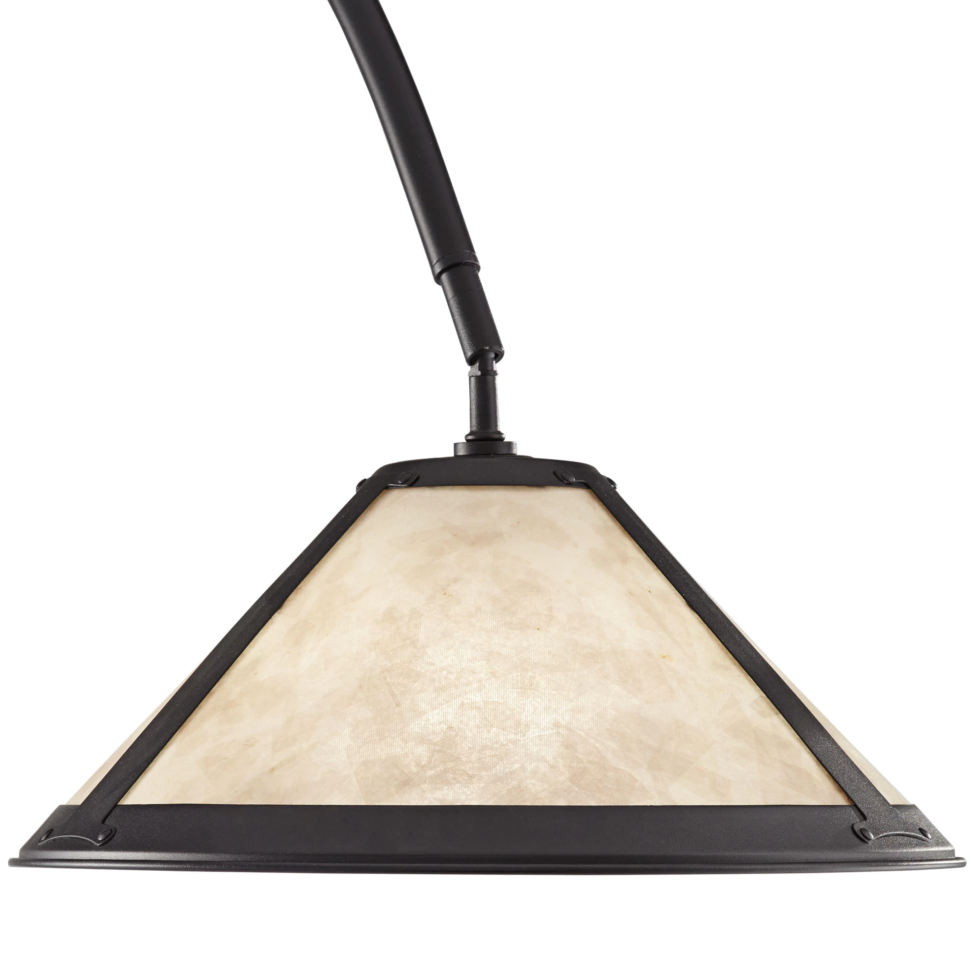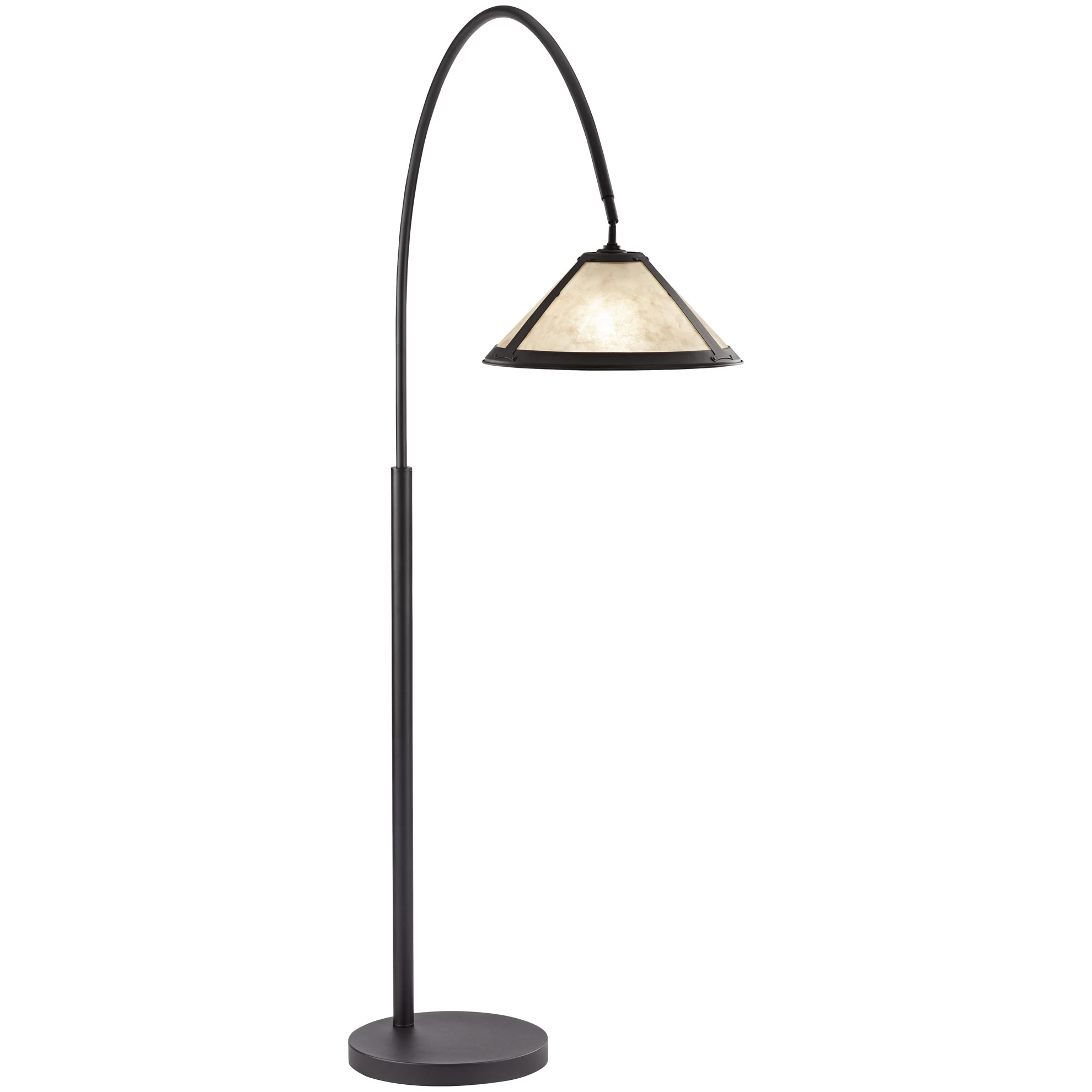 The Hewitt Floor Lamp offers a modern edge with a thin silhouette, arcing curved arm and black powder coat finish. The mica shade adds a natural touch and allows Hewitt to transition easily into a variety of interior styles. An on/off footswitch is installed on the cord.