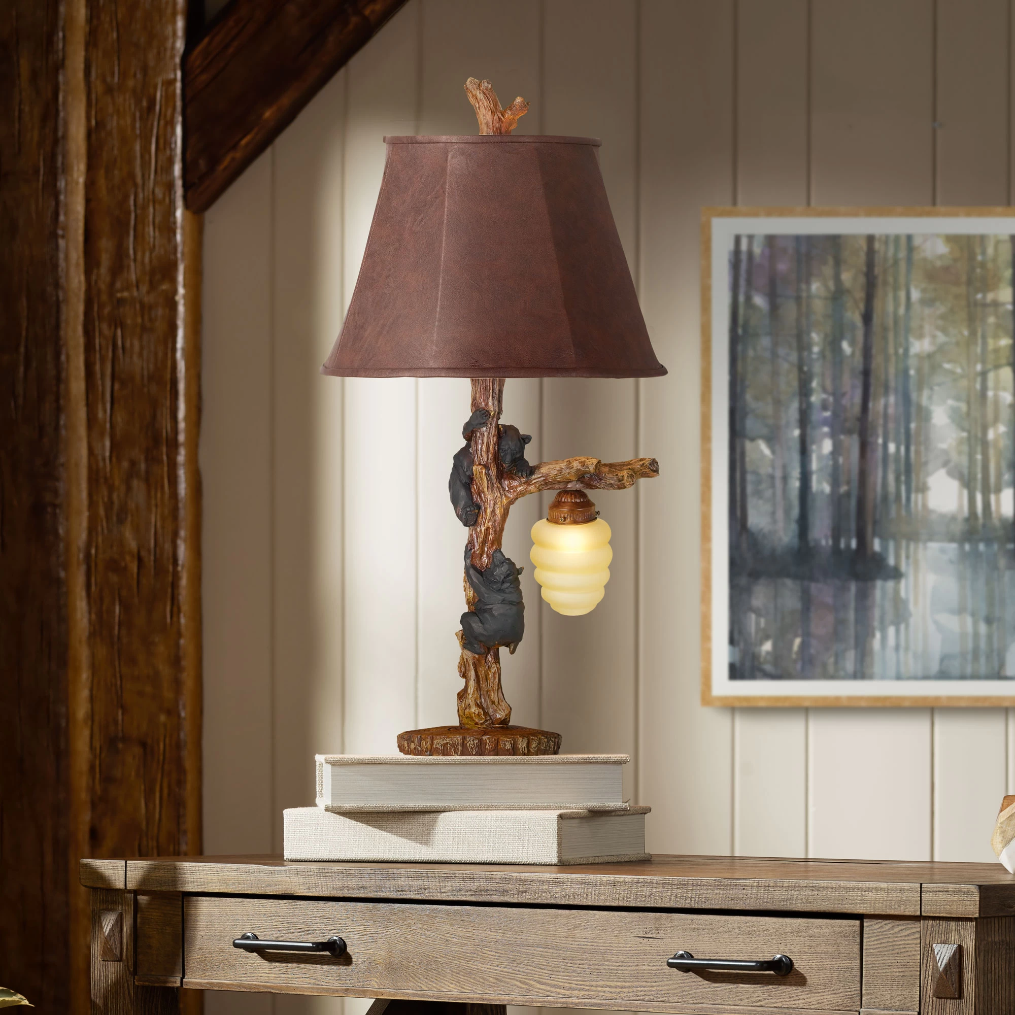 Add a charming touch to rustic or country-inspired decor with the Honey Bear Table Lamp. The base of the lamp features a pair of bears climbing a faux wood tree trunk in search of honey. The attached nightlight is sculpted into the shape of a beehive for a playful accent. A faux leather bell shade adds a rich texture to the piece.