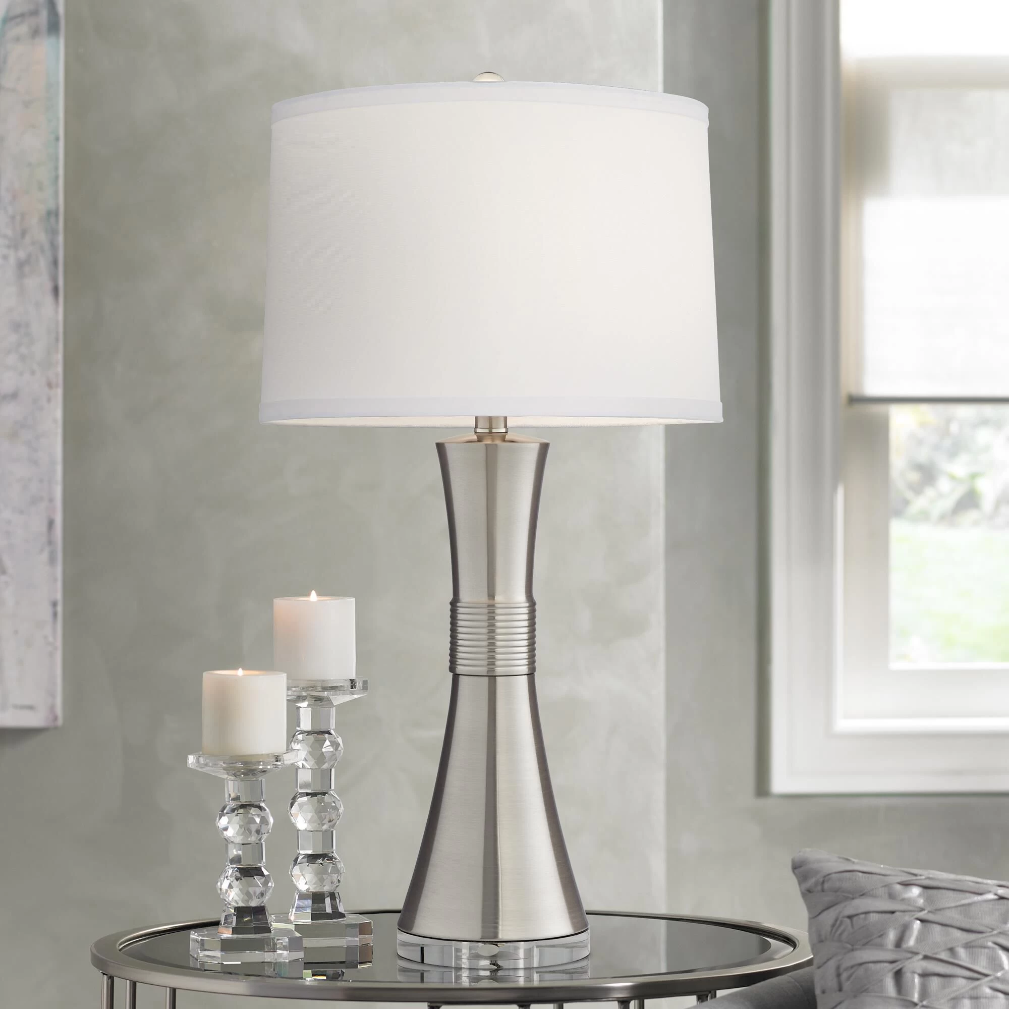 This contemporary table lamp is ahead of its time with the brushed nickel base. The sleek design has a ridged design in the middle of the base that adds more texture to the clean lines. The base sits on top of a crystal foot and is topped with a white round shade.