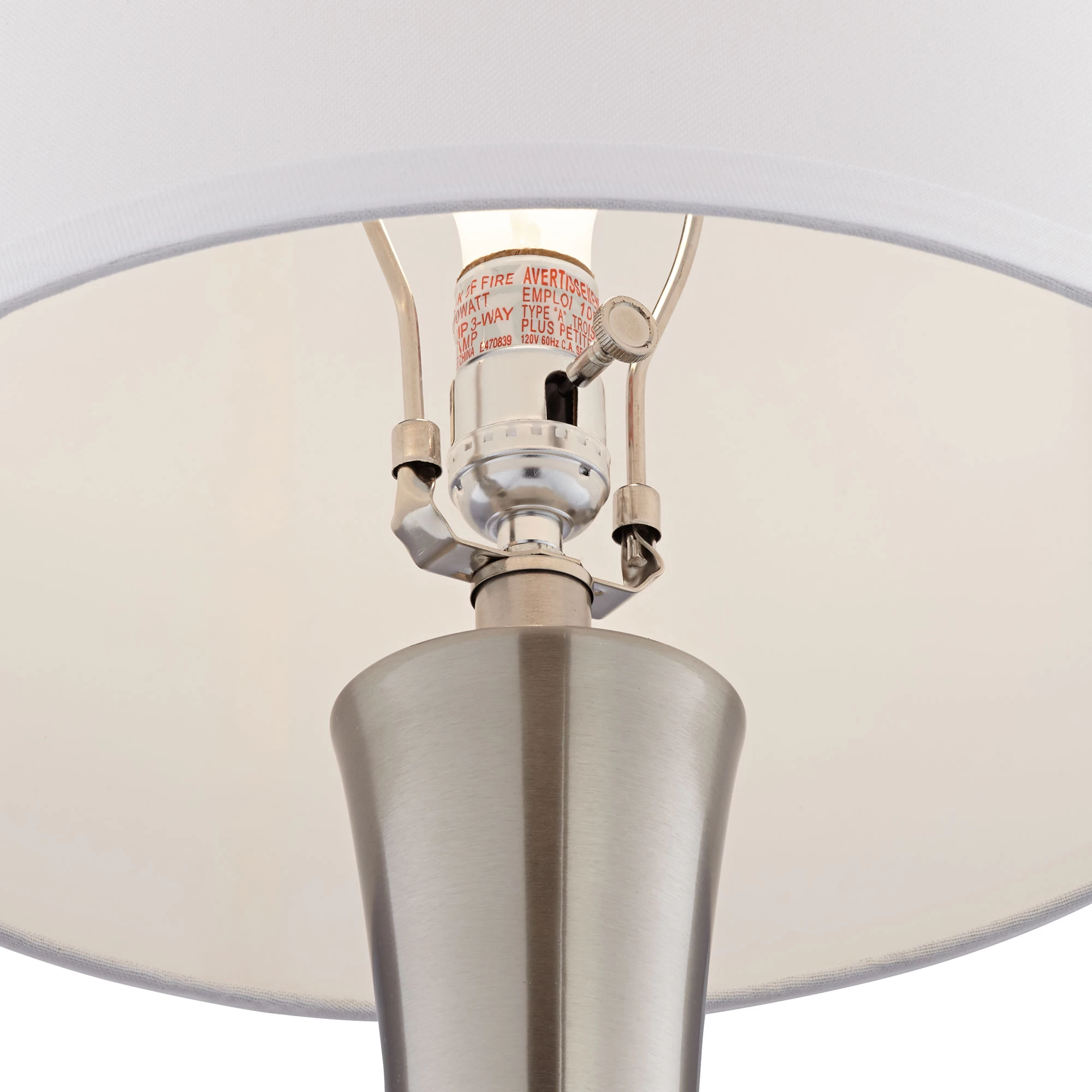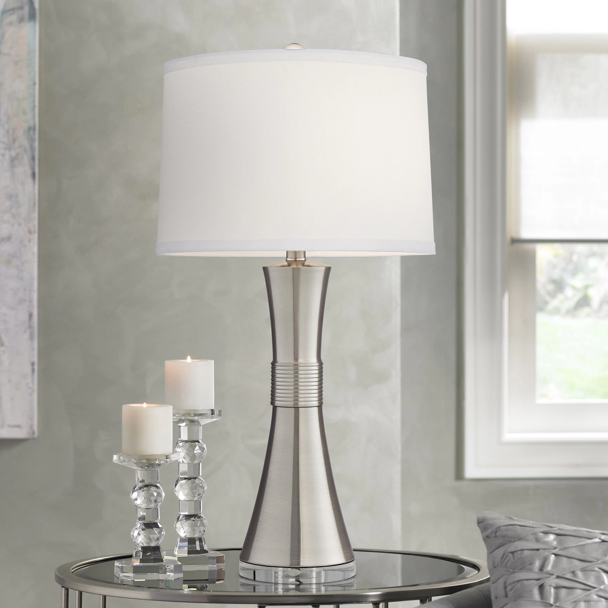 The Hudson Table Lamp offers a contemporary design with a concave base in Brushed Nickel finish. Ridges in the center of the base add texture to the clean lined silhouette. A crystal foot and round linen shade add a sophisticated accent. On/off switch on socket.