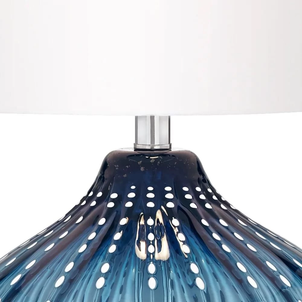 Richly saturated blue brings a colorful touch to this contemporary art glass table lamp. Dramatic curves create a multi-tonal look while smoky white dotted lines create the illusion of ribs for added dimension. A silver tone accent finish and a white faux silk drum shade complete this stellar art glass table lamp.