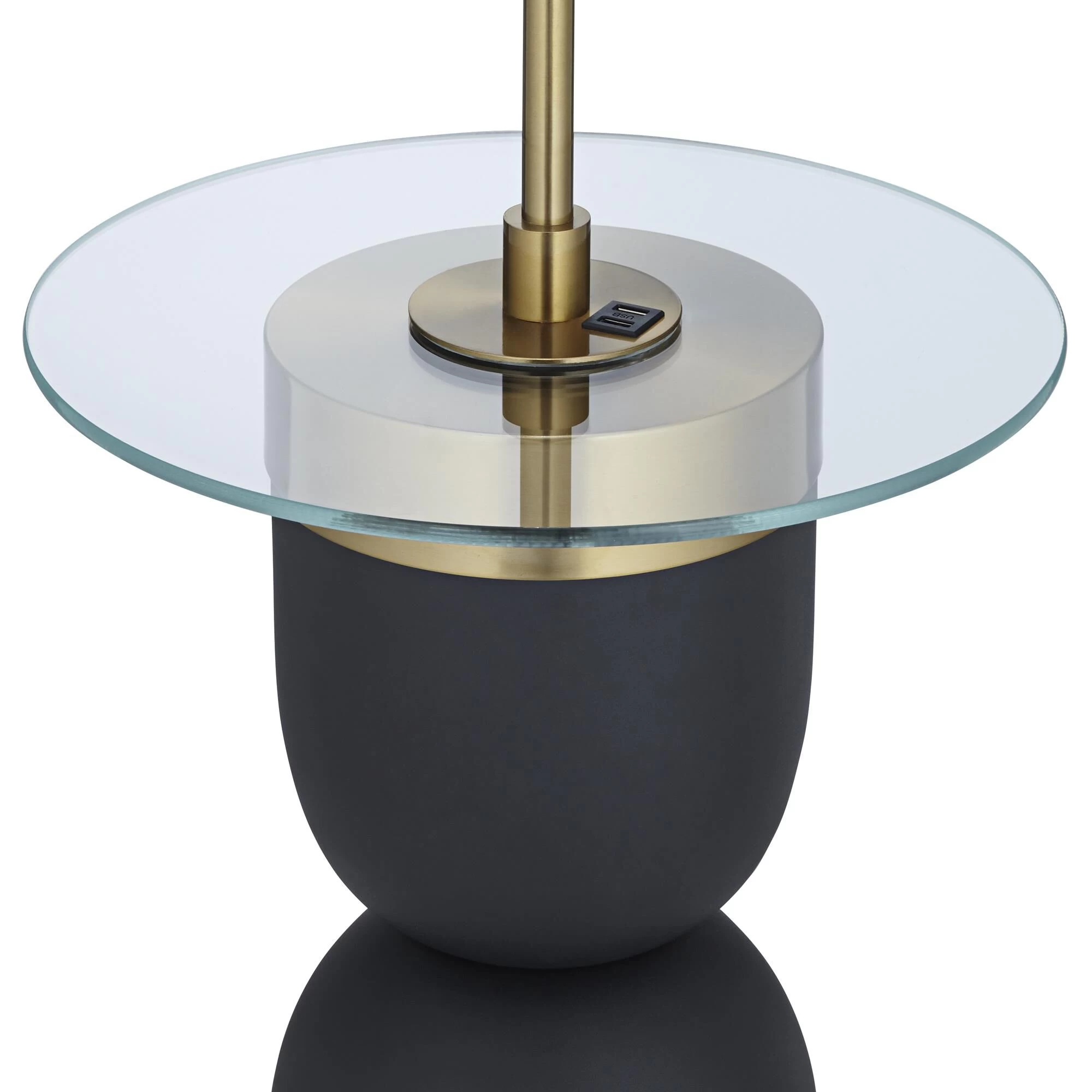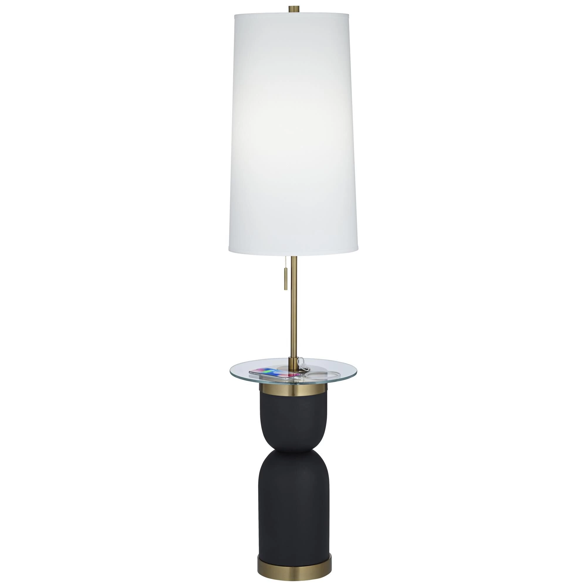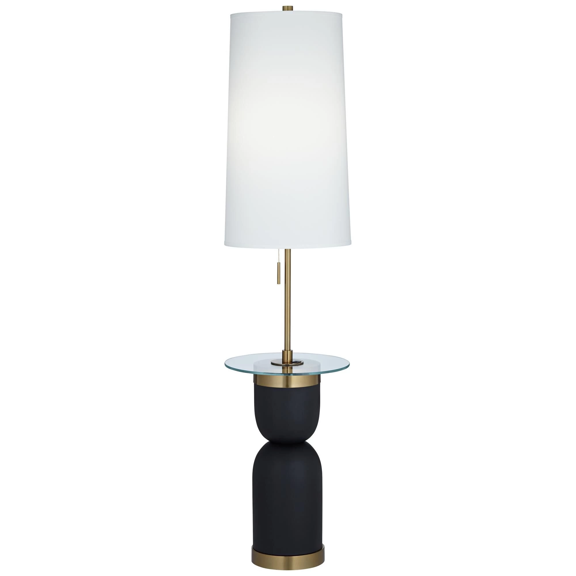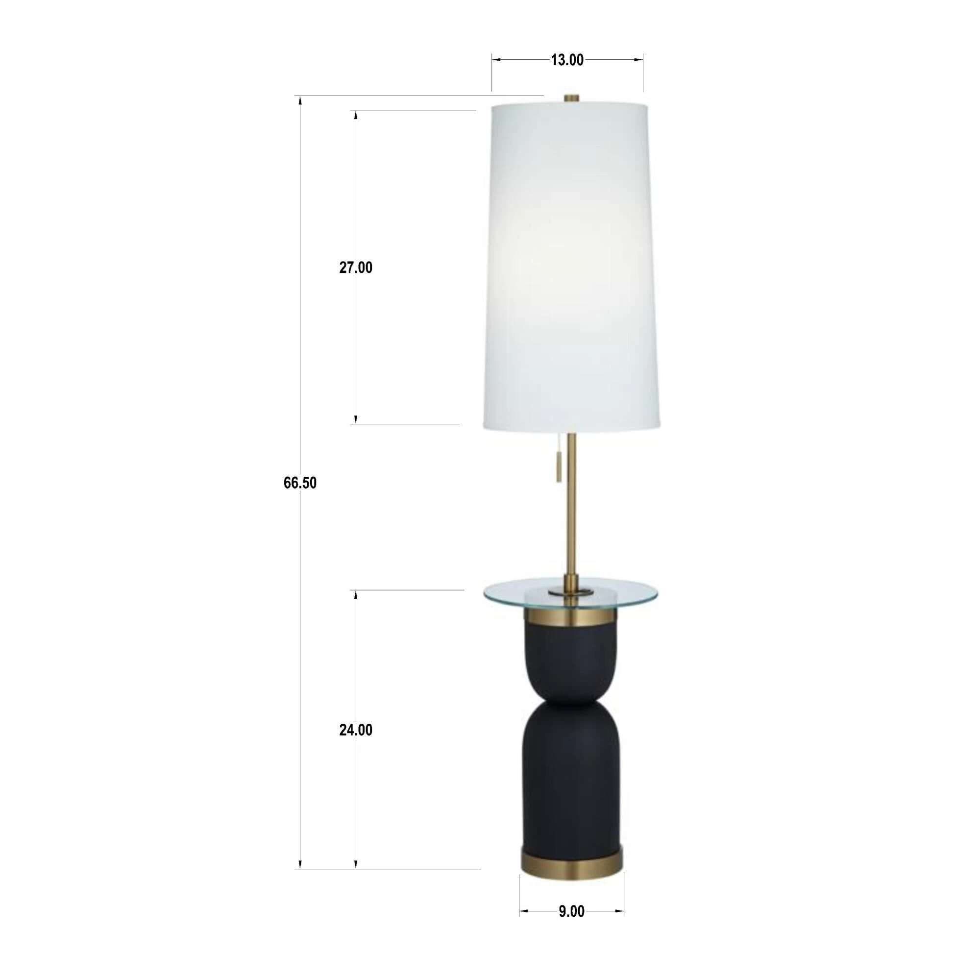 A bold hourglass base brings formality and sophistication to this contemporary metal floor lamp. Complete with a clear tray table, it’s the perfect addition to an elegant sitting area. A black finish is accentuated with hints of gold and a tall shade on top only enhances its verticality.