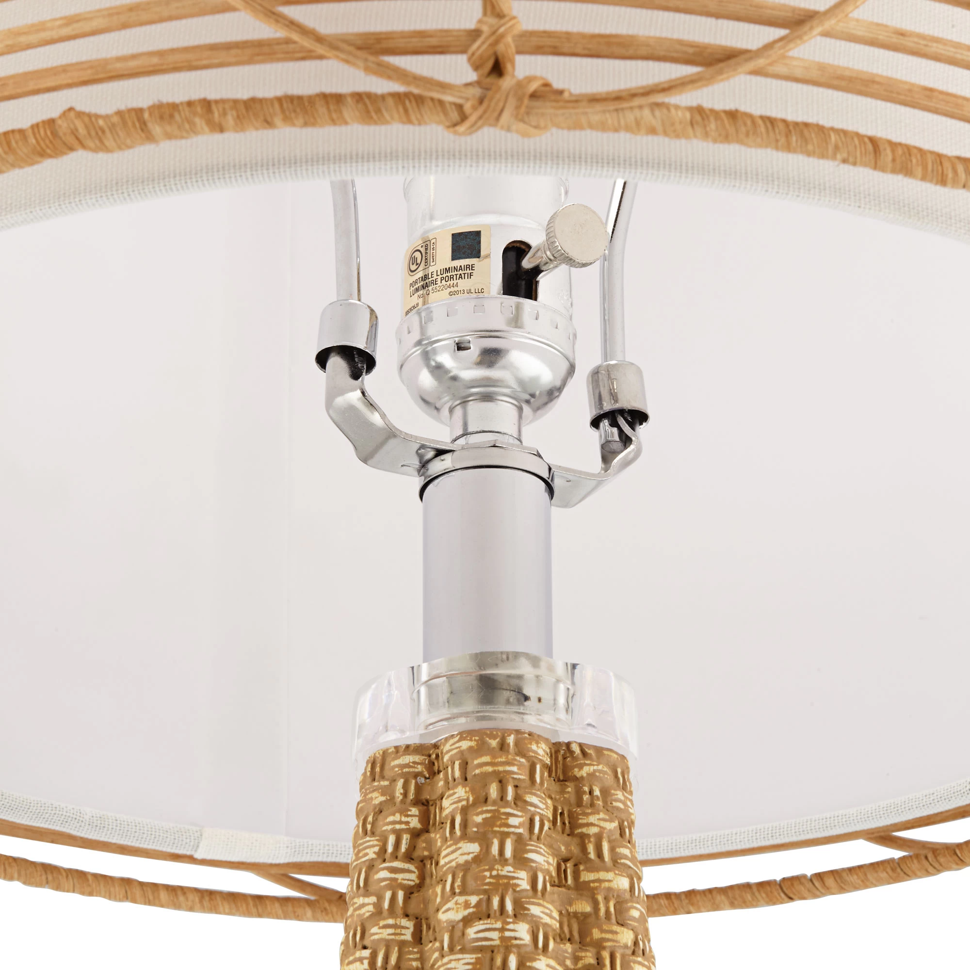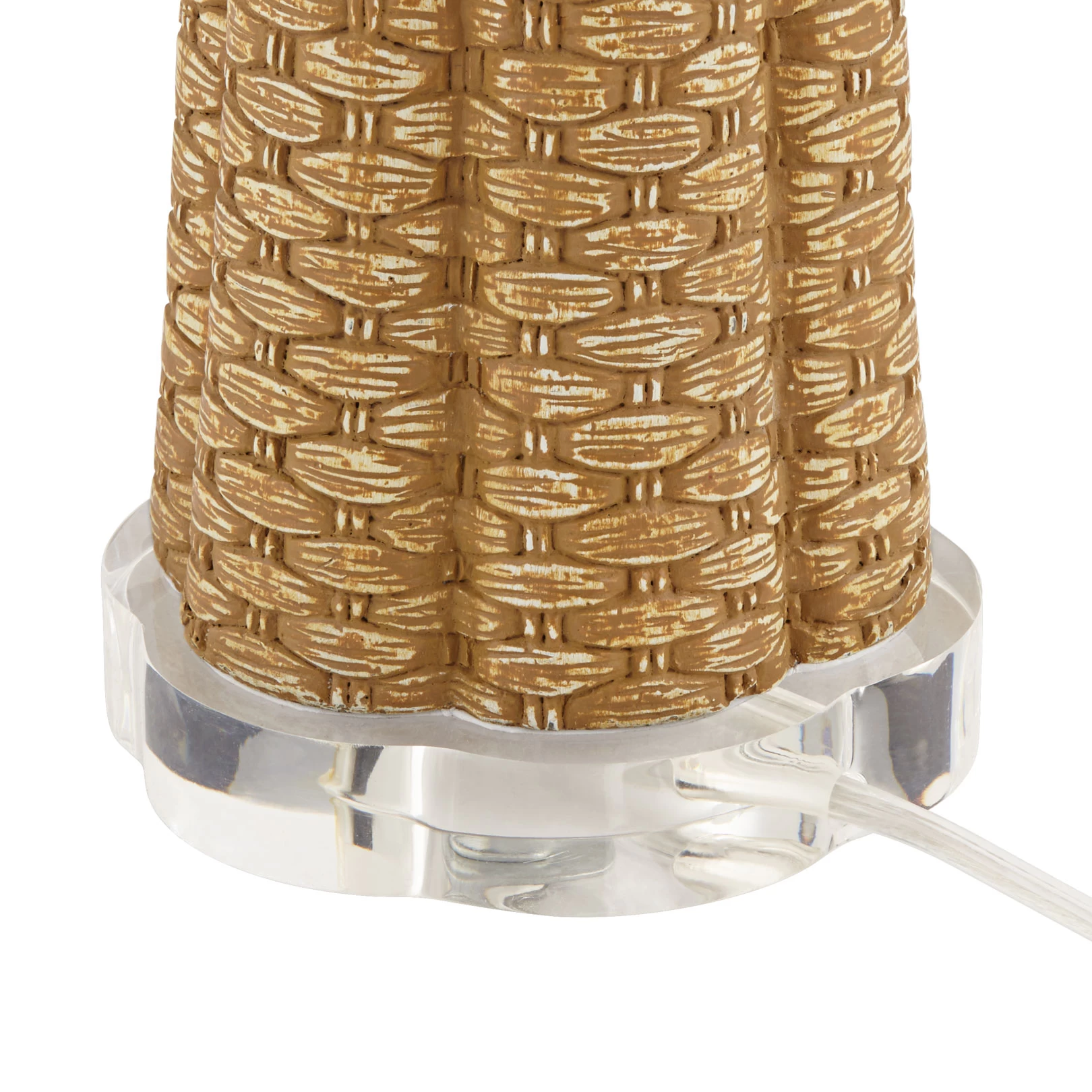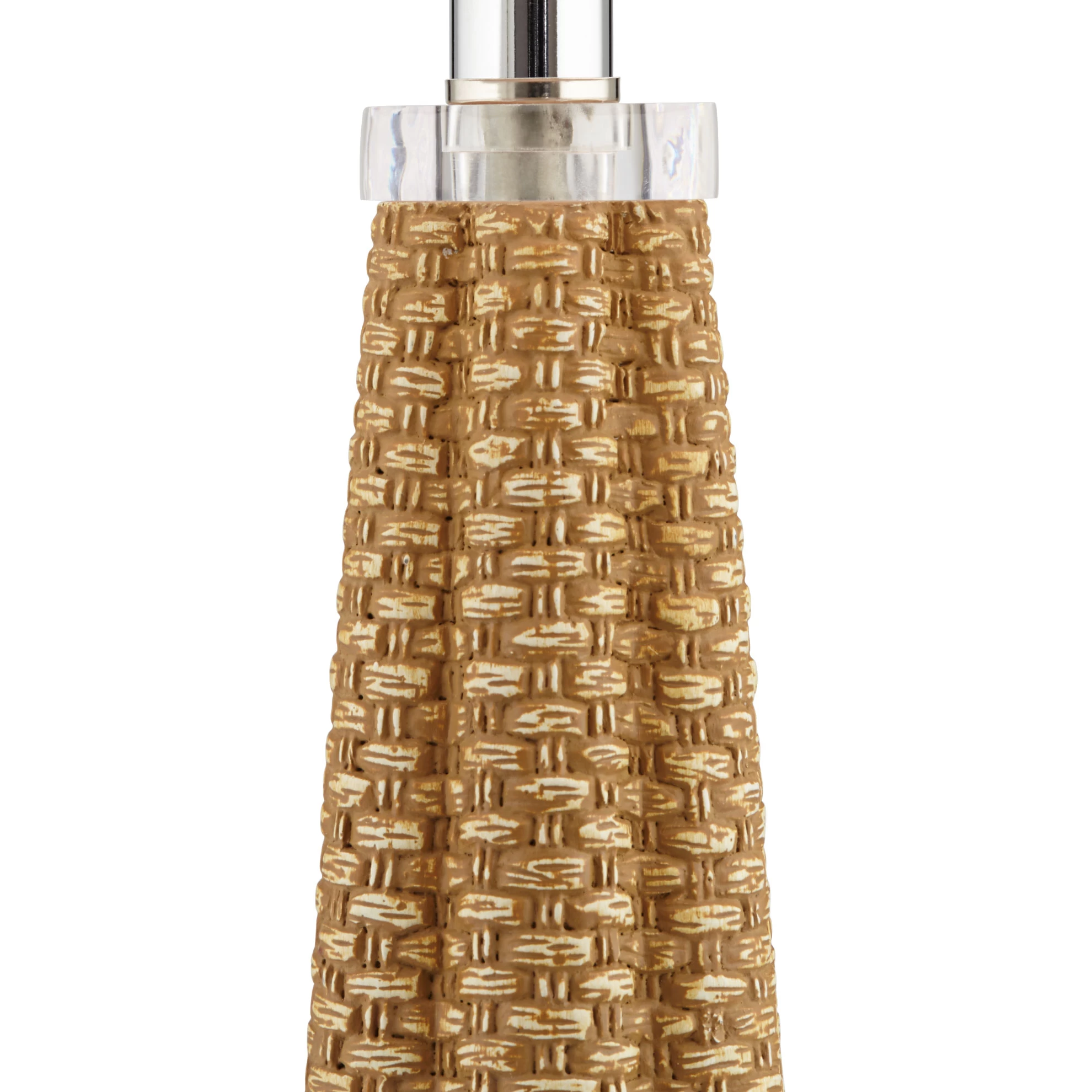 The Kaden Table Lamp brings a coastal flair to your space with a resin body in a faux rattan finish. Woven rattan circles a fabric shade in an intricate pattern, and a crystal foot adds an elegant accent. On/off switch located on socket.