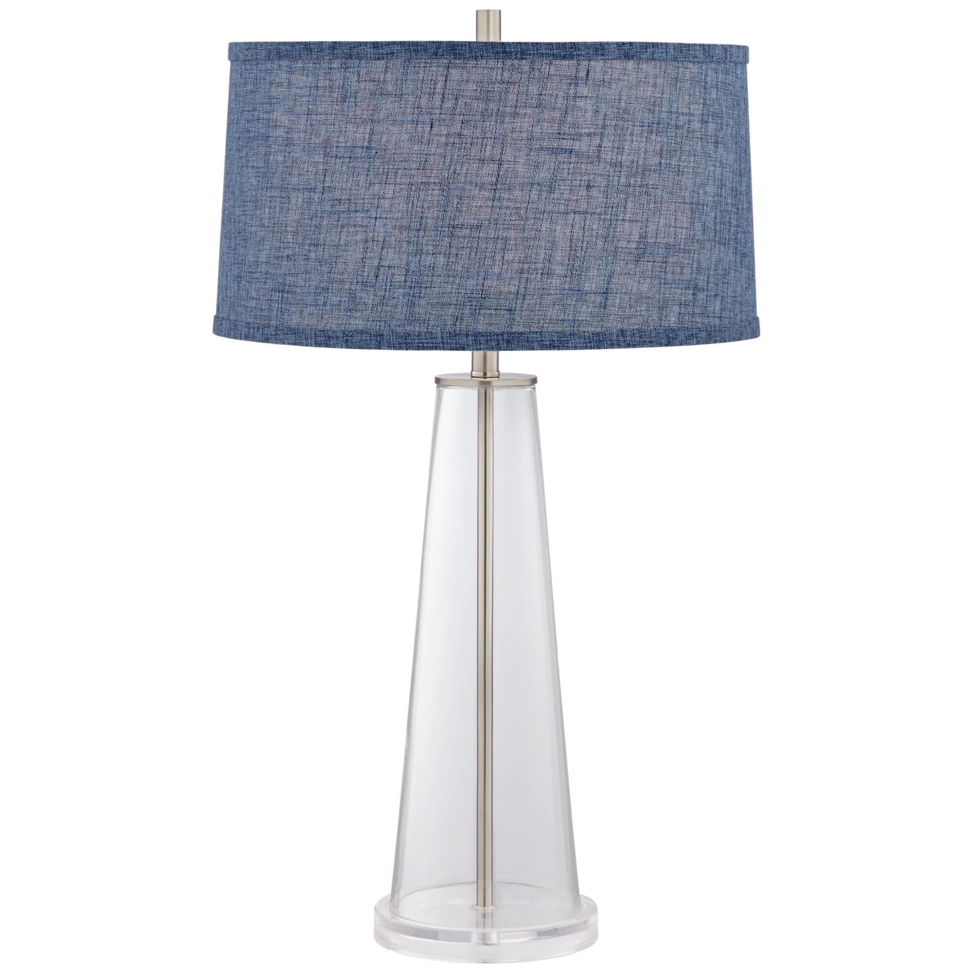 A denim blue drum shade adds a playful, color-rich touch to this contemporary table lamp. It boasts a conical base crafted in clear glass and resting on slightly wider disc for added stability. The shade is lightly textured, adding to the casual look and feel in imparts.
