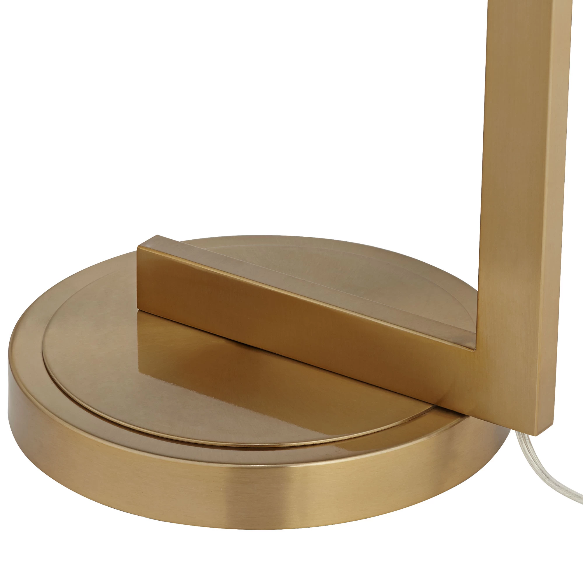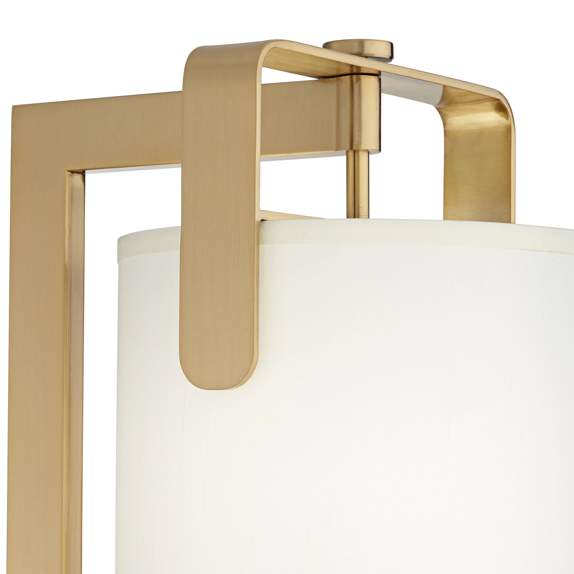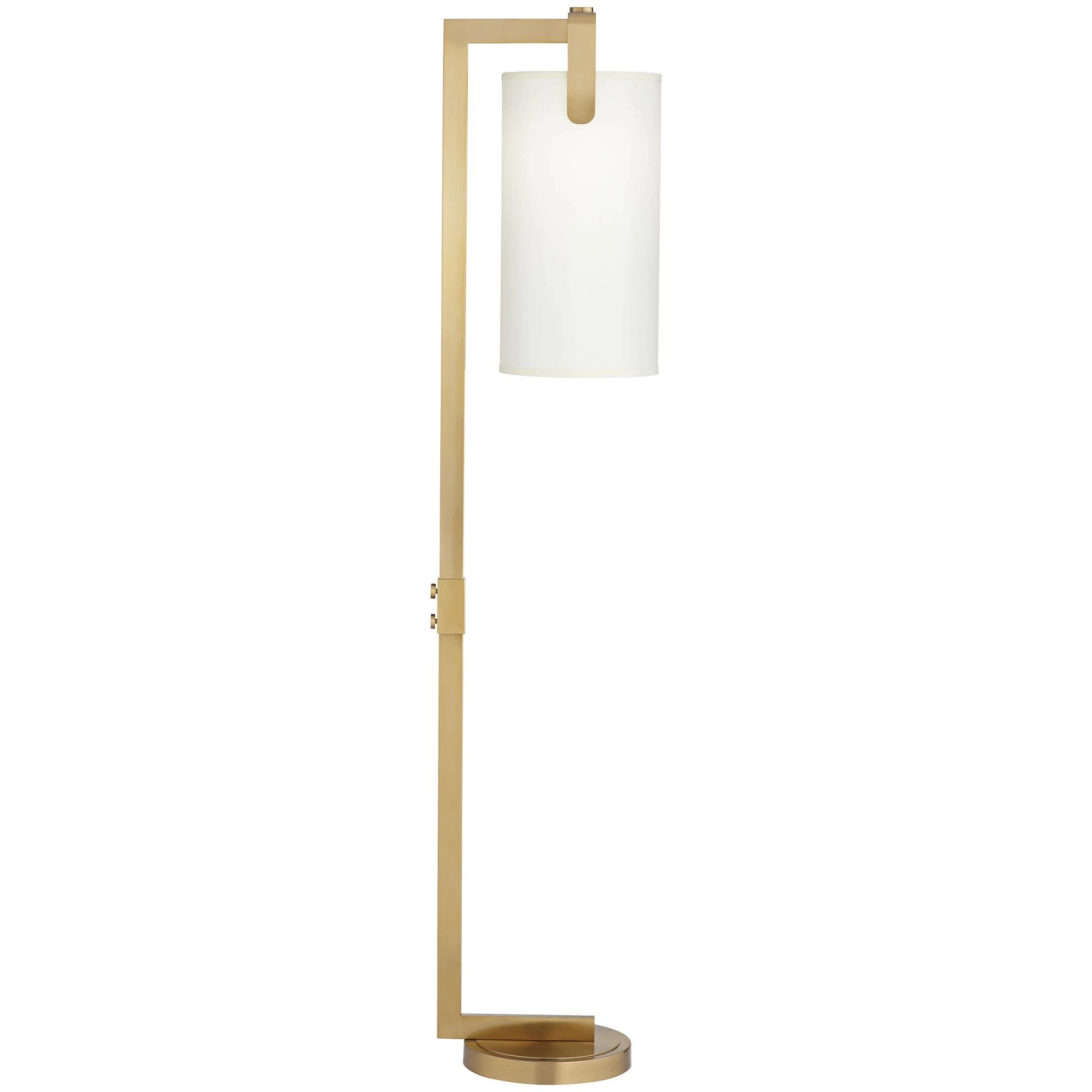 The contemporary Kinzie Floor Lamp has a sleek and minimal look that can work in many room scenes. Kinzie sports a metal downbridge construction with a warm gold finish and faux silk cylinder shade. On/off footswitch located on cord.