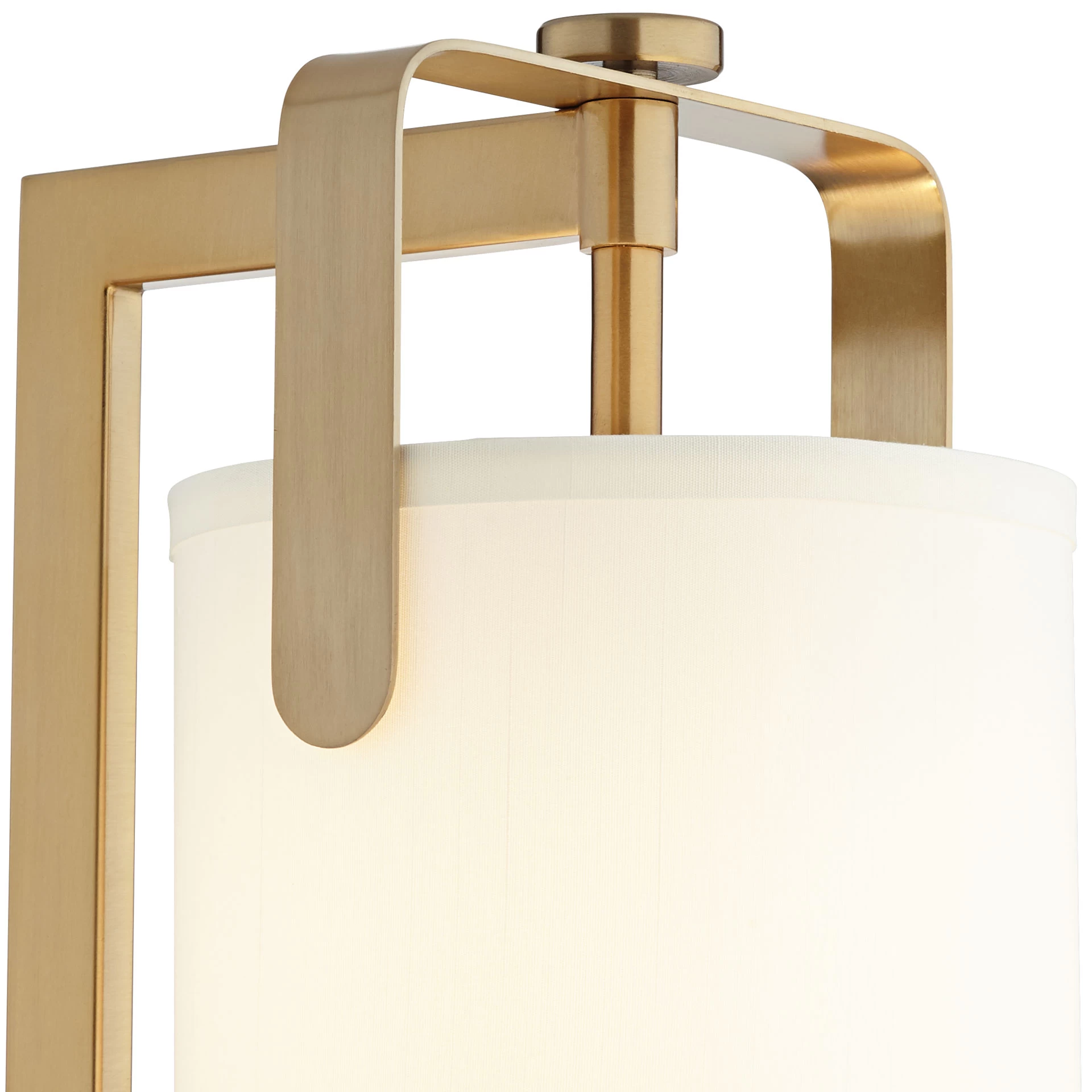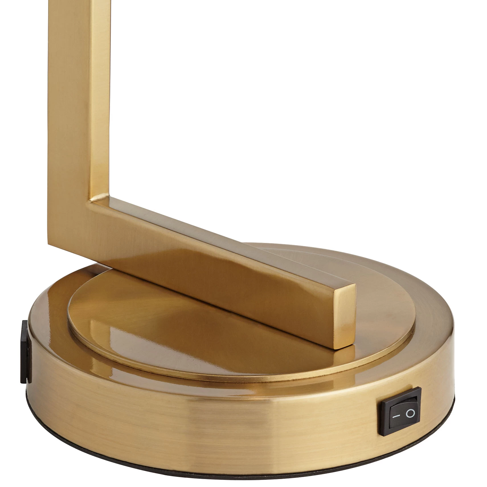 The contemporary Kinzie Table Lamp has a sleek and minimal look that can work in many room scenes. Kinzie sports a metal downbridge construction with a warm gold finish and faux silk cylinder shade. For additional function, a USB port is included on the base, along with an on/off switch.