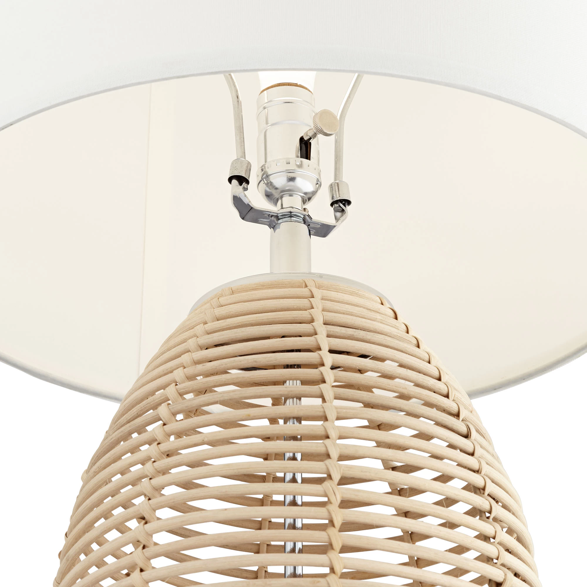 The Knoll Table Lamp blends nature and art with a rattan basket body. An off-white linen shade and petite base offer symmetrical style that makes this lamp a perfect fit in casual coastal living spaces. Chrome finished metal accents add a contemporary touch.