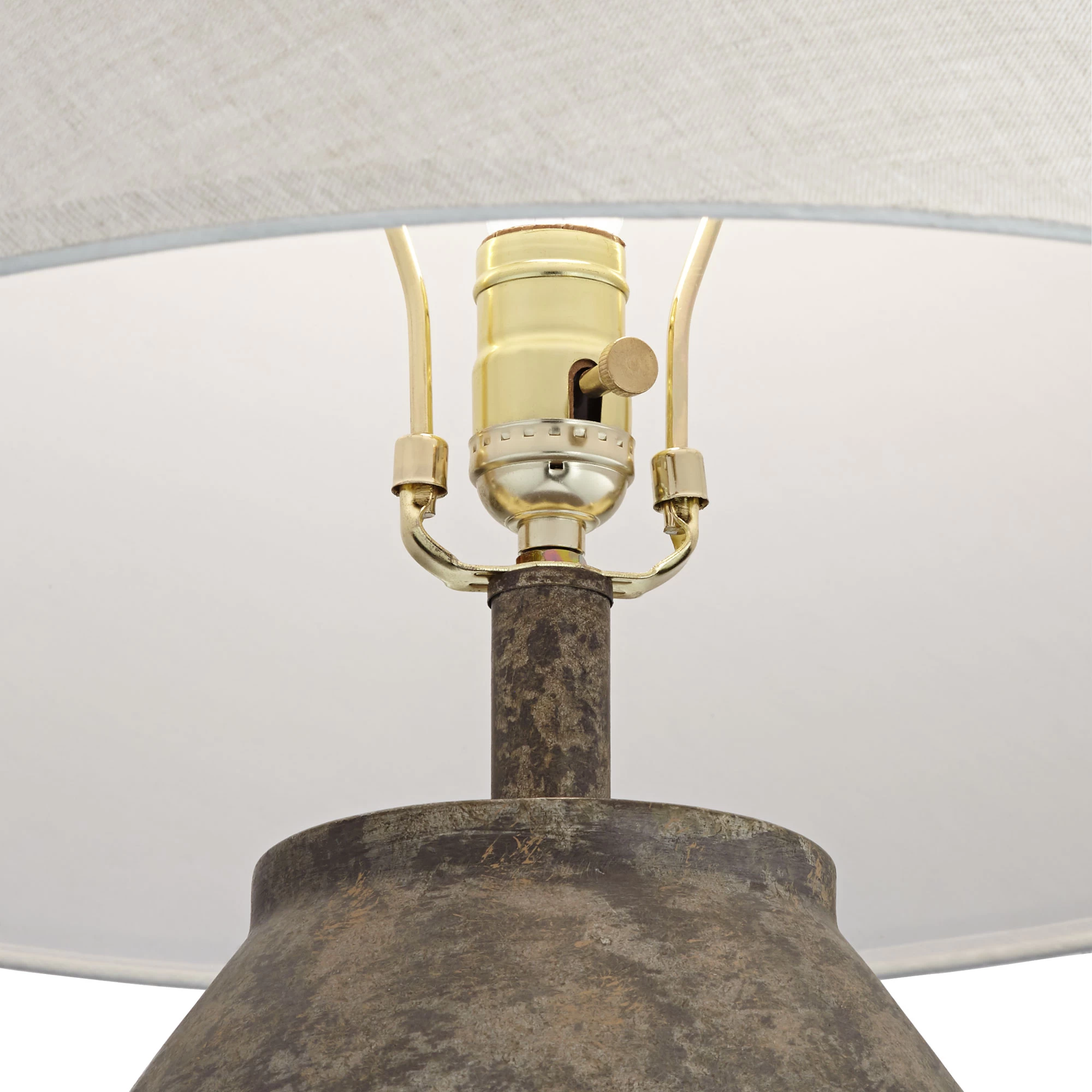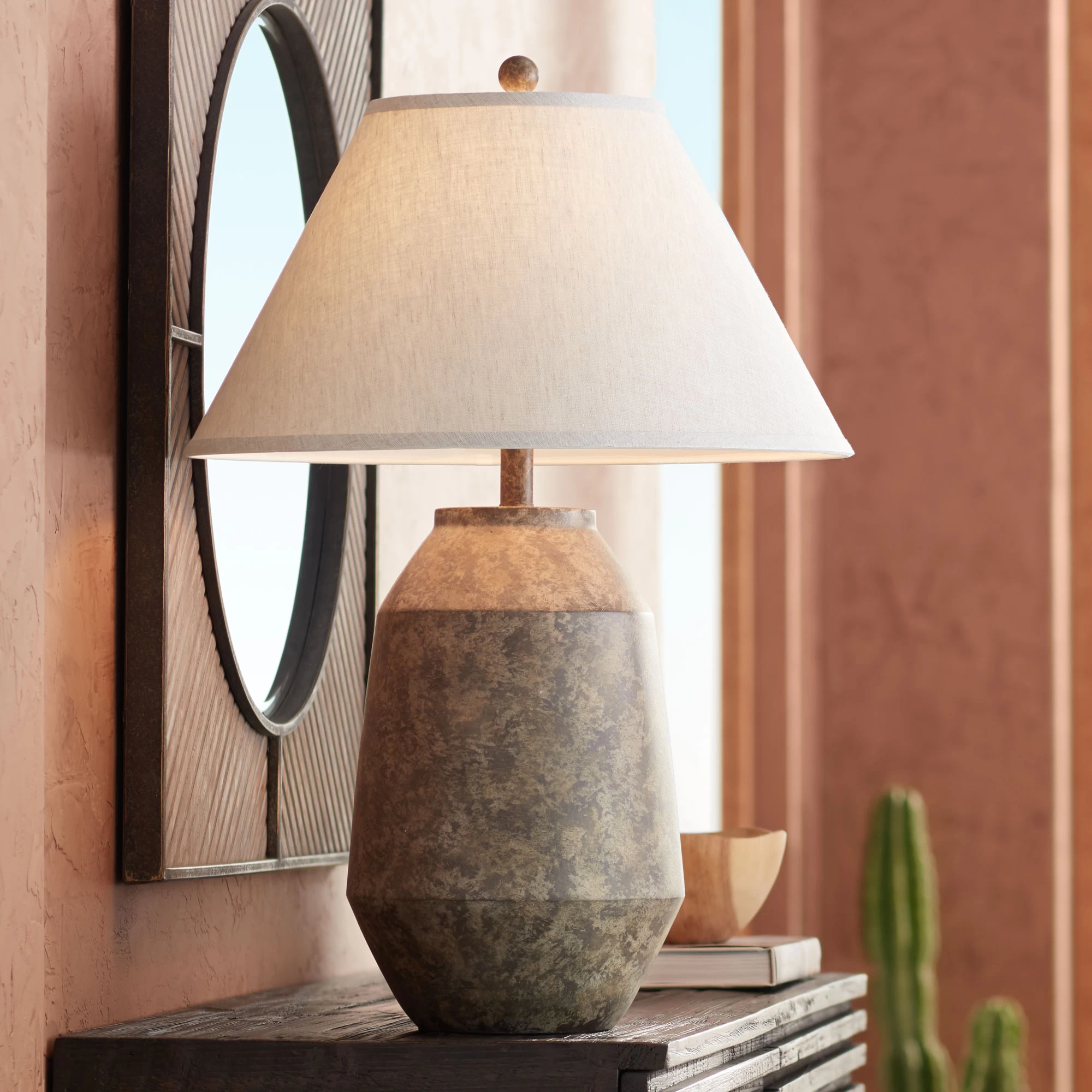 The Lagos Table Lamp makes a tasteful accent in a transitional space with its engaging geometric shape and muted color scheme. The resin base is finished in a Dark Terracotta finish and topped with an angled white linen shade. On/off switch located on socket.