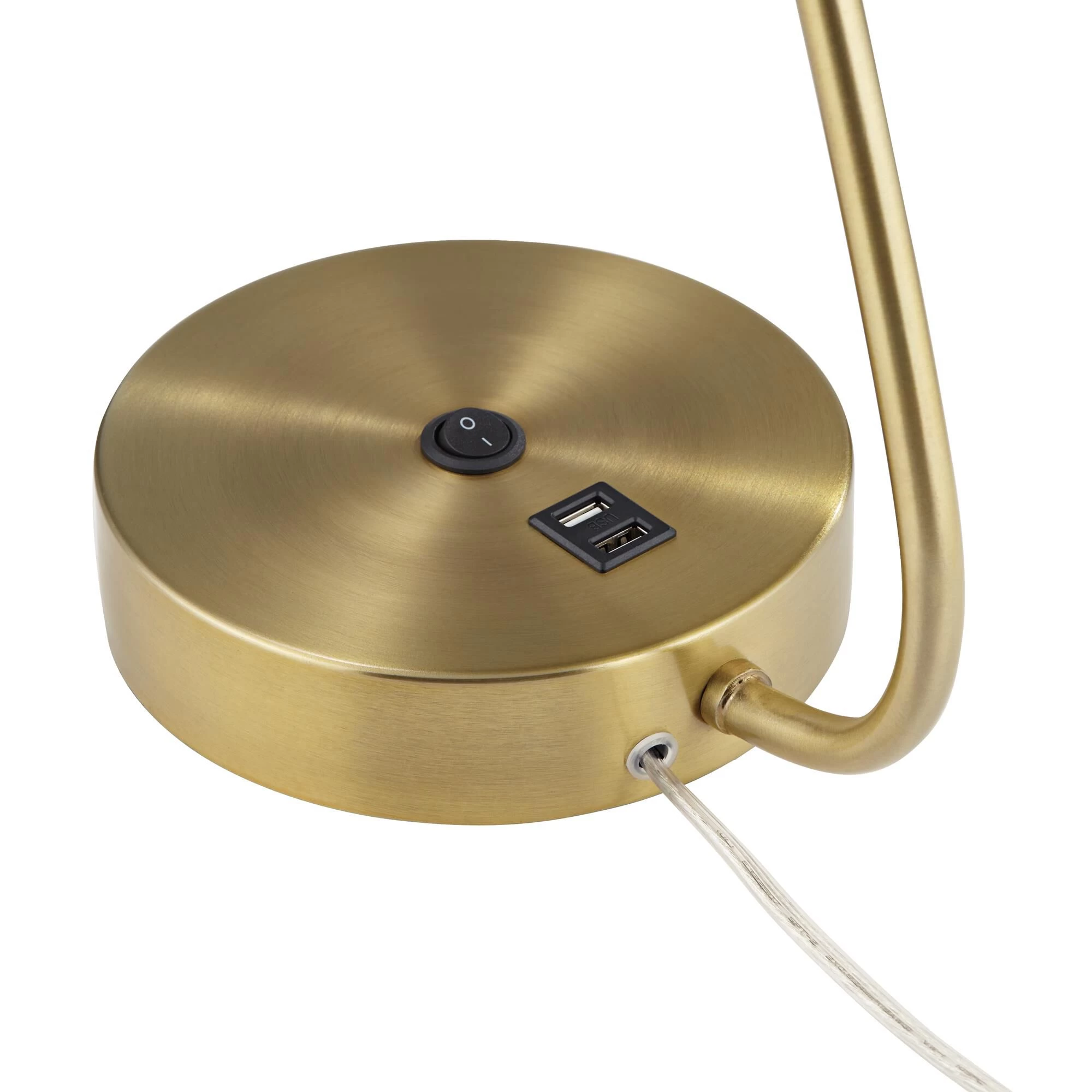 An extra outlet in the base of this contemporary metal desk lamp adds convenience and functionality to a stylish presentation. The antique brass finish lamp features an angled silhouette that casts task lighting over any surface. A rocker switch on the round base is easily accessible.