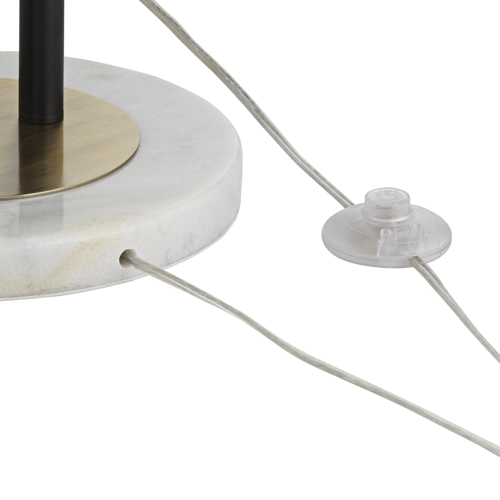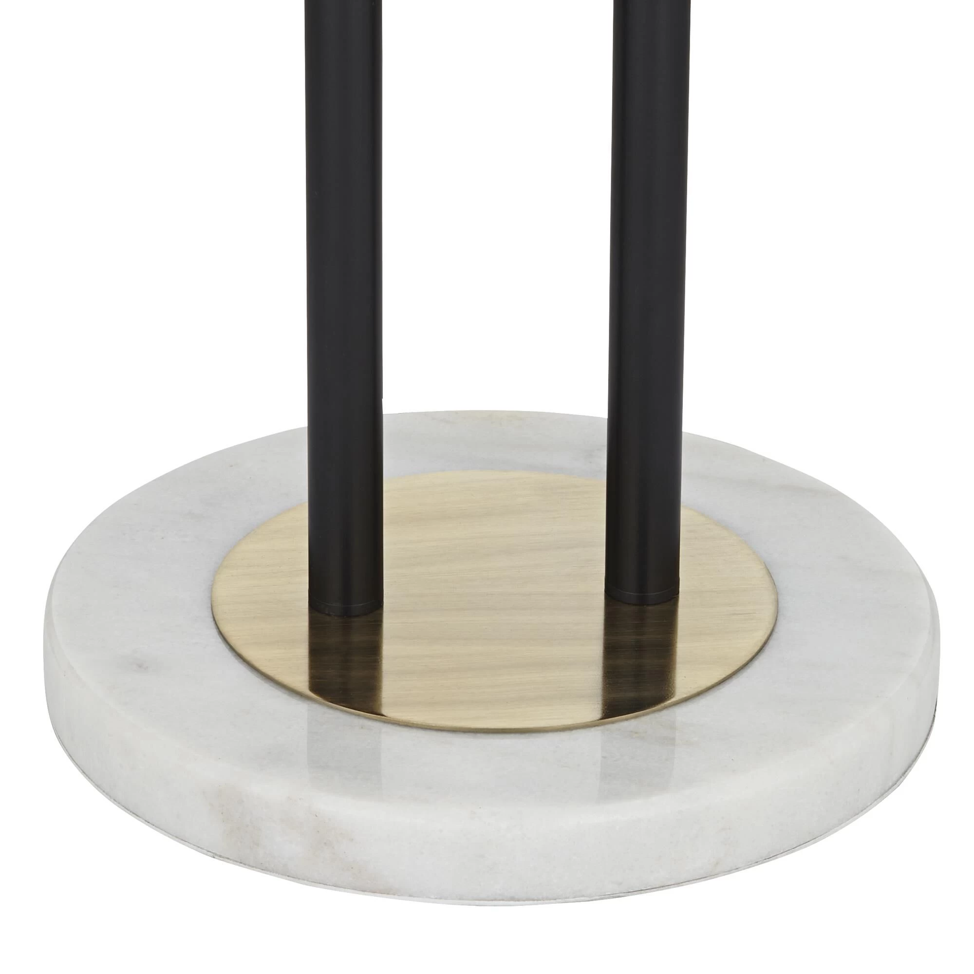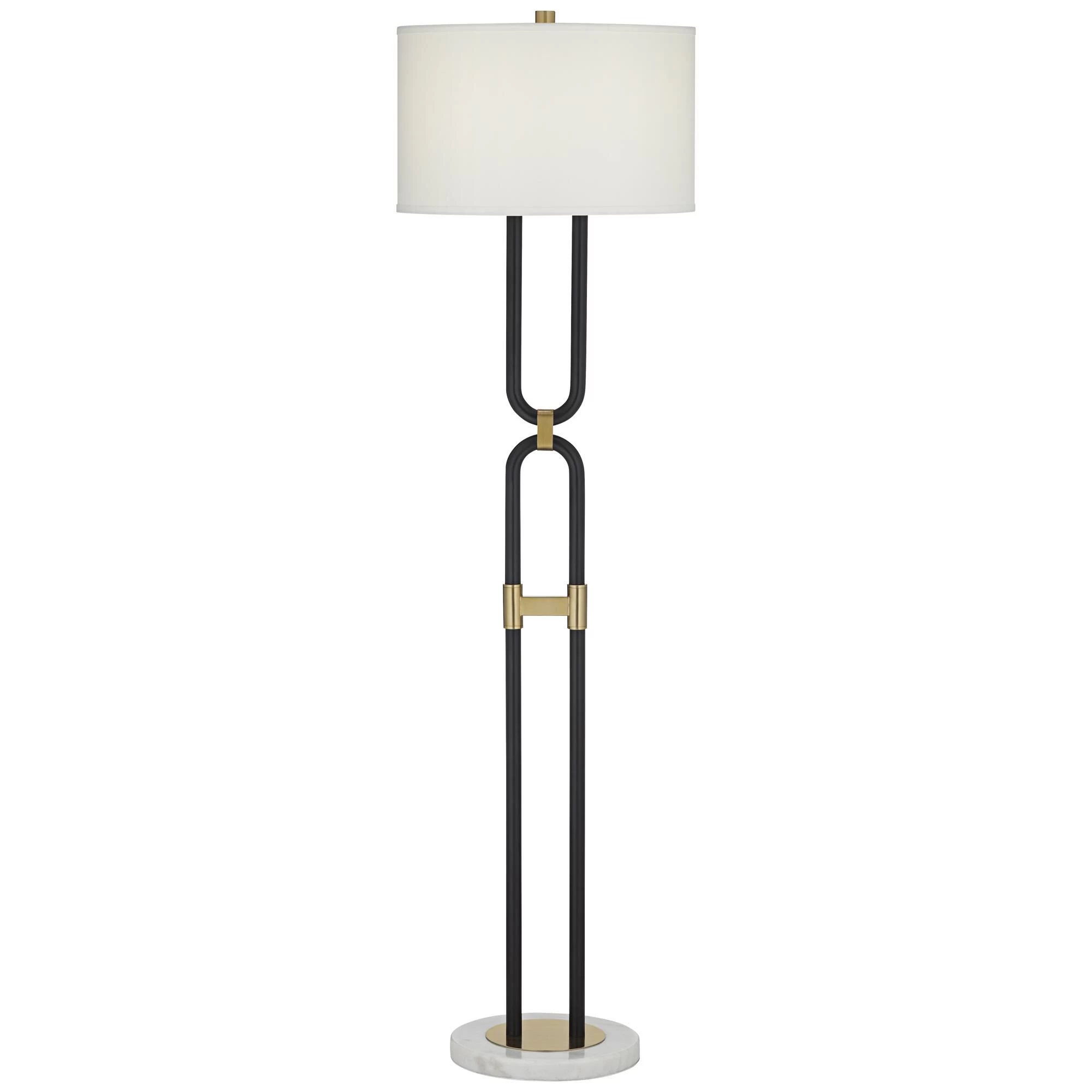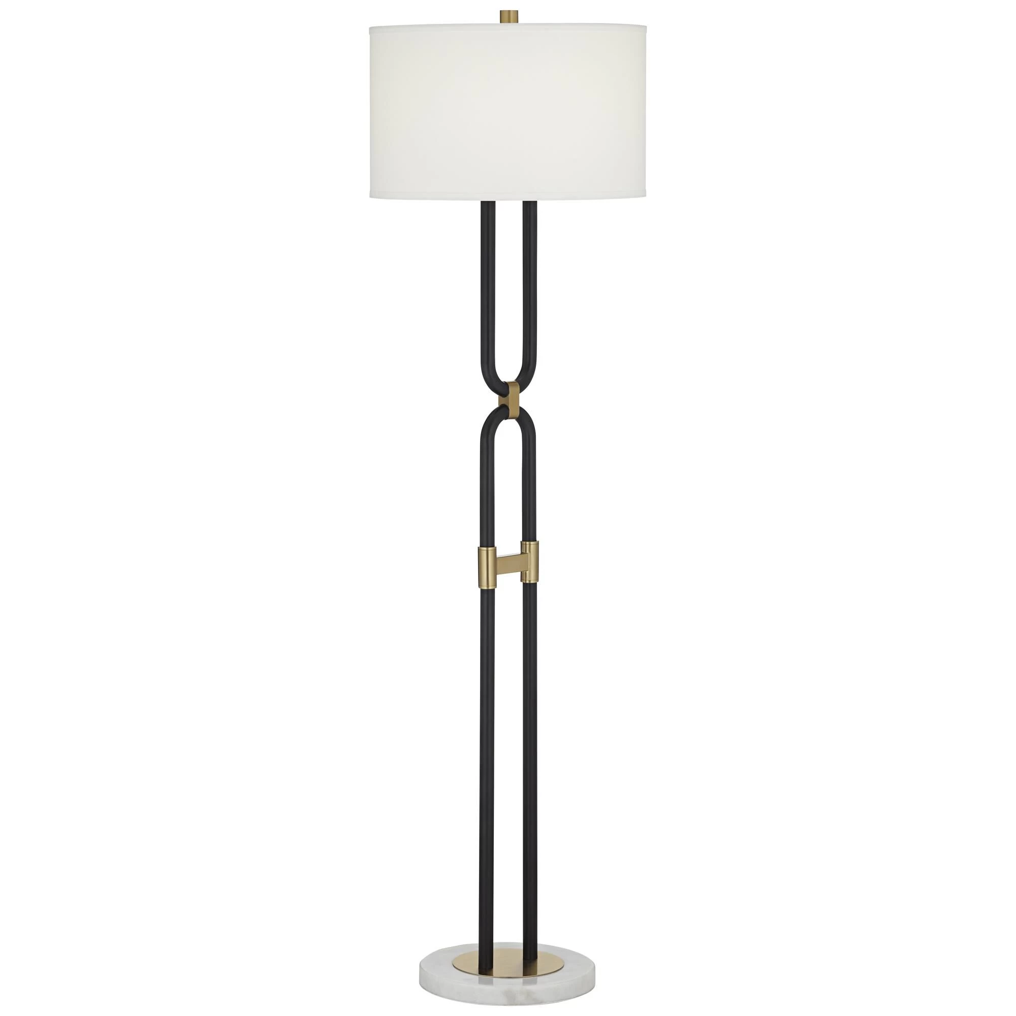 Industrial influences offer a magnetic appeal to this tailored double U floor lamp. A black metal frames join together in acrobatic fashion, boasting a sleek modern silhouette. Striking white marble and linen textures offer classic touches sure to please the eye.