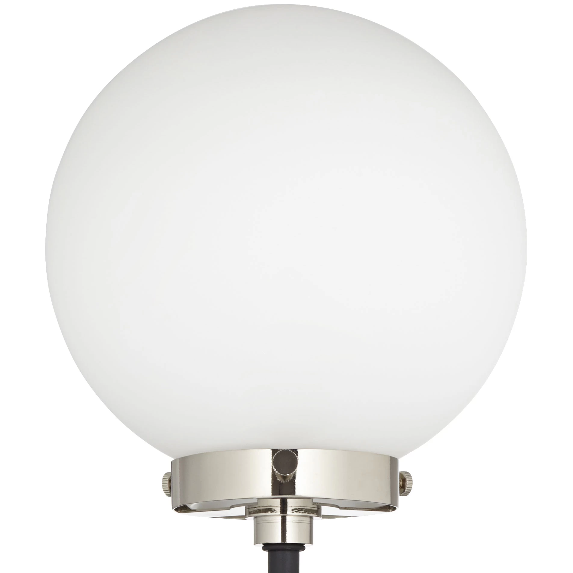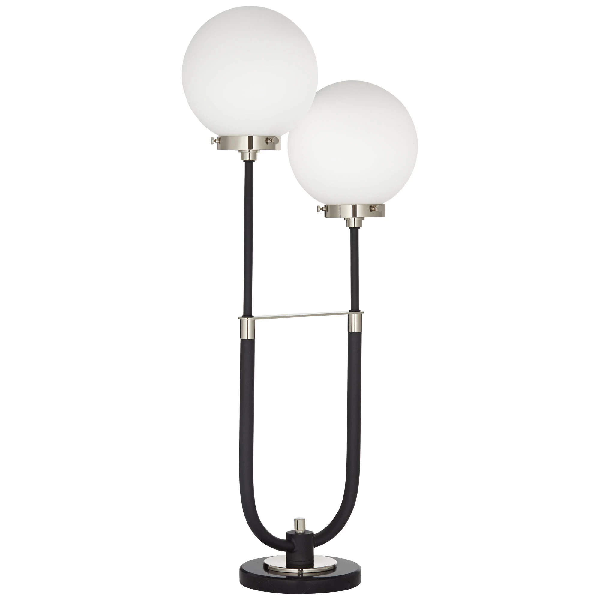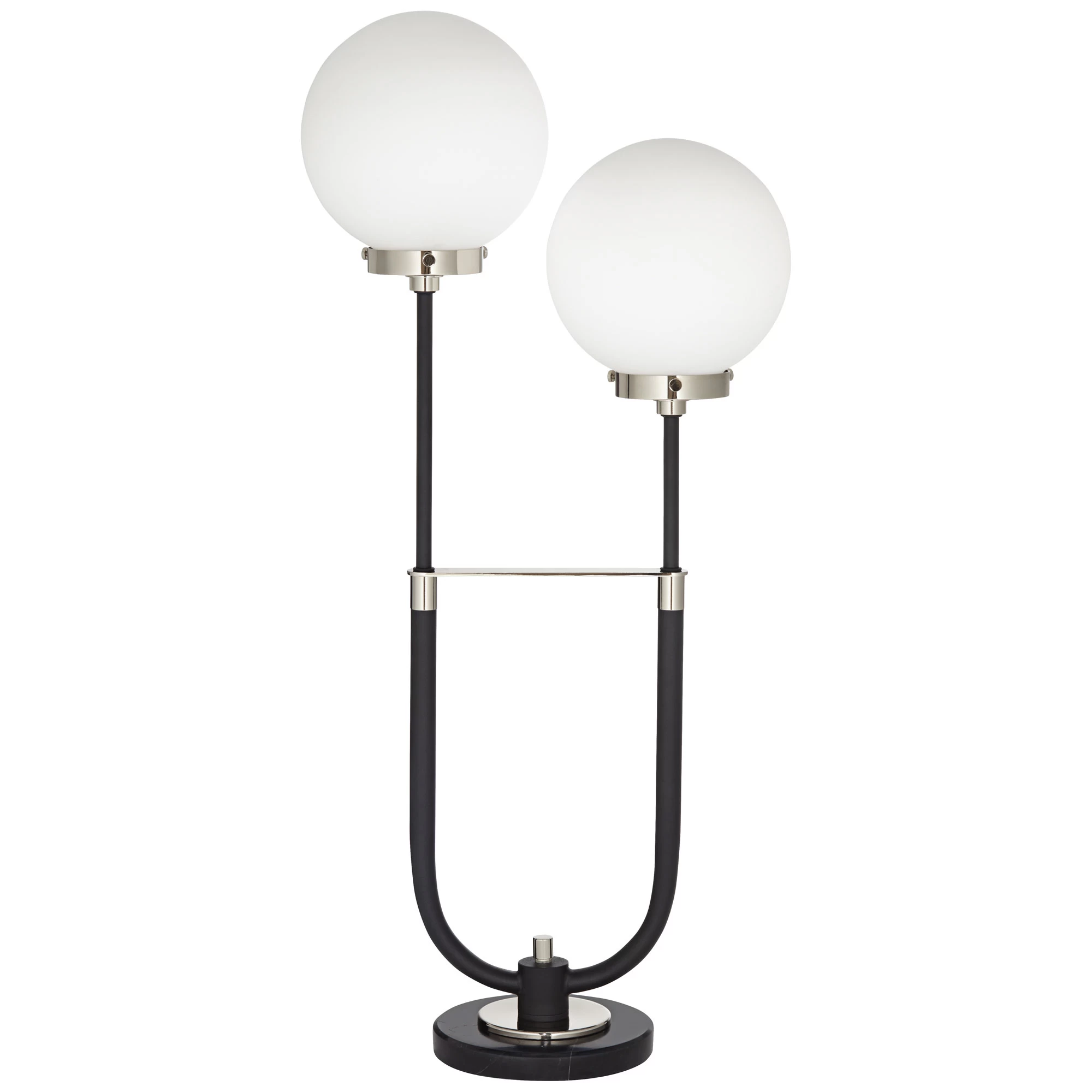 Topped with two glass globes, the Madison Park Table Lamp glows with classic elegance. Two sleek curving stems with offset heights rise from a round base. Light up a mid-century inspired space with this artfully appealing piece. On/off switch on base.