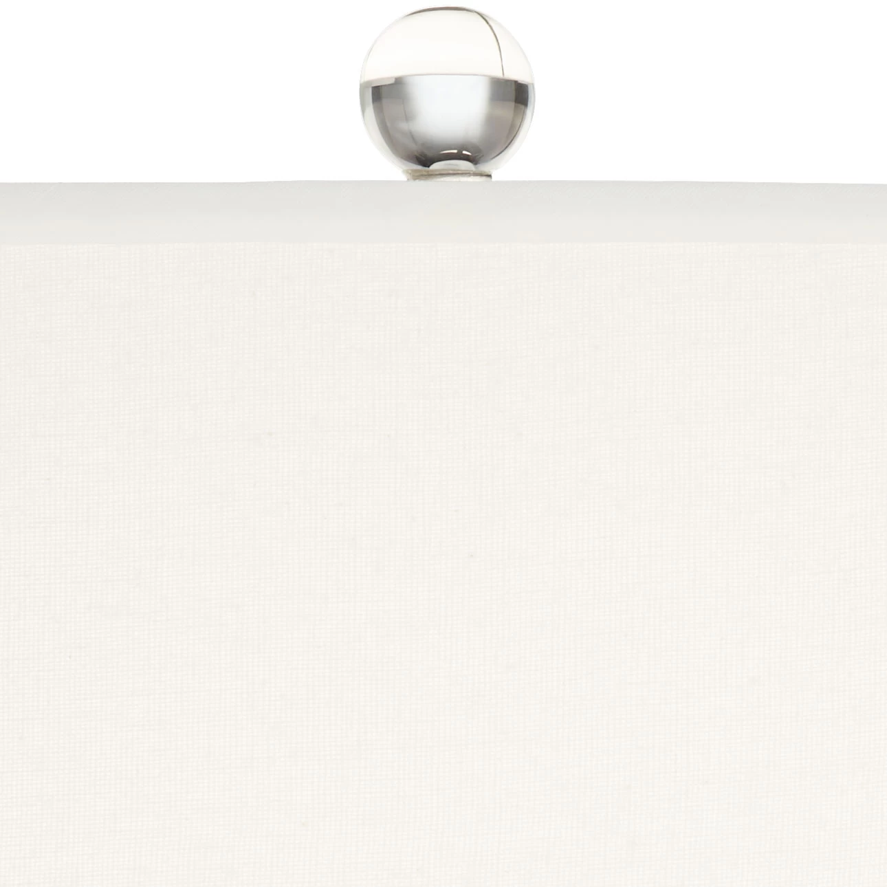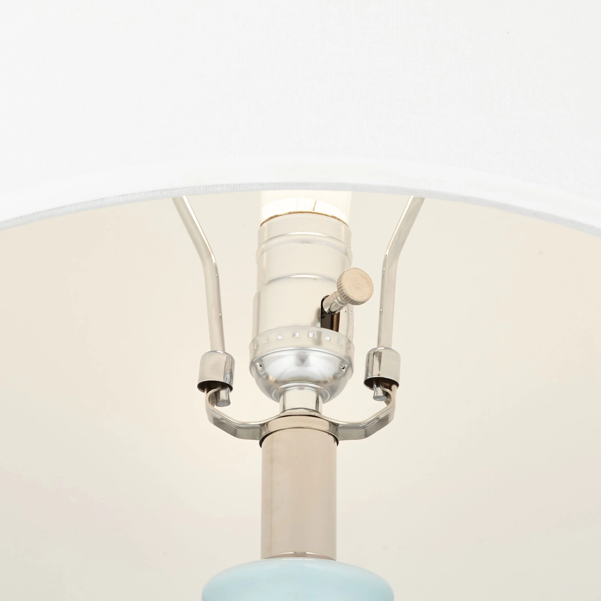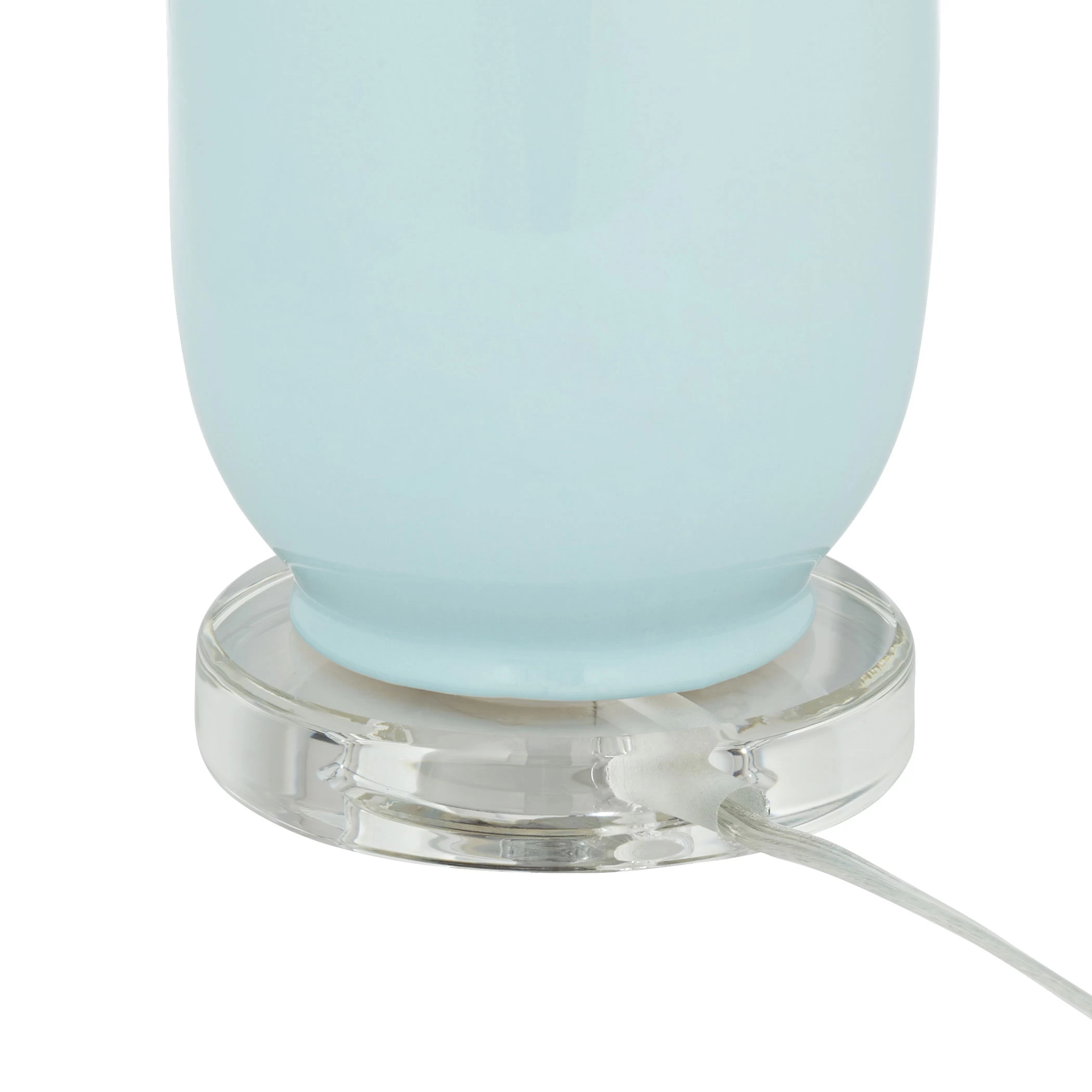 The Maeve Table Lamp – Set of 2 includes a pair of table lamps, perfect for flanking a sofa or bed in a transitional space. The vase shaped ceramic base is finished with a glossy light blue for a burst of color. A tapered linen shade and ball finial top the piece. On/off switch on socket.