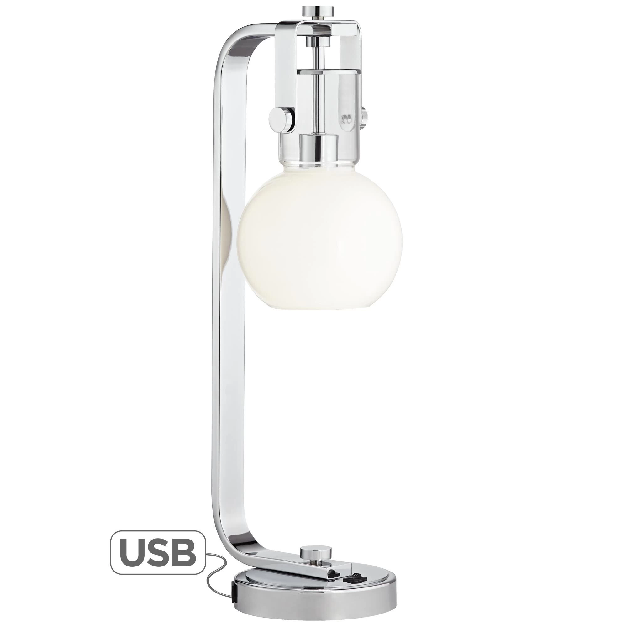 A Mid-Century modern downbridge table lamp is updated for the contemporary home. It features a useful USB port perfect for charging devices in its base. A polished chrome finish and a glass globe shade combine to create a rich, refined look. Add glowing ambiance to an end table or nightstand.