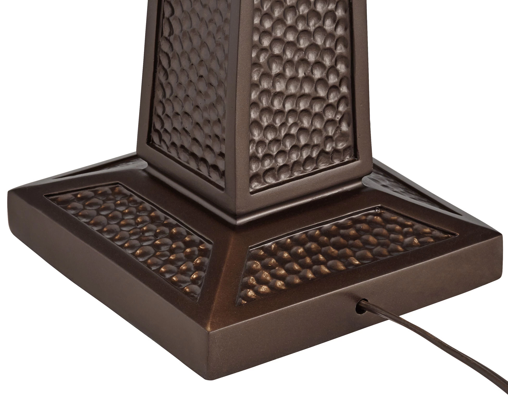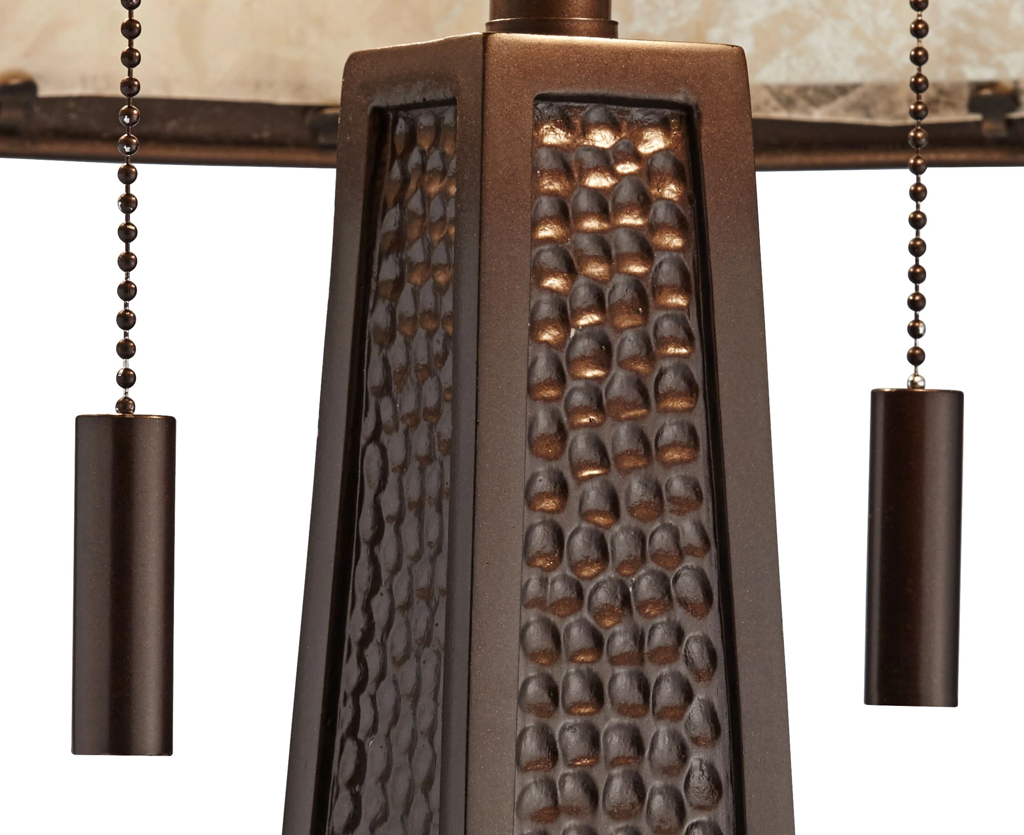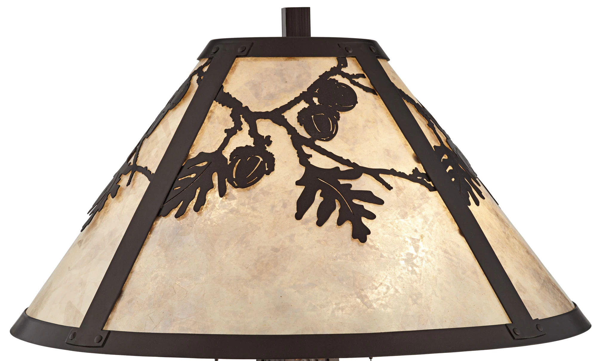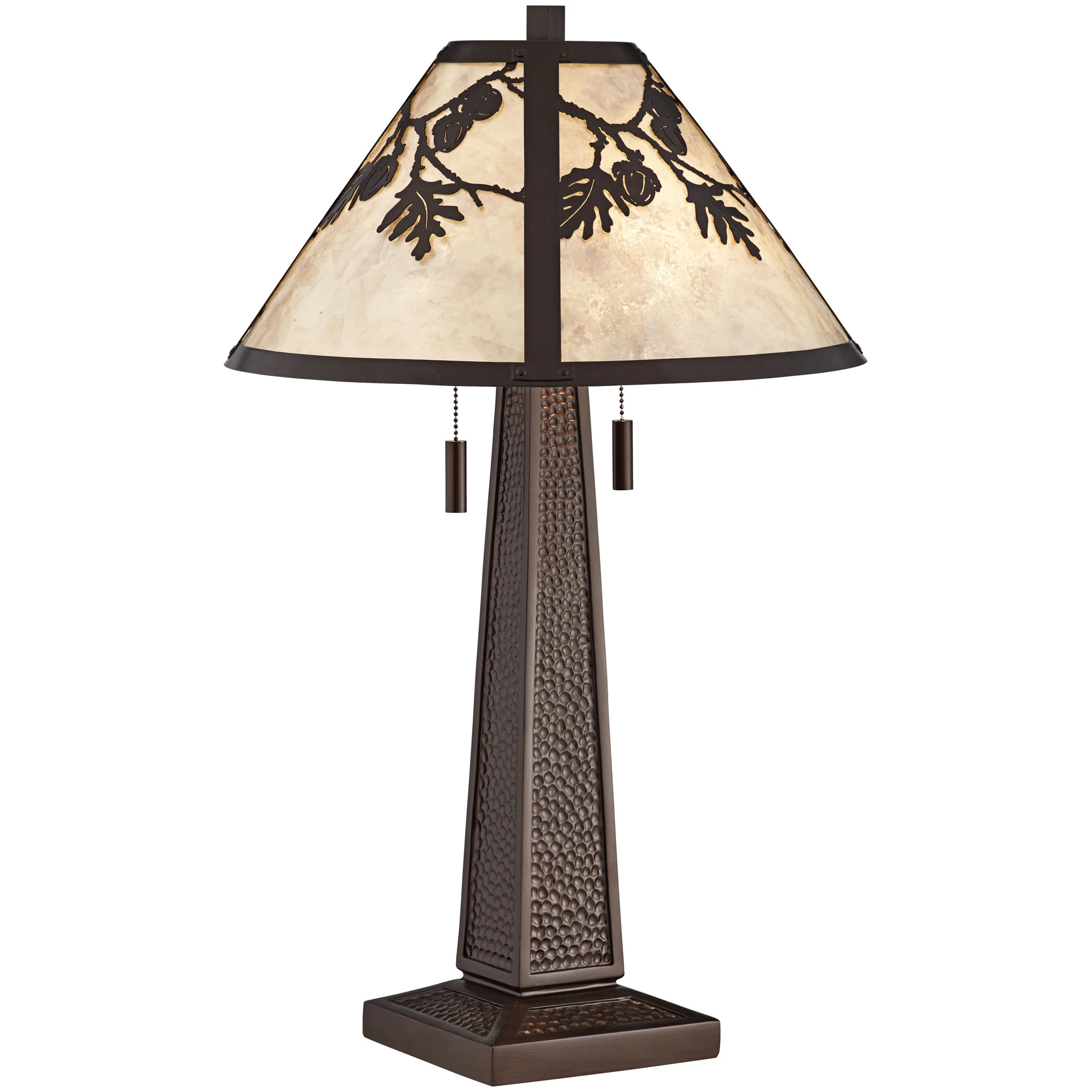 The warm and welcoming Melville Table Lamp is a perfect addition to a rustic den or living room. A mica shade is adorned with acorn and branch decorations that boldly stand out when both lights are switched on. The body of the lamp is subtly tapered and covered with small indentations to add a textural accent. On/off pull chains on the sockets allow for independent operation of each bulb.